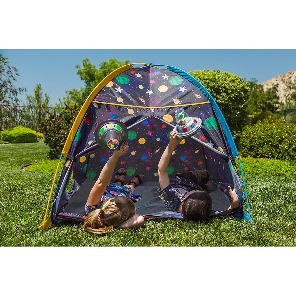 Description Let your imagination take you into space with bright shining stars that glow in the dark. With a waterproof floor, this tent can be used both indoors and out. Create a multi-sensory environment anywhere! Dimensions: 48 x 48 x 42 inches.Includes: Glow in the Dark Stars Tent