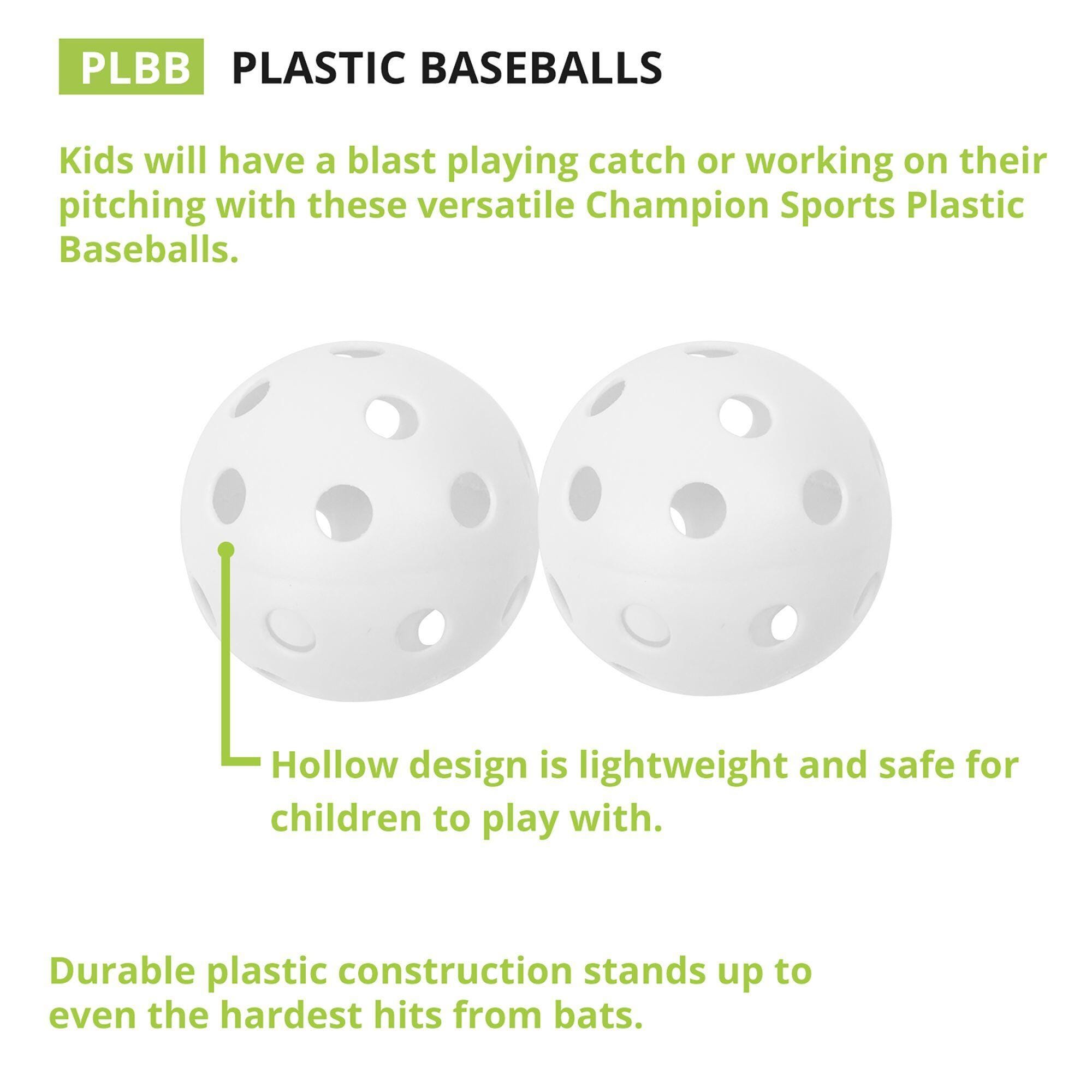 The White Plastic Baseballs from Champion Sports are perfect for introducing beginners to the exciting sport of baseball! They are made of sturdy plastic for enhanced durability and can be used for a range of activities, including baseball, catch, practice drills, paddleball, and more. The balls have a 9-inch diameter and are designed for safety and hours of fun! This set contains 12 plastic baseballs.