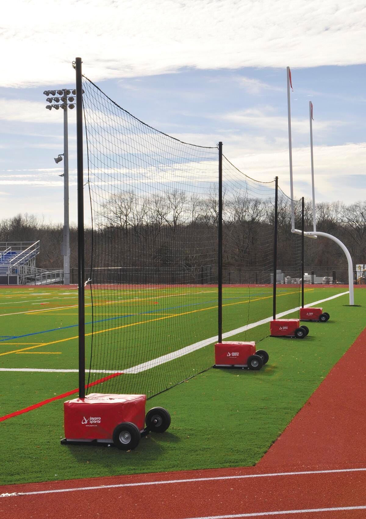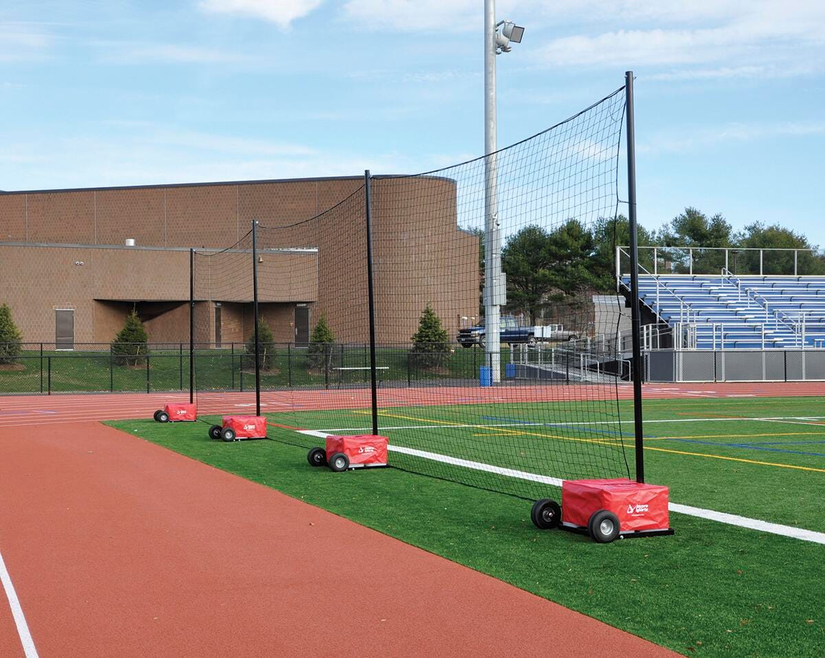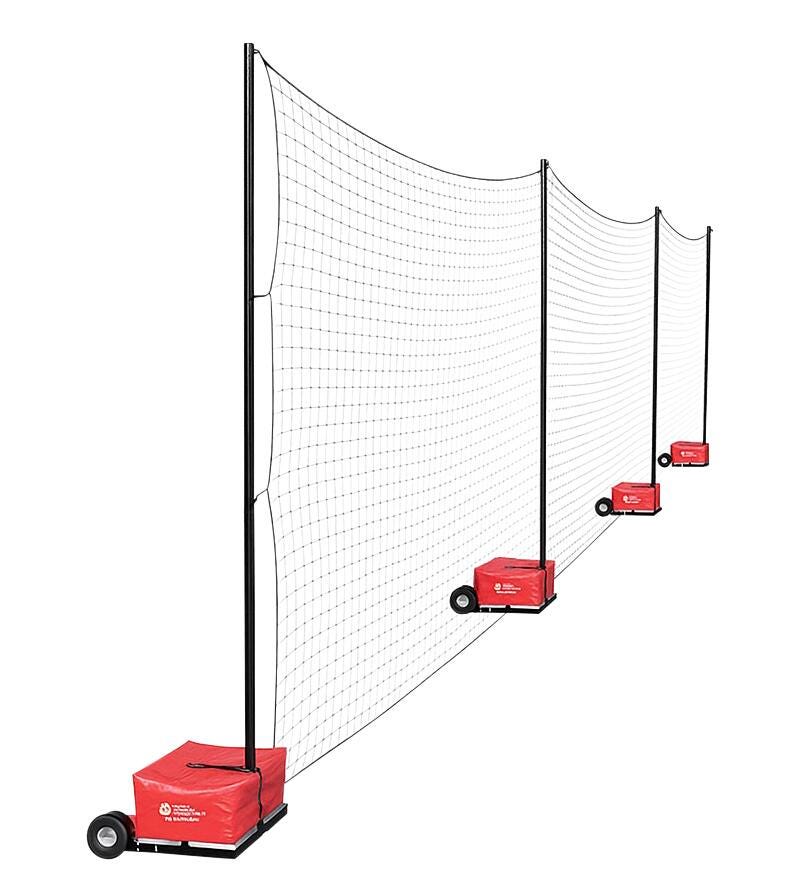Description The Portable Field Pro Net System is a perfect way to separate two activities on the same field or close to each other. Package included 4 black powder coated poles, 4 bases (each with a 5 gallon jug), 1-3/4 inch knotted nylon netting and 4 red vinyl base covers. The 60 feet of netting provides enough length and is 12 feet in height to ensure safety on each side of netting.