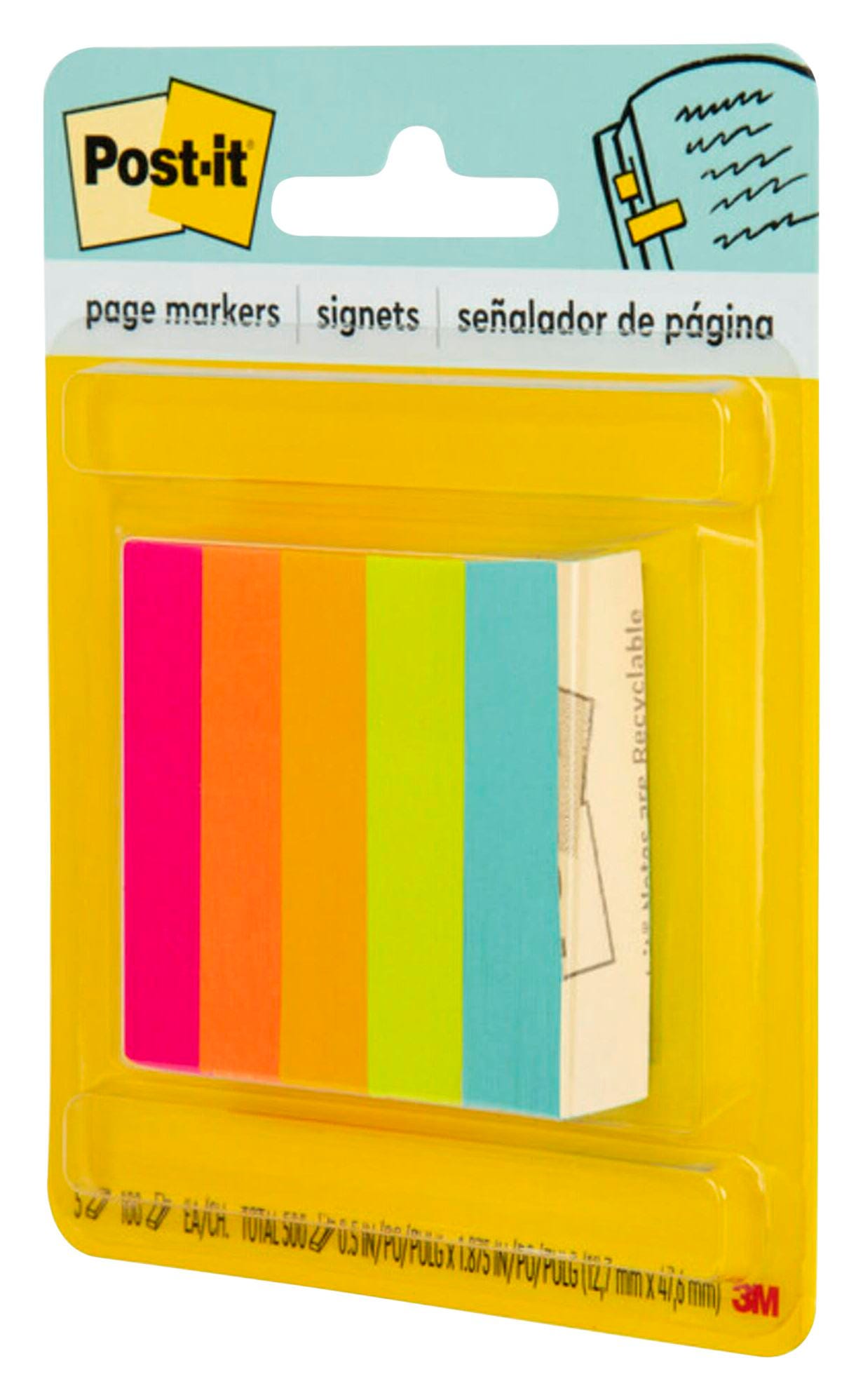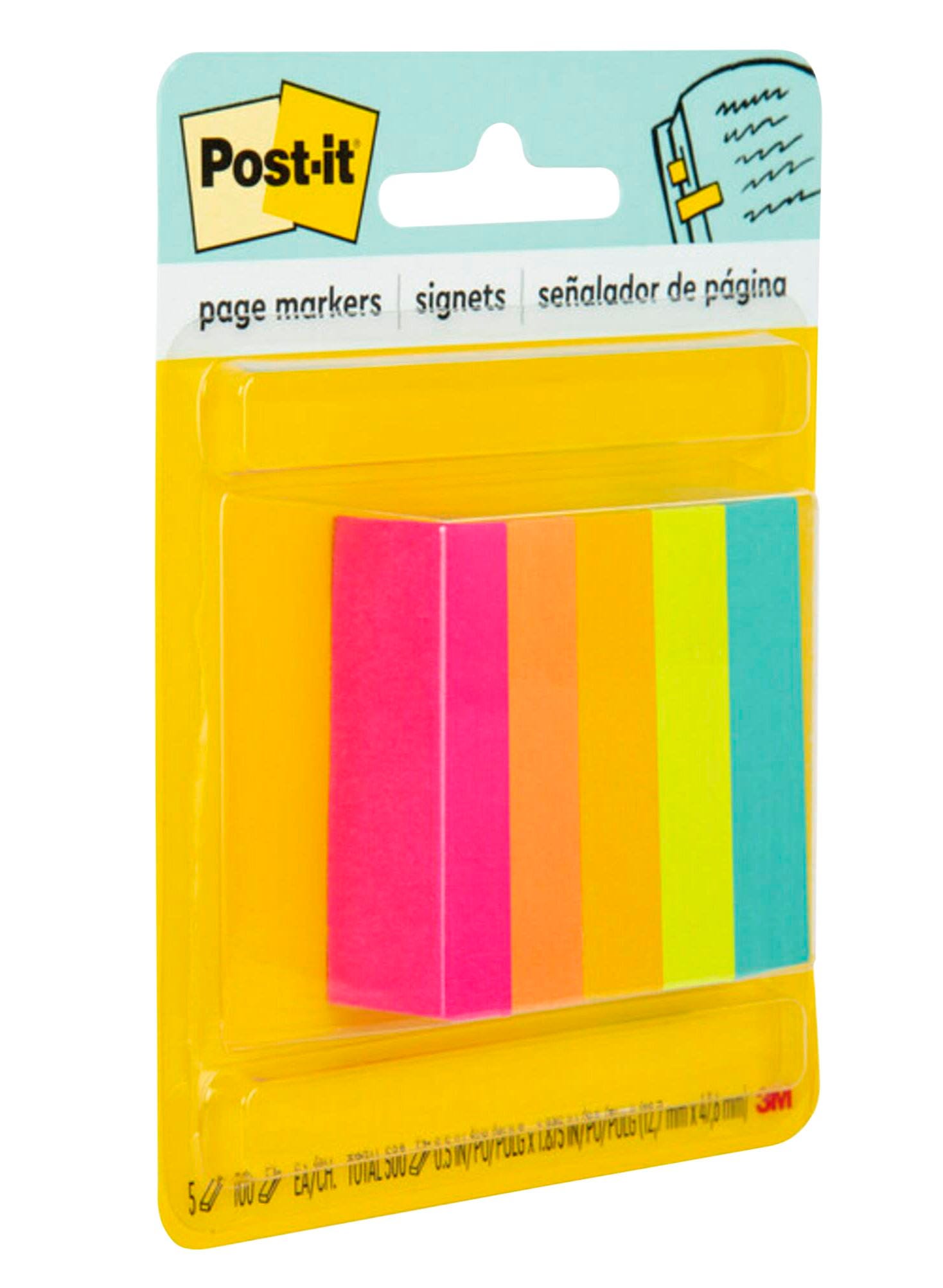 Post-it Page Markers, 1/2 x 1-3/4 Inches, Assorted Bright Colors, Pad of 100 Sheets, Pack of 5