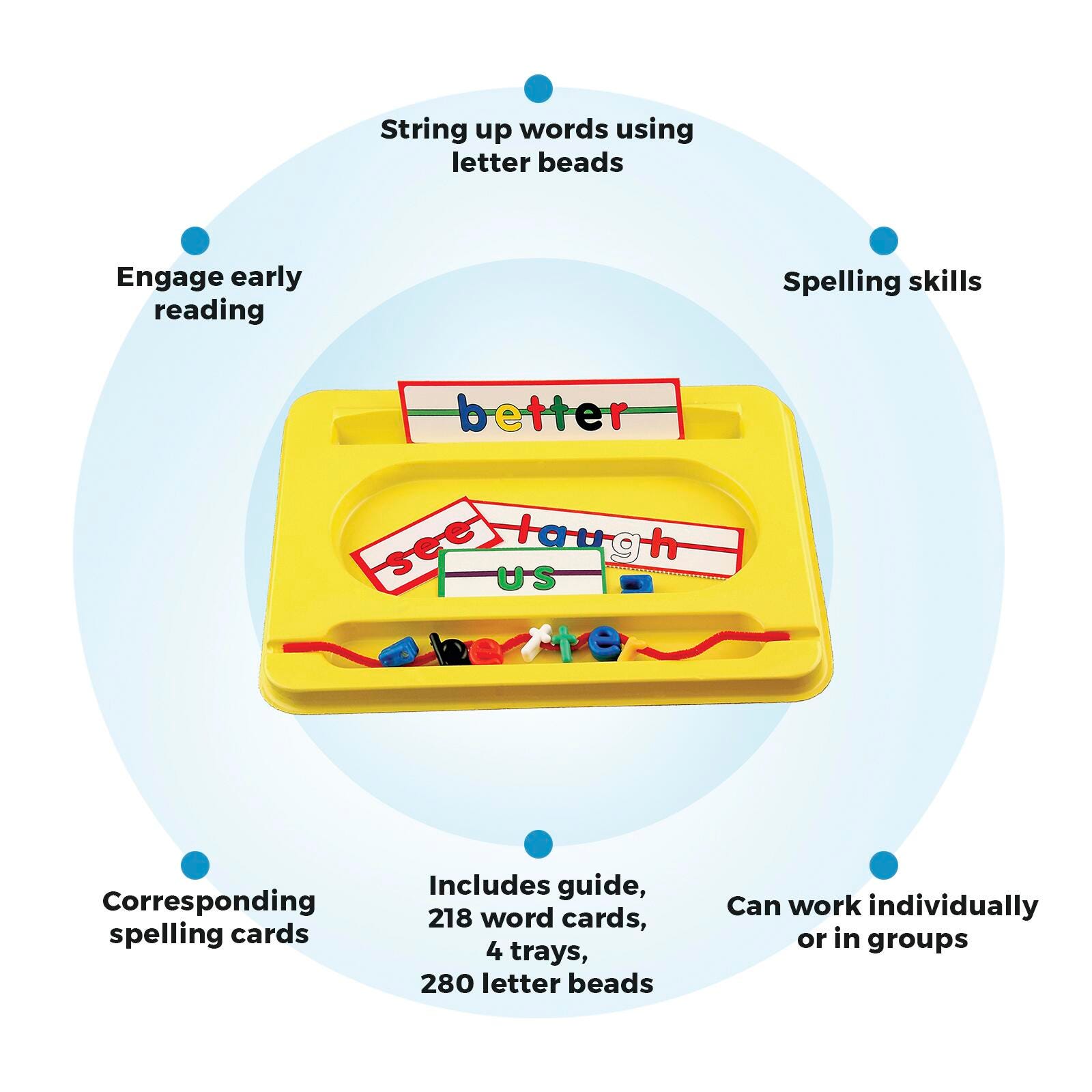 Includes: Guide, 218 Word Cards, 4 Trays, 280 Letter Beads, And 100 Chenille Craft Stems