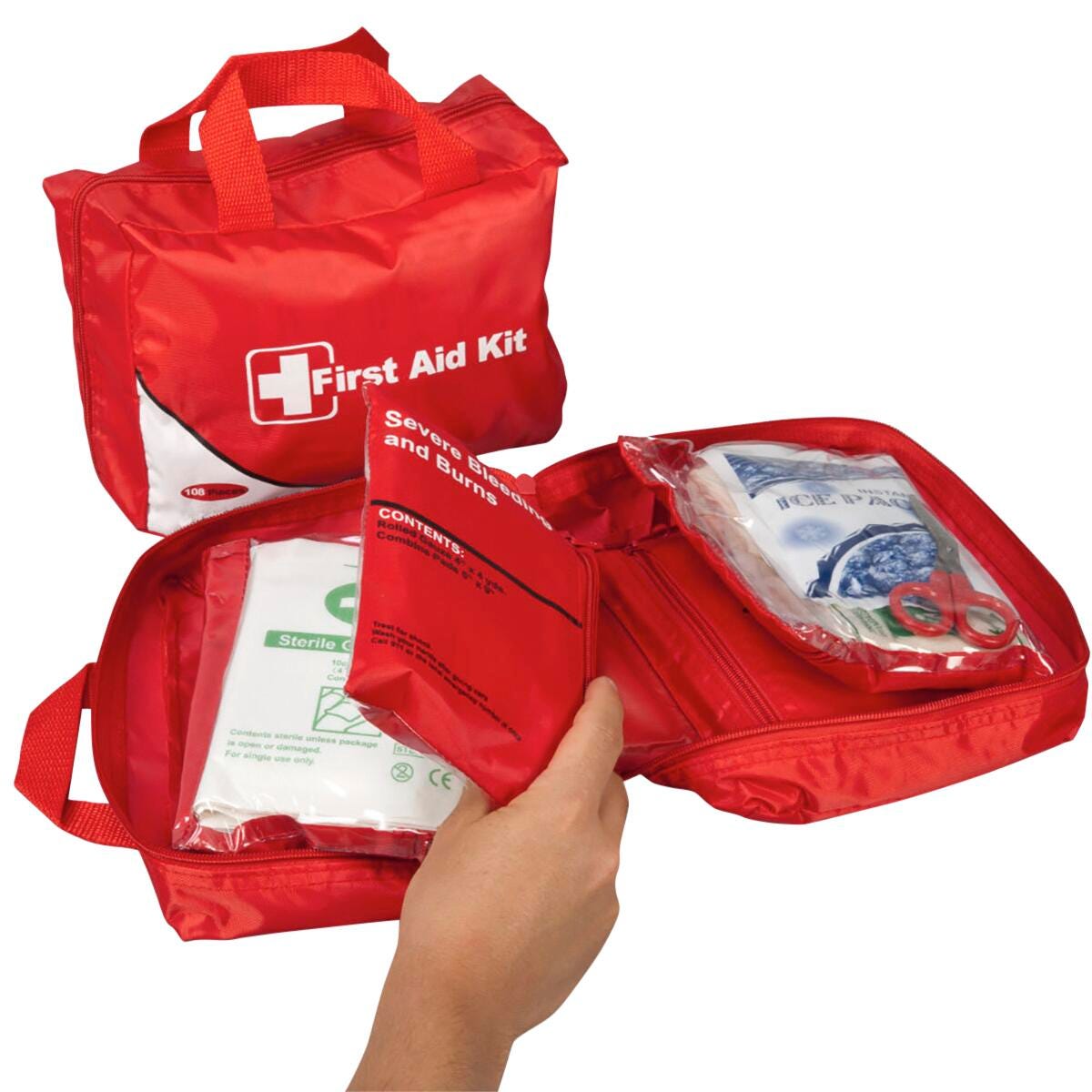 - Unfold the pouch to reveal a well-organized array of essential first aid supplies