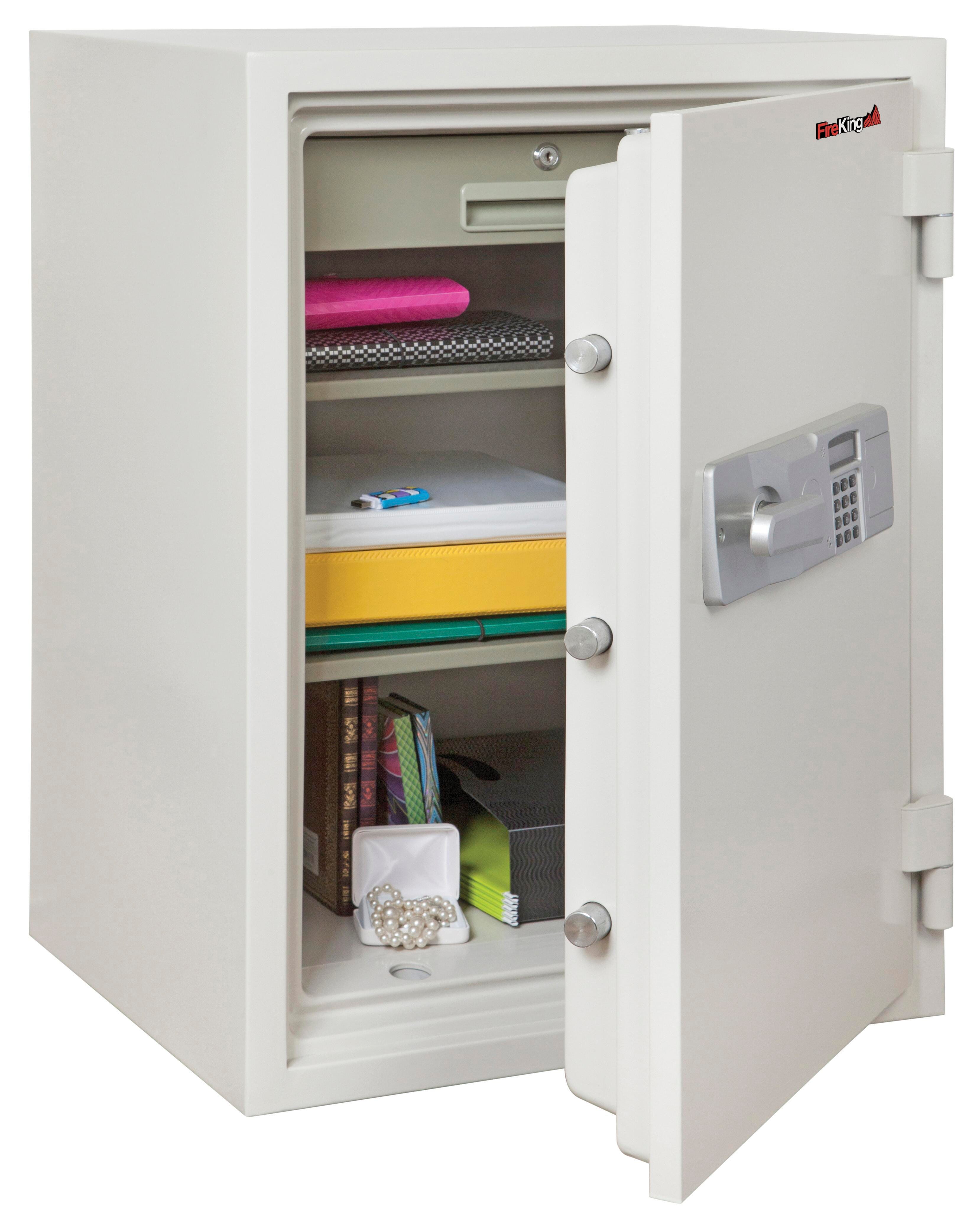 Fire King Fire And Water Resistant Safe has a capacity of 3.6 cubic and is constructed by heavy steel uses no plastic. Features continuous 2 hrs fire rating and programmable electronic lock. Safe has single key locking drawer with 2 adjustable shelves for user convenience.