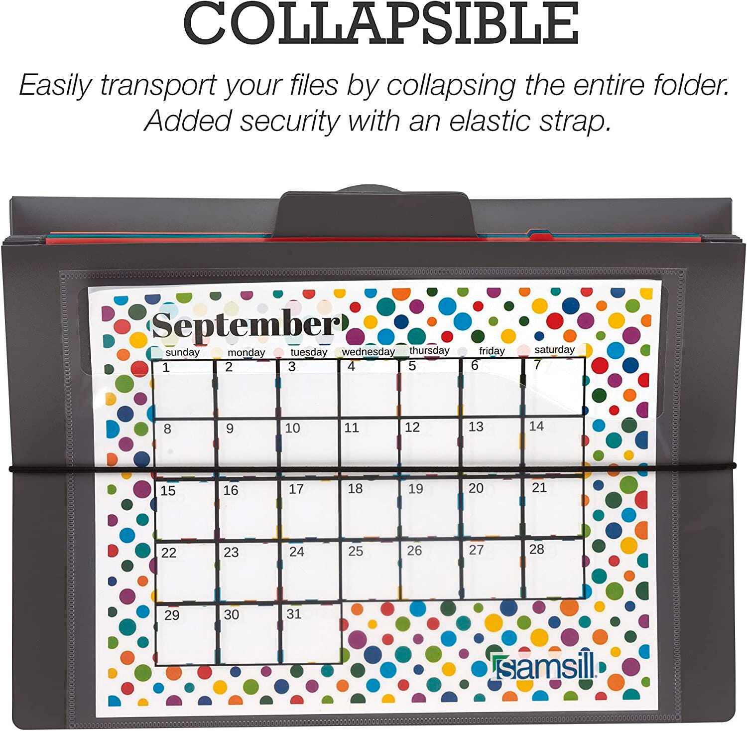 Description This customizable hanging file organizer is perfect for on the go. It is collapsible with an outer elastic band to ensure everything stays in place. Features a built-in handle for hanging and a customizable front cover, which is perfect for a monthly calendar or school papers. Each individual folder is removable, making it easy to take one subject out when needed.Includes: 1 (6) Pocket Hanging File Organizer