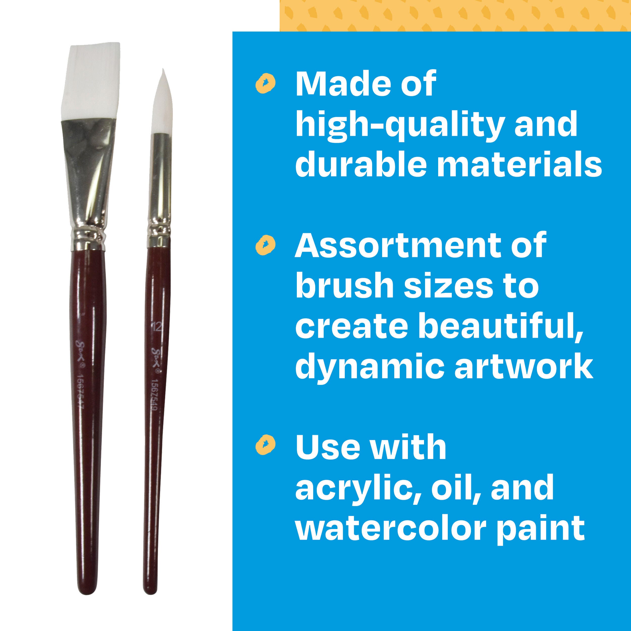 Description Sax optimum white synthetic taklon paint brushes are durable, high-quality, and give you better control. Hand-crafted with white nylon taklon for clean brush strokes, the brushes come with short handles and assorted sizes. The short handle size allows for more precise, intricate brush strokes when working close to your artwork. Get predictable brush strokes every time with great color capacity, crisp edges, and sharp points on our synthetic brushes. The tip springs back even on rough watercolor paper. Our 72-pack of assorted size brushes is perfect for all of your crafting needs in the class or art studio. Use the paint set for oil, acrylic, and watercolor painting.