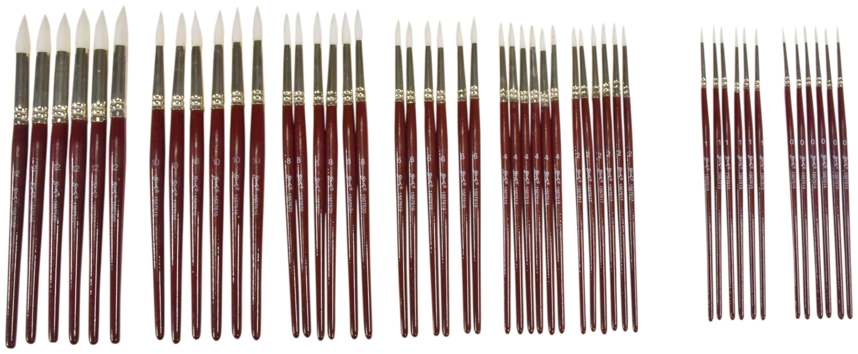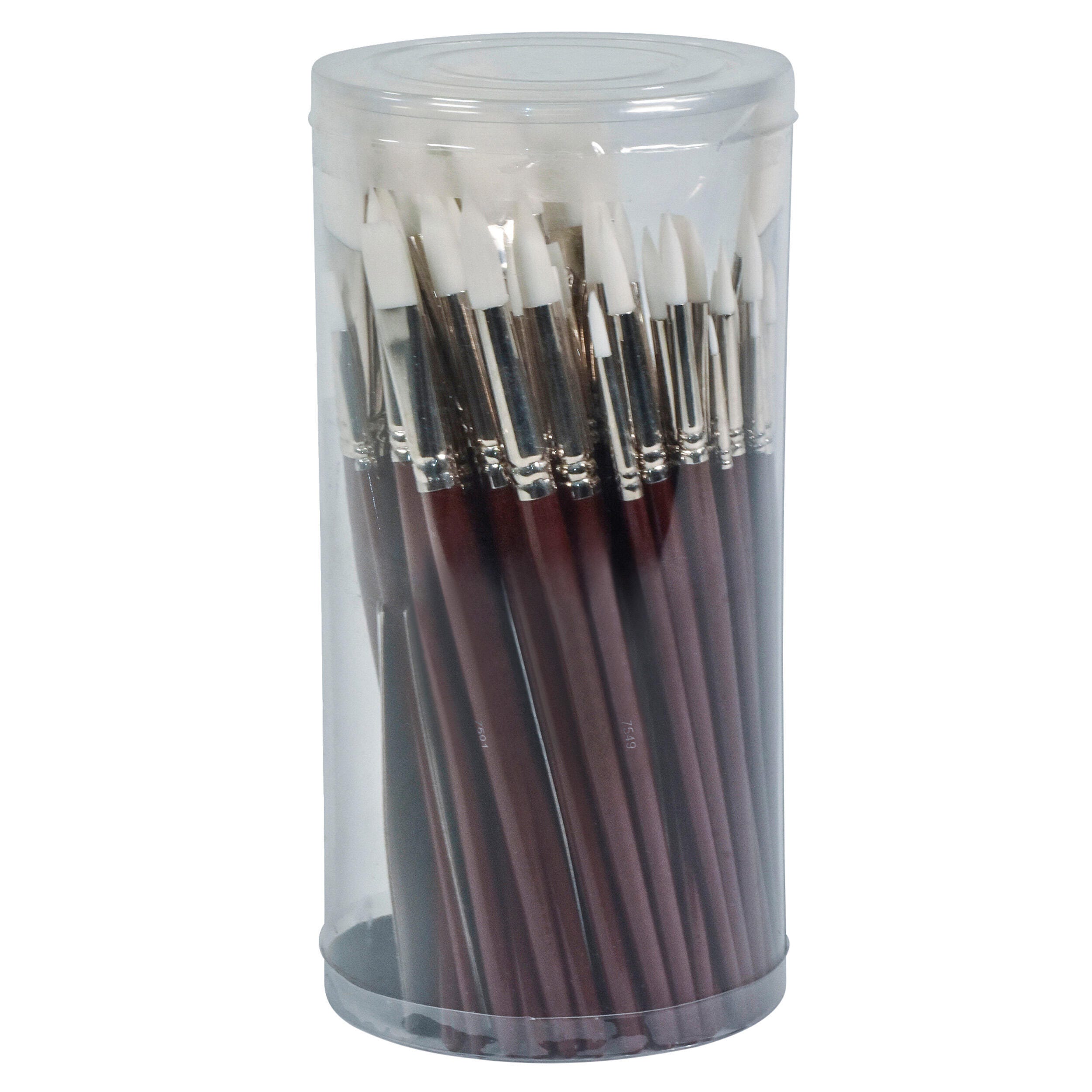 Features This pack contains 72 brushes with white taklon bristles An assortment of paintbrush sizes and types fosters creativity for beautiful, unique designs Mixed round and flat brushes allow for both fine and thick paint application Nickel-plated ferrules are seamless and fixed onto enameled short handle hardwood handles The artist-quality brushes are short for better control and comfort Hardwood handles help ensure longevity and the taklon design provides improved performance and value Sax art supplies are developed and field-tested by art educators for art educators Includes Six Taklon Hair Brushes in Each Size: