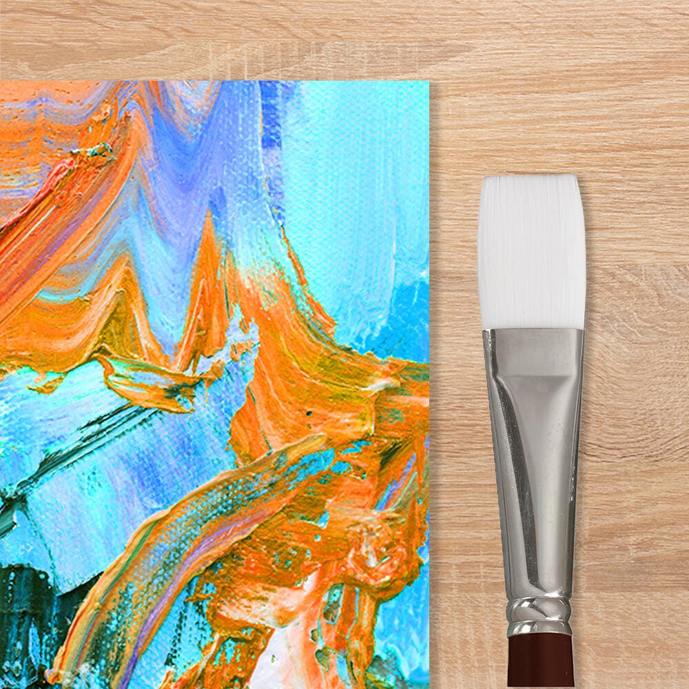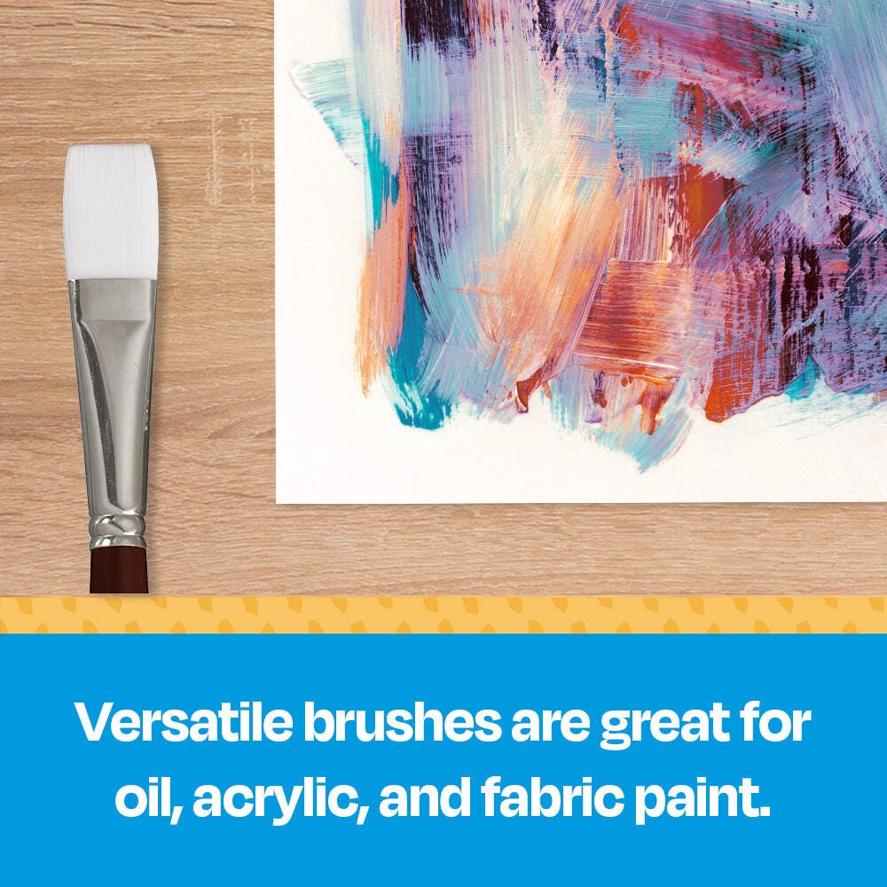 Sax white taklon paint brushes with long handles and bright tips (size 10) provide superb color holding, spring, sharp edges, and smooth application. Optimal brush strokes help students create their best projects while enhancing their painting techniques on different mediums. Our 3-pack of bright synthetic bristle brushes are great for dabbing, impressions, and controlled strokes. The flat brush is perfect for the classroom or art studio. Use the white nylon synthetic hair brushes with oil and acrylic paints.