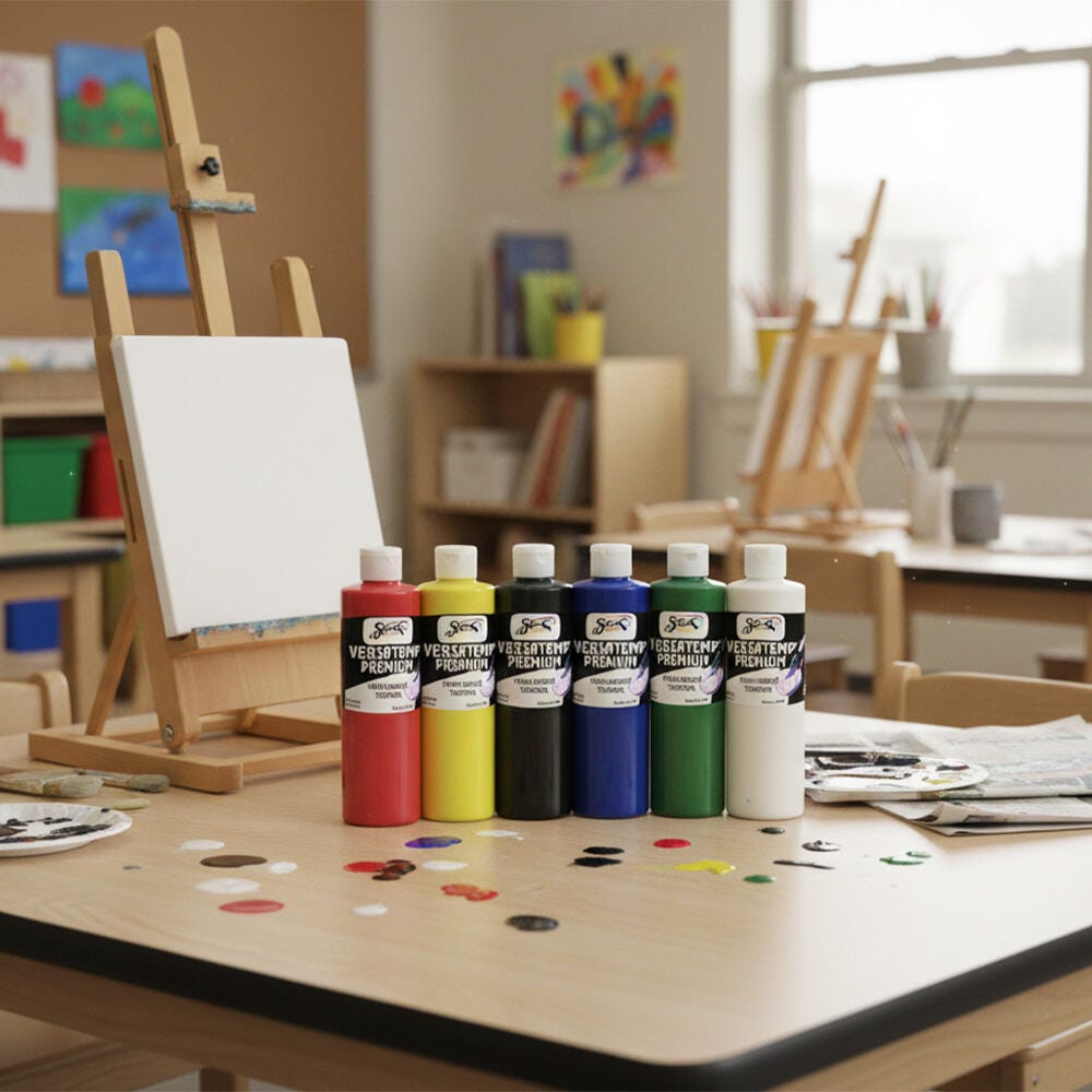 This set of assorted color tempera paint is perfect for the classroom, studio, or home.