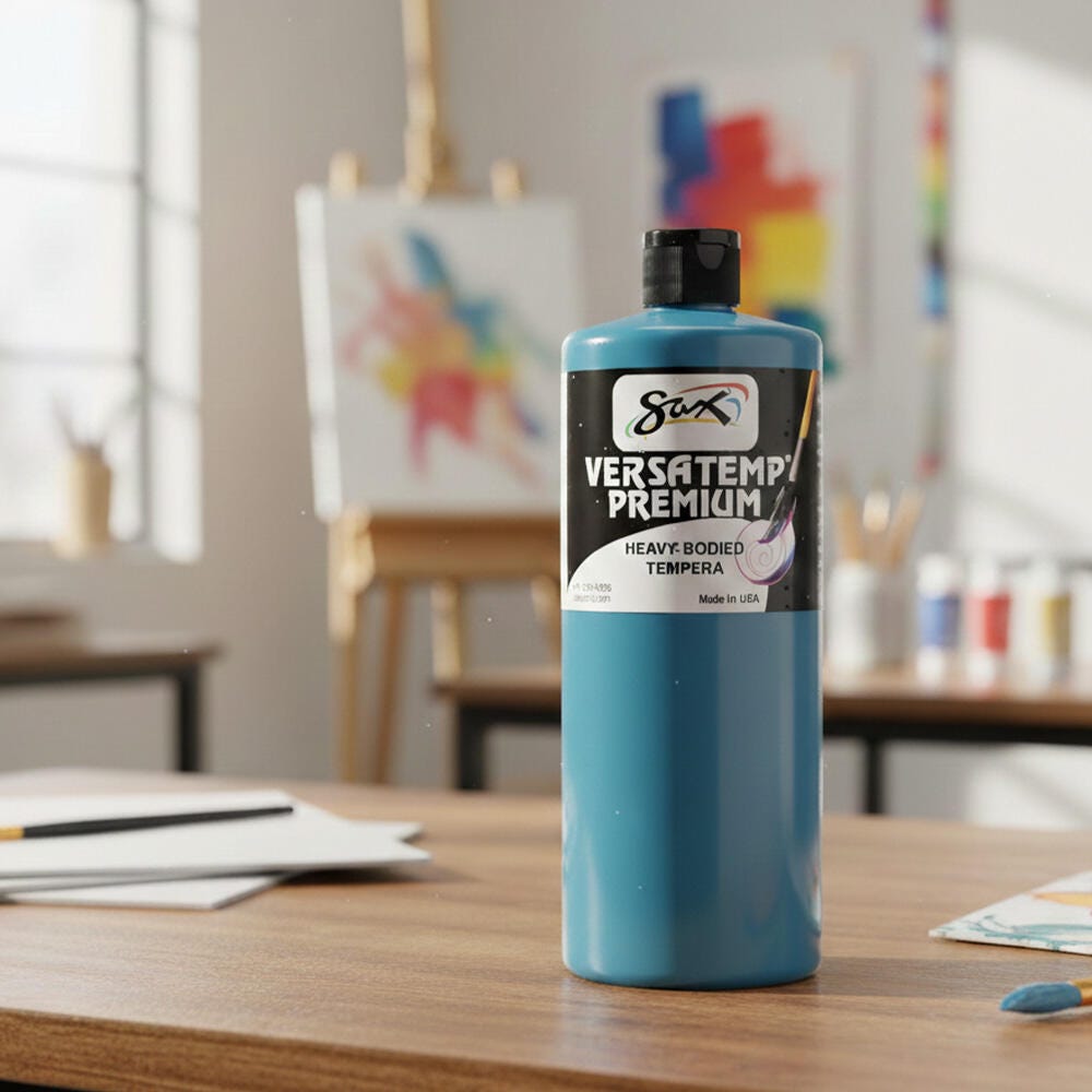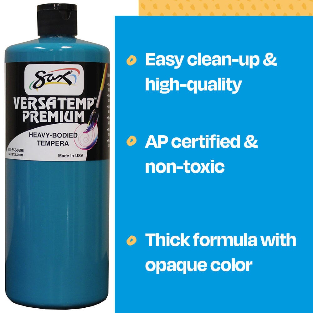 Description Sax Versatemp premium heavy-bodied tempera paint in turquoise is perfect for artists and students. Enjoy richer, brighter, and more intense colors with a thick consistency that provides superior brush film build and excellent color mixing properties. This tempera is perfect for block and screen printing as well as signs, sets, and backdrops. Complete projects, posters, and unique paintings with this high-quality painting medium in a convenient 1 quart bottle. Stock up and save with our tempera paints.