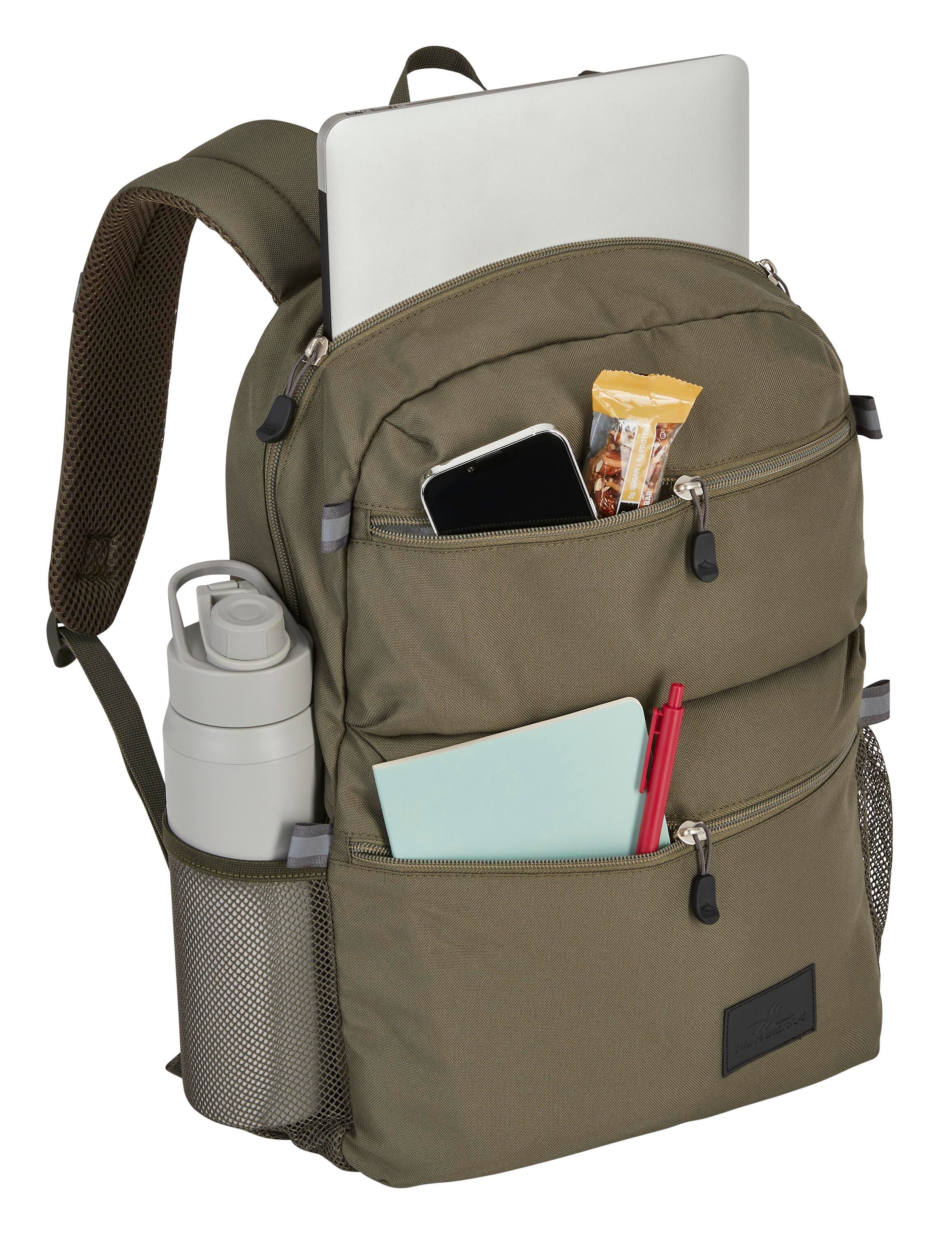 Description Spacious main compartment with padded laptop/tablet sleeve that fits most laptops up to 5.6 inches. Features 360 degree reflectivity. Sizable exterior pockets for quick access. Padded back panel and shoulder straps. Dual water bottle pockets. Backpacks measure 17-1/2 x 11-3/4 x 6 inches.