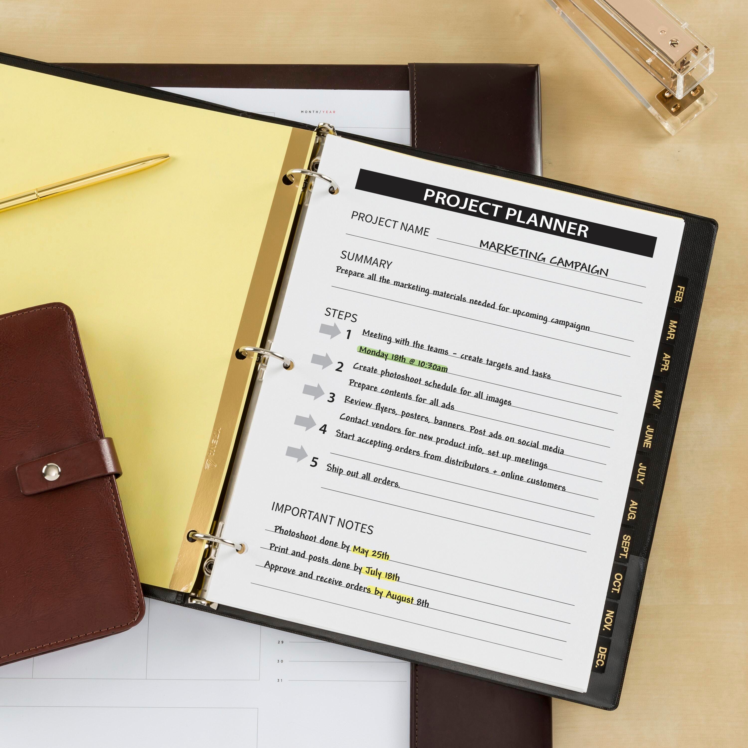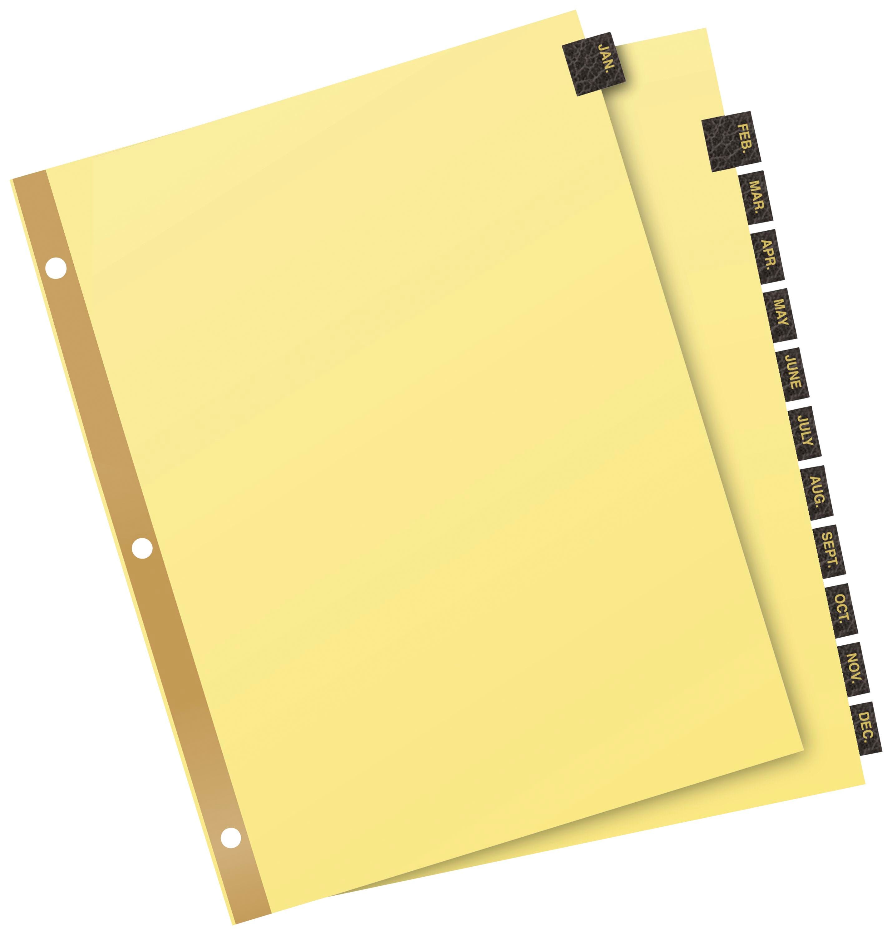 Getting organized can be stylish as well as practical. Black leather tabs feature gold lettering for a touch of class and style. Organizing is a cinch with preprinted tabs that run from Jan to Dec, allowing you to start organizing your paperwork the instant you unwrap the dividers. A reinforced strip adds durability to the three pre-punched holes. It all adds up to an attractive organizational solution that lasts. Not printer compatible.