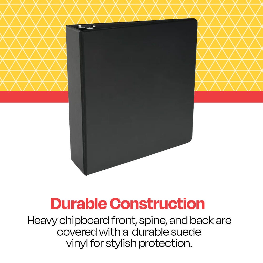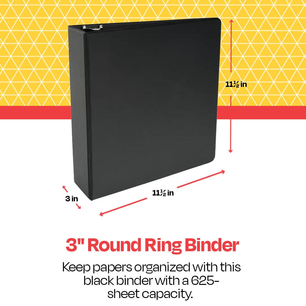 Arrange your most important notes, papers, and records in the School Smart black 3 inch round ring binder. Our O ring binder design has a heavy-gauge chipboard front, back, and spine with a durable suede vinyl cover for extra protection. The O ring mechanisms are O-shaped and easy to open and close, so you can organize and store essential paperwork in your 3 ring binder. Made of polypropylene, the binder also has two deep inner pockets to hold loose sheets of paper. This large O ring file has a 550 sheet capacity, and the entire black binder measures 11-1/2 x 11-1/2 inches.