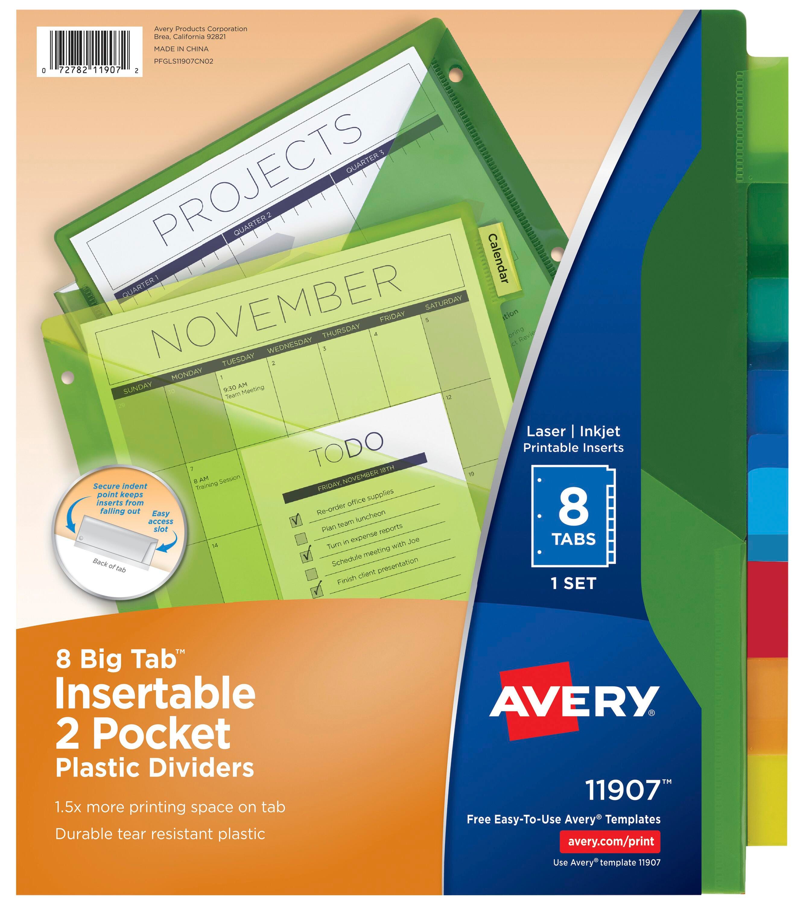 Easily organize school subject binders, recipe binders, office binders and more with Avery 11907 plastic page dividers for 3 ring binders. Each divider is made with a durable PVC-free plastic material that will last longer than standard paper dividers and wipes clean with most non-abrasive household cleaners. The insertable Big Tab divider tabs are 50 percent larger than traditional divider tabs. A sheet of tab inserts are included that can be printed on with either a laser or inkjet printer and can be written on with pens, permanent markers, and pencils. Visit the Avery site for free templates and tools to easily design and print custom tab inserts for any project.Features