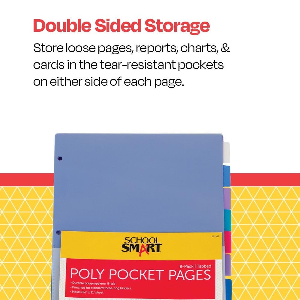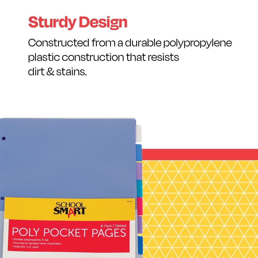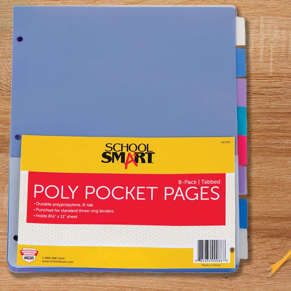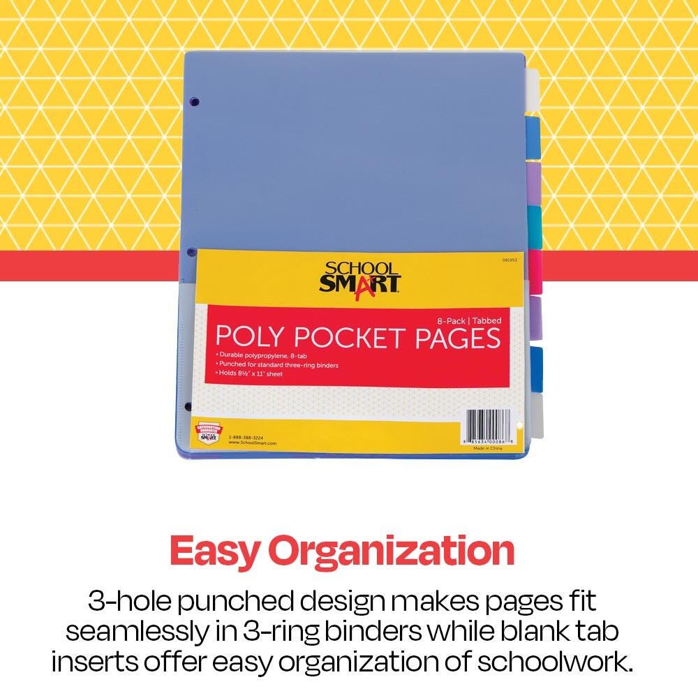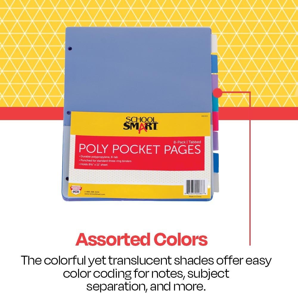 Description Keep your assignments and important documents right at your fingertips with School Smart assorted tabbed poly pages! Providing pockets on both sides for sheets up to 8-1/2 x 11 inches, these binder pages are perfect for storing loose pages, reports, charts, and cards. These pocket tab dividers feature a durable polypropylene material construction that resists dirt and are built to last. The pages offer blank tabs and are sold as a pack of eight in the following colors: one red, one green, two clear, two blue, and two purple.Features Resists tearing, staining, and cracking Fits 3-ring binders with convenient 3-hold punch design Double-sided storage with pockets on the flip side of each page Assorted colors for easy color-coding organization Includes: 8 Tabbed Poly Binder Pocket Pages in Assorted Colors Blank Tab Insert