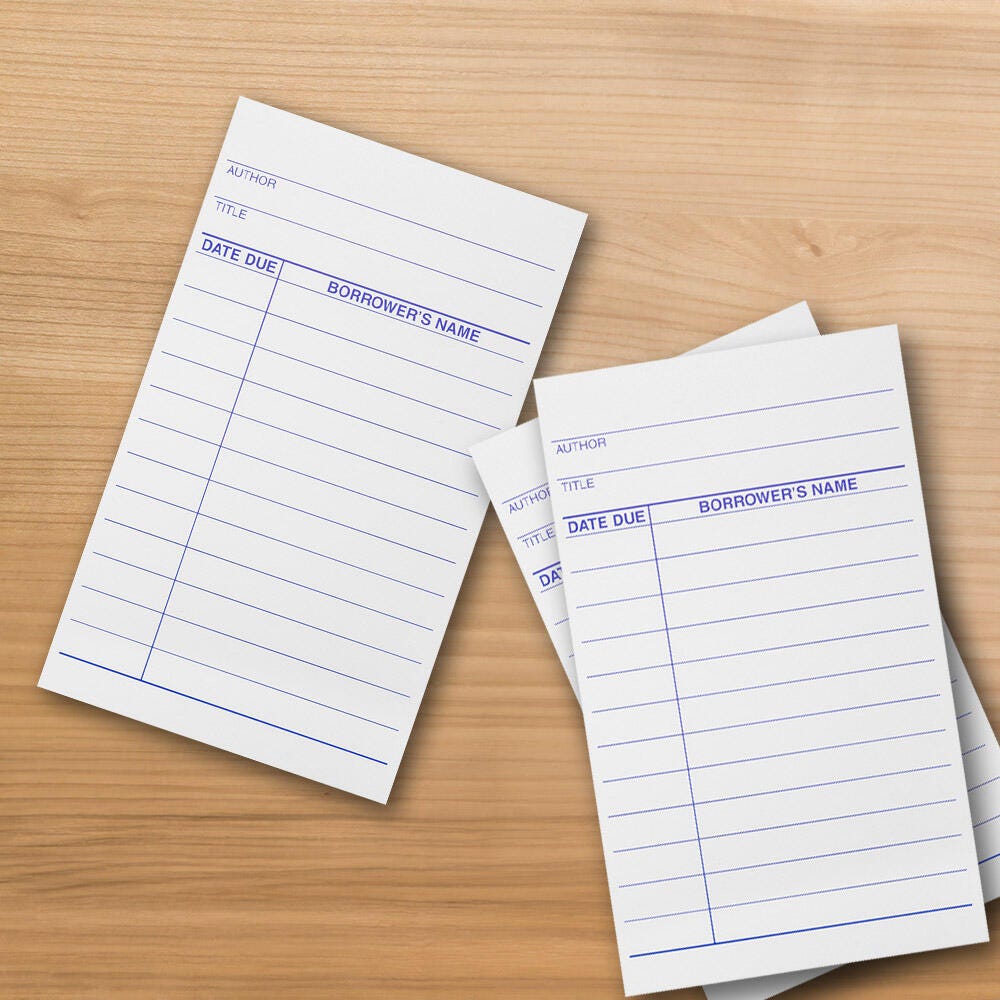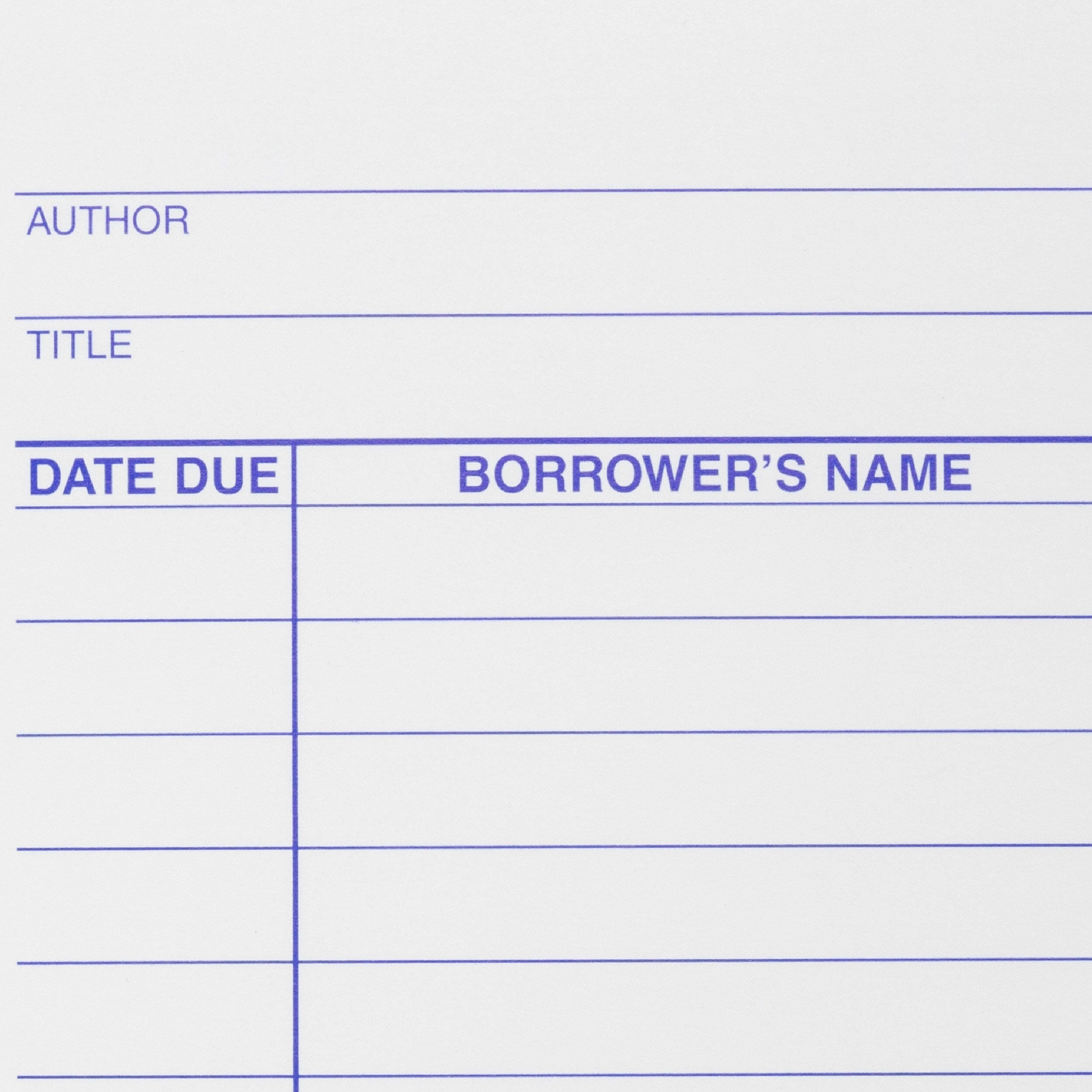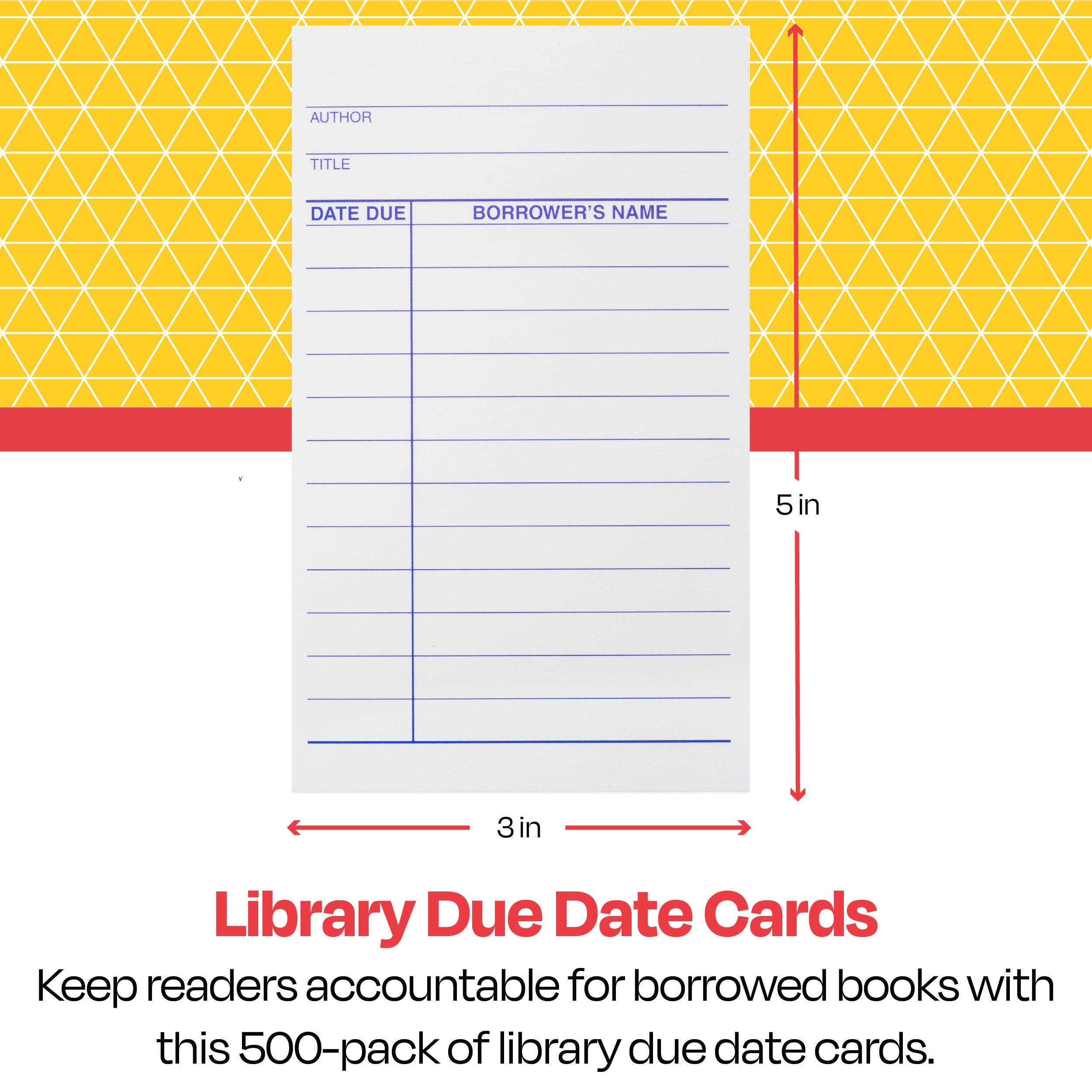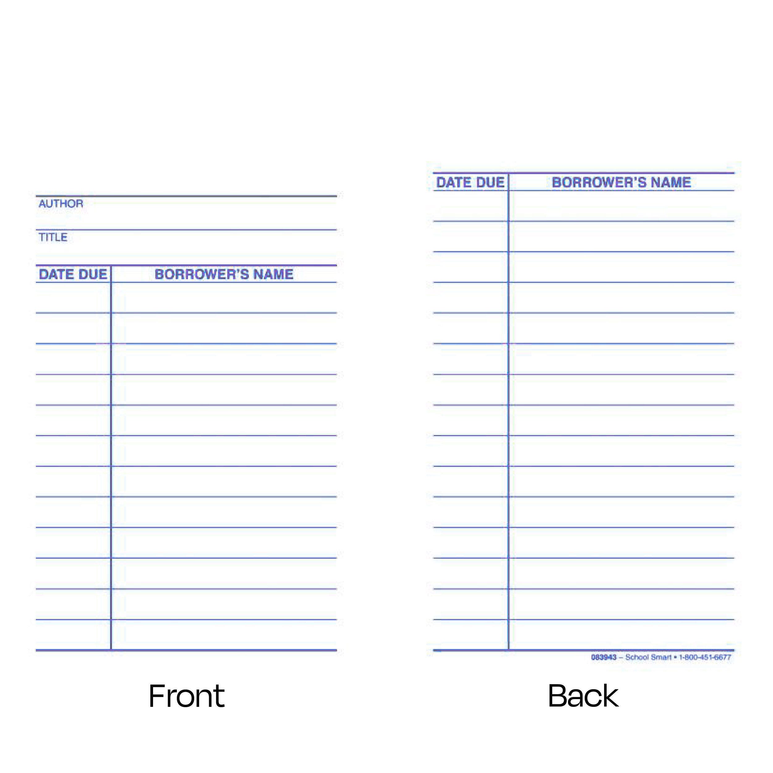 Description Track library books with ease with the handy School Smart library due date cards. Each classic library checkout card has all the basics for better library management. Crafted out of white index Bristol stock, each medium-weight circulation card features "AUTHOR" and "TITLE" text at the top with a typewriter space in between. Below is a column chart with "DATE DUE" and "BORROWER'S NAME" with plenty of split lines to write in the tracking information. The inked lines and letters are all in a highly visible sky blue color.Features The full library loan card measures 3 x 5 inches (slightly longer and narrower than a traditional index card) Our value pack of classic library book checkout cards is sold as a pack of 500 Individual book checkout cards provide a great alternative to a record book when checking out and loaning textbooks and novels Neat column rows and quick fill-in-the-blank sections on the due date cards are simple, convenient, and easy to understand by elementary, middle, and high school ages Each book checkout card is made of Bristol card stock for long-lasting durability Includes: 500 Classic Circulation Record Book Cards