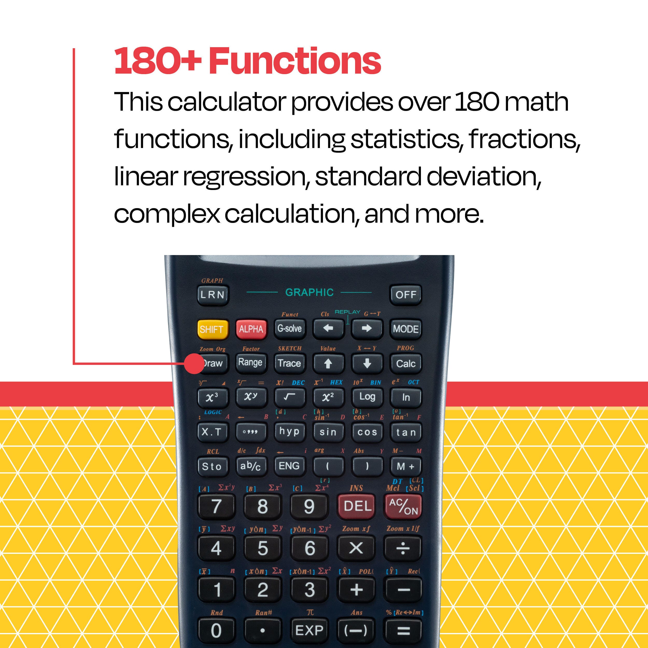 Features Scientific graph calculator has a large, modern LCD-lit screen with an extra large 2-line display Displays graphs and equations simultaneously Programmable system features many courses so students can learn concepts rather than memorize buttons Advanced math calculator provides over 180 functions on one device, including statistics, fractions, linear regression, standard deviation, and more Affordable graphing calculator designed with heavy-duty plastic to help resist wear and tear Scientific calculator is a valuable asset for algebra, statistics, biology, chemistry, physics, and finance courses Ideal for middle school, high school, or college classrooms or personal use Includes: 1 Scientific Graph Calculator 1 CR2032 Battery