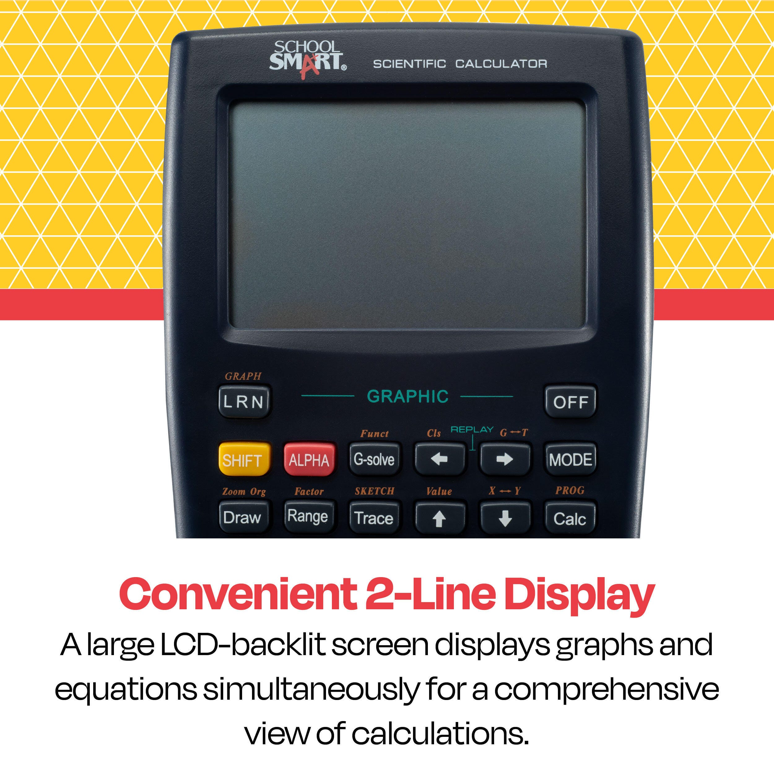 Description The School Smart scientific graphing calculator performs logarithms, reciprocals, powers, roots, factorials, trigonometric functions, hyperbolic trigs, degrees, minutes, seconds, decimal degrees, conversions, fractions, and more. It’s equipped with 183 pre-programmed functions, fractions, the basic four functions, and memory. Plus, it can perform one-variable statistical calculations. This 10 + 2 digital handheld scientific calculator has an extra-large 2-line display and includes a protective hard shell case. The graphic calculator measures 5-1/8 L x 3 W x 1/4 H inches.