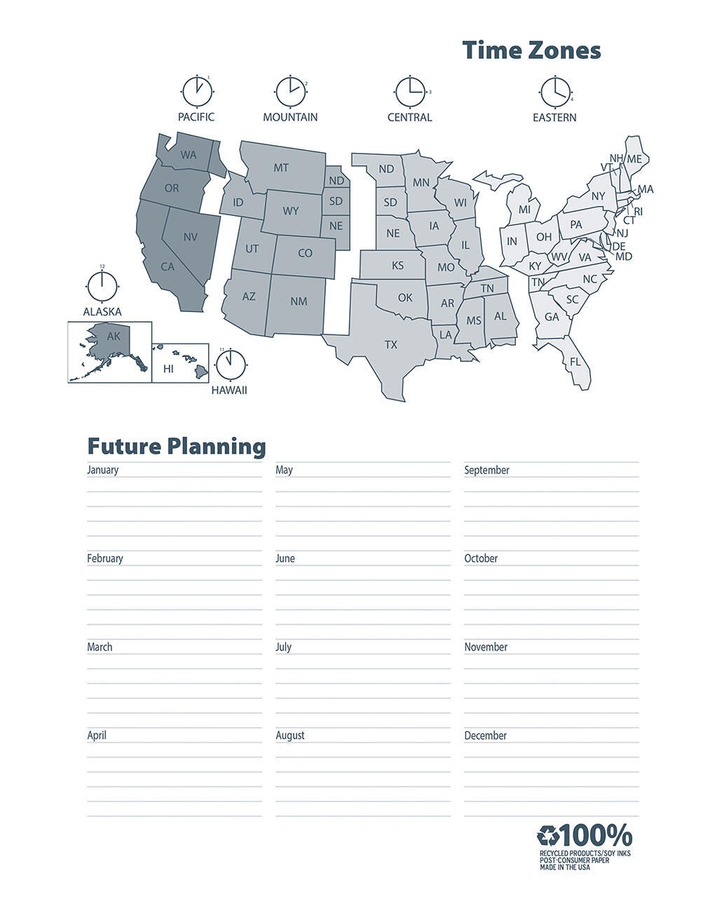 - Printed on 100% post-consumer recycled paper with soy ink
