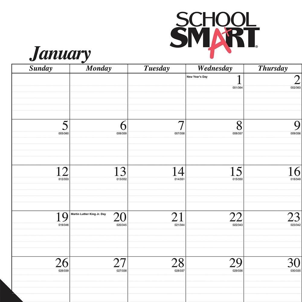 This Desk Pad calendar School Smart is a handy organizational tool to help you stay organized and on schedule. This monthly calendar spans 12 months, from January to December 2026. It includes four chipboard-reinforced leatherette corners, Julian dates/days remaining, a full year reference calendar on each page, and US and Canadian holidays. The lightly ruled daily blocks each measure 2-7/8 x 2-1/4 inches to provide ample space for your planning needs. The desk pad measures 22 x 17 Inches.