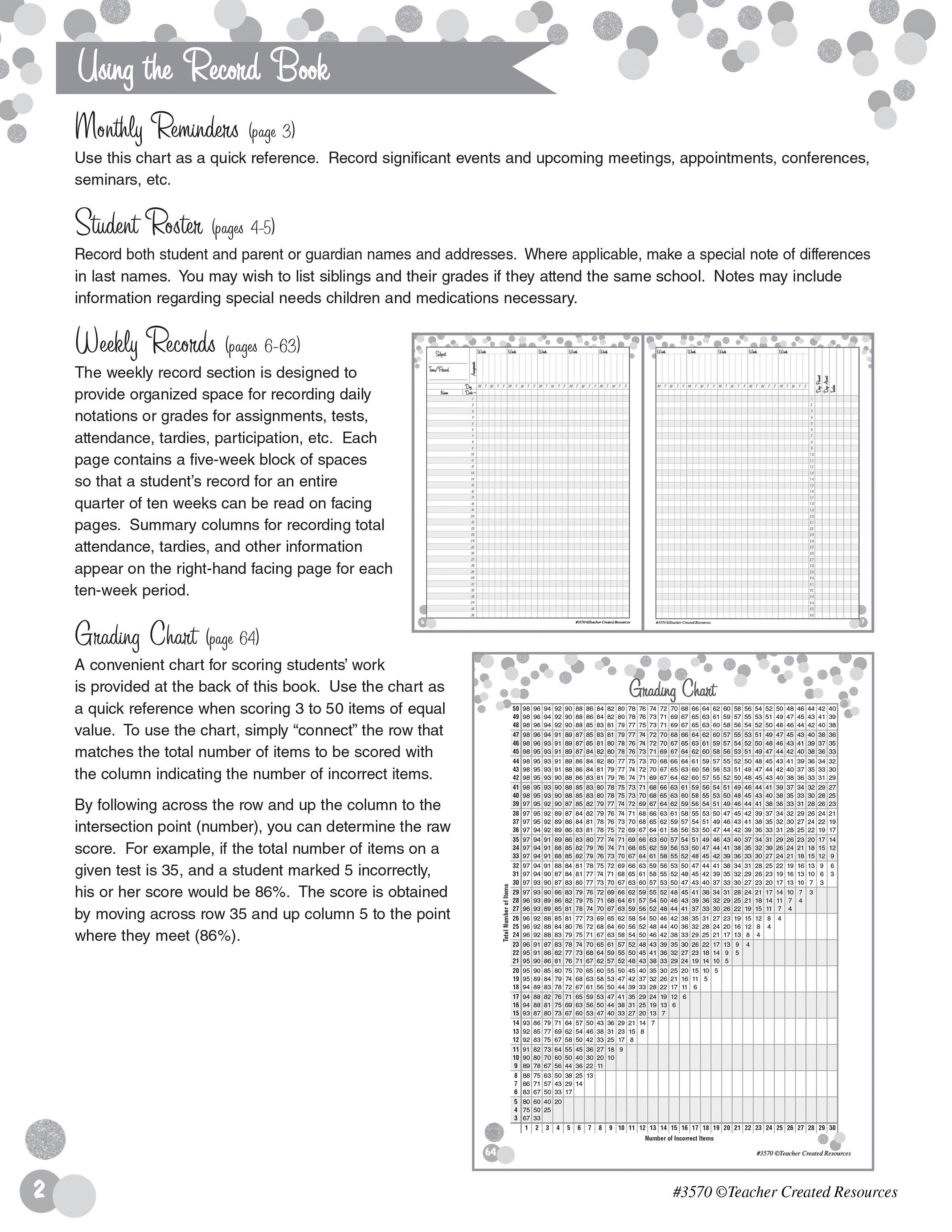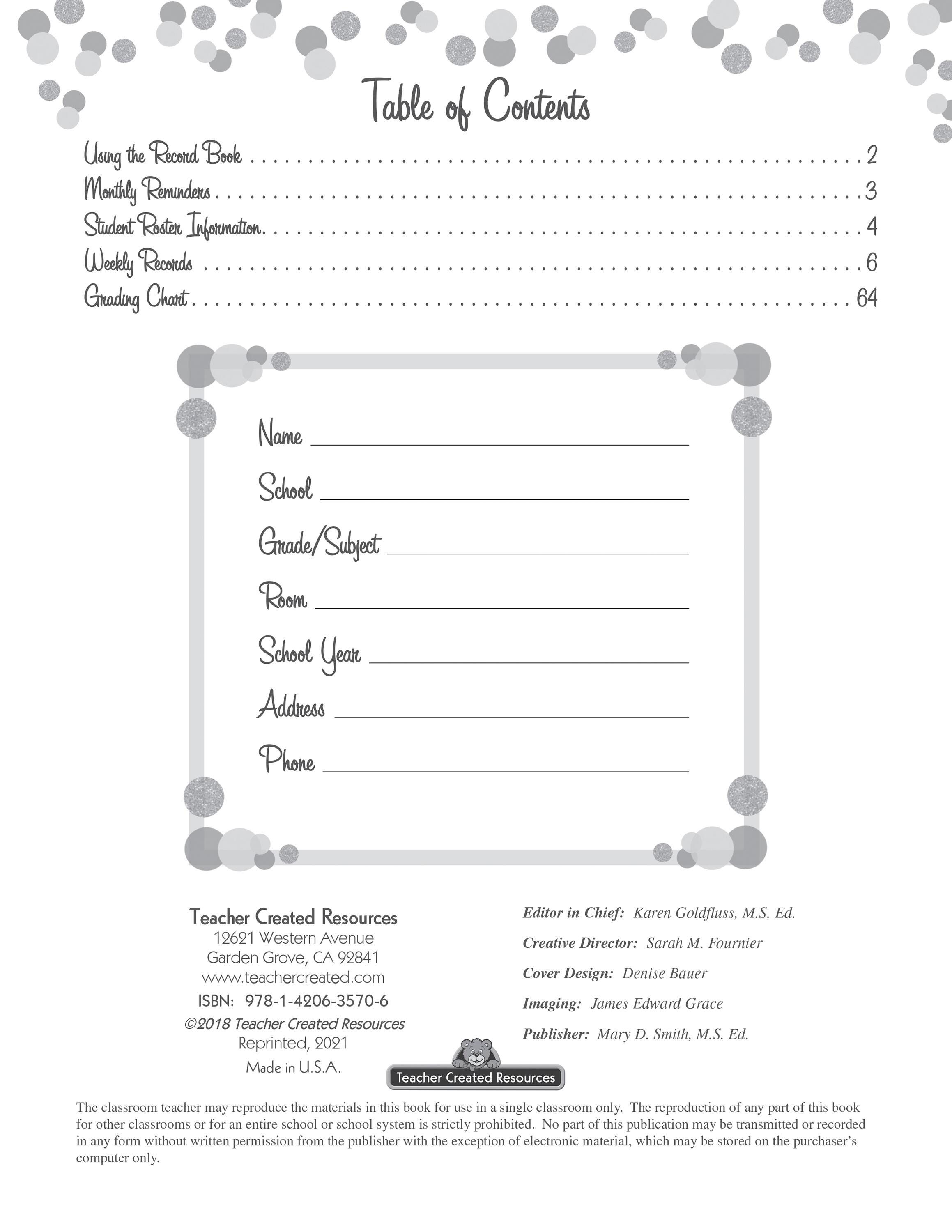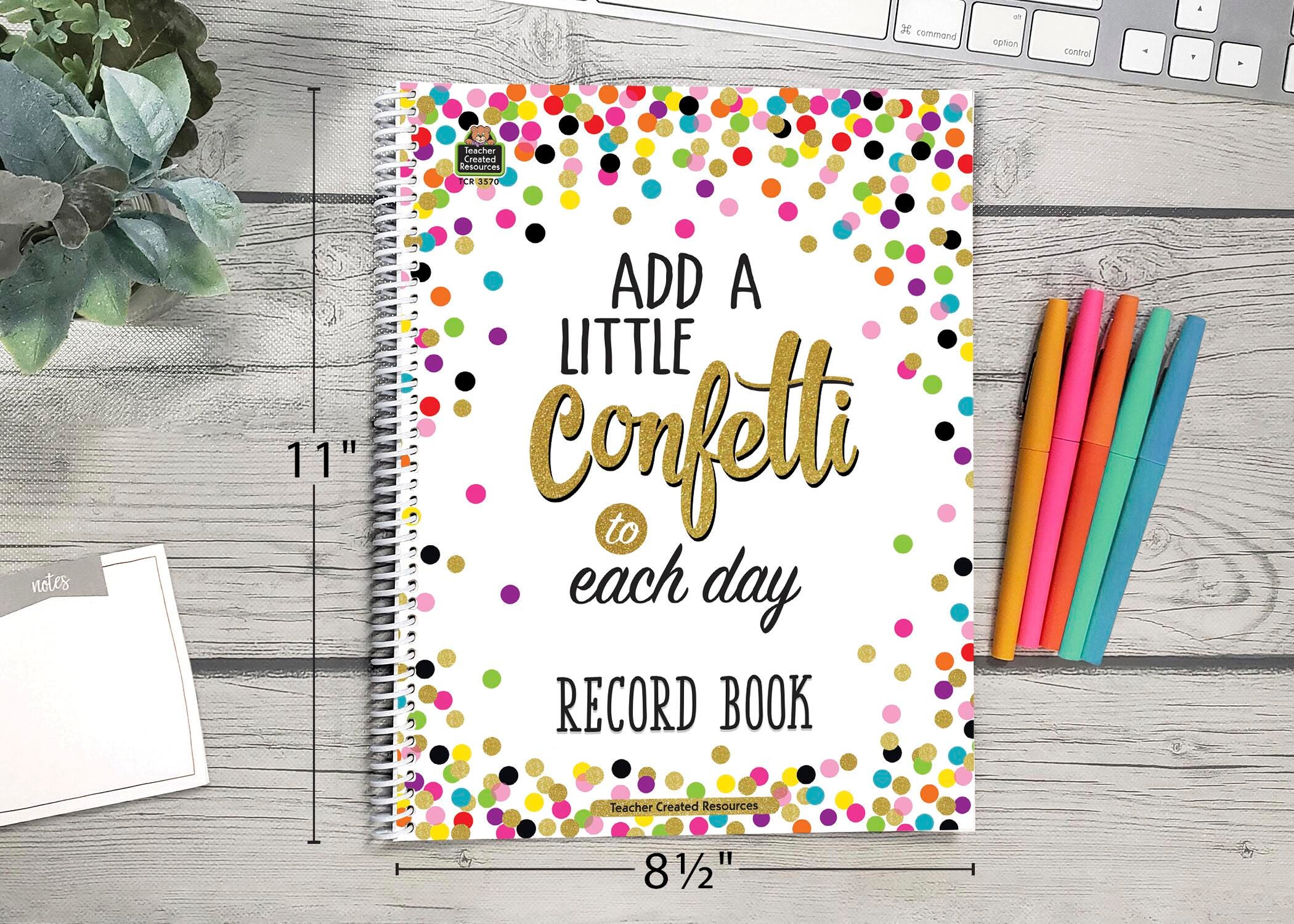 Description Teacher Created Resources Record Book will add a little fun to your day with this colorful confetti-themed record book. Plenty of space is provided to record grades for assignments, tests, attendance, or other notations. Each two-page spread allows enough space for 10 weeks worth of record keeping. Convenient, perforated pages allow for easy management of larger classes. An easy-to-use grading chart is also provided. 8-1/2 x 11 inches. Spiral-bound.