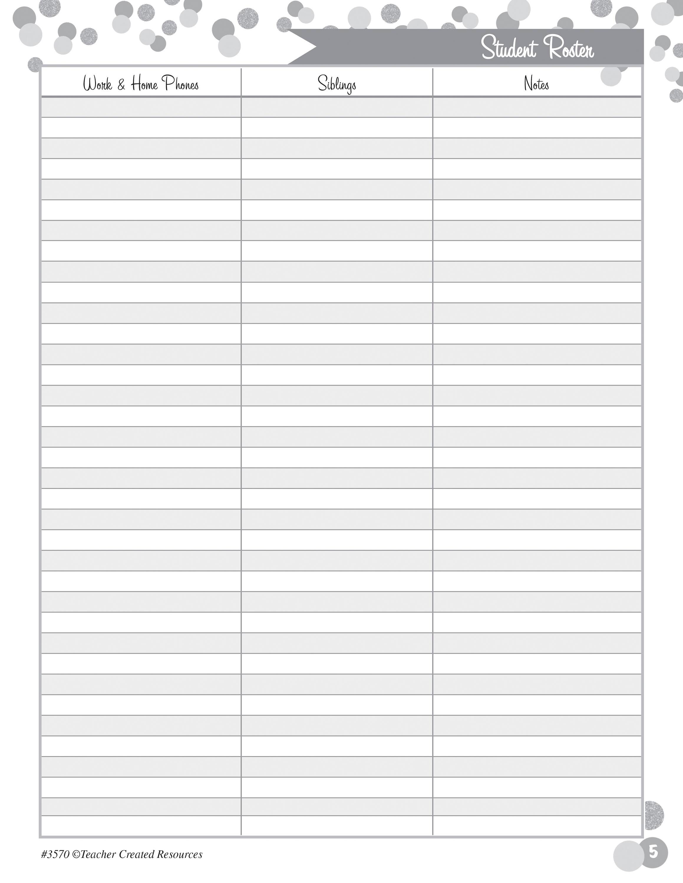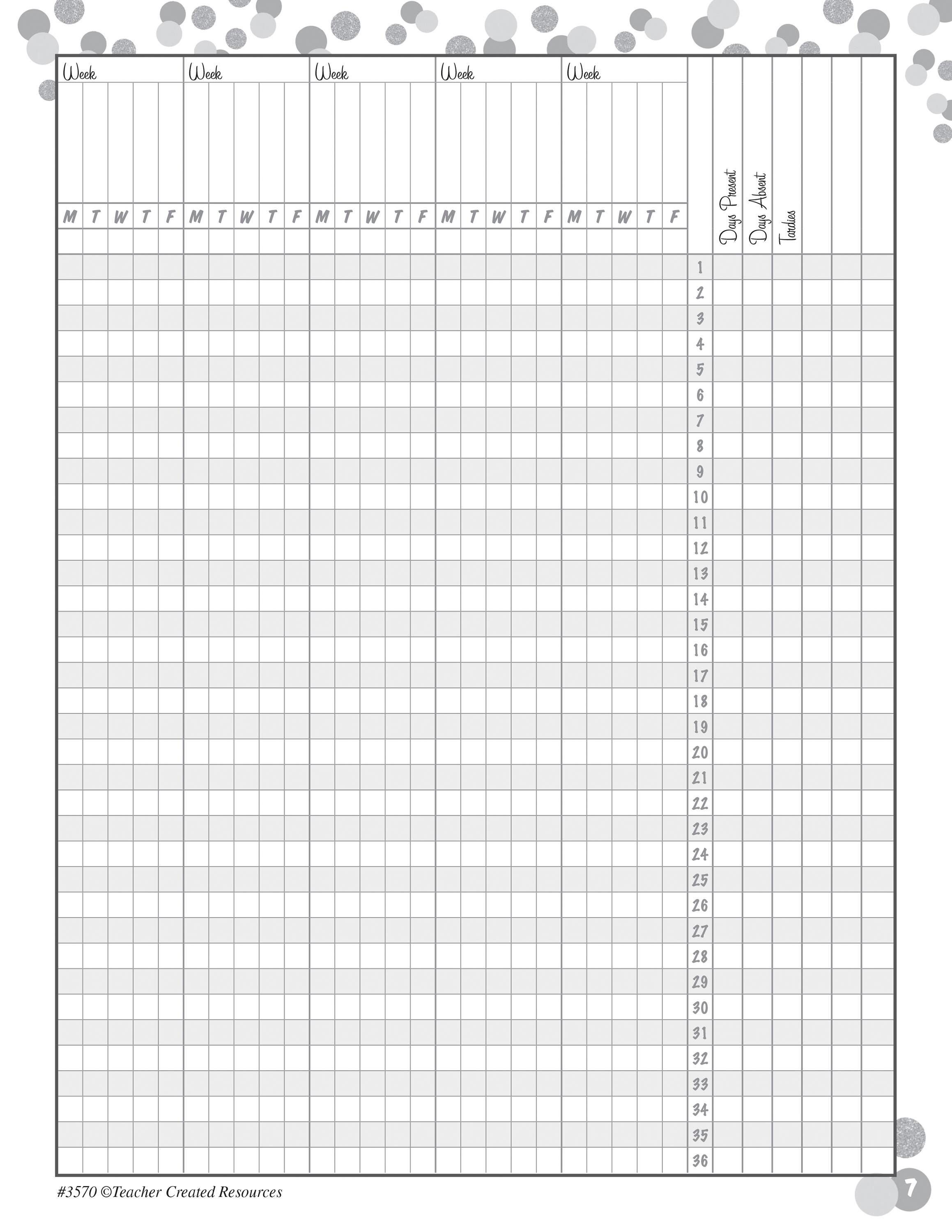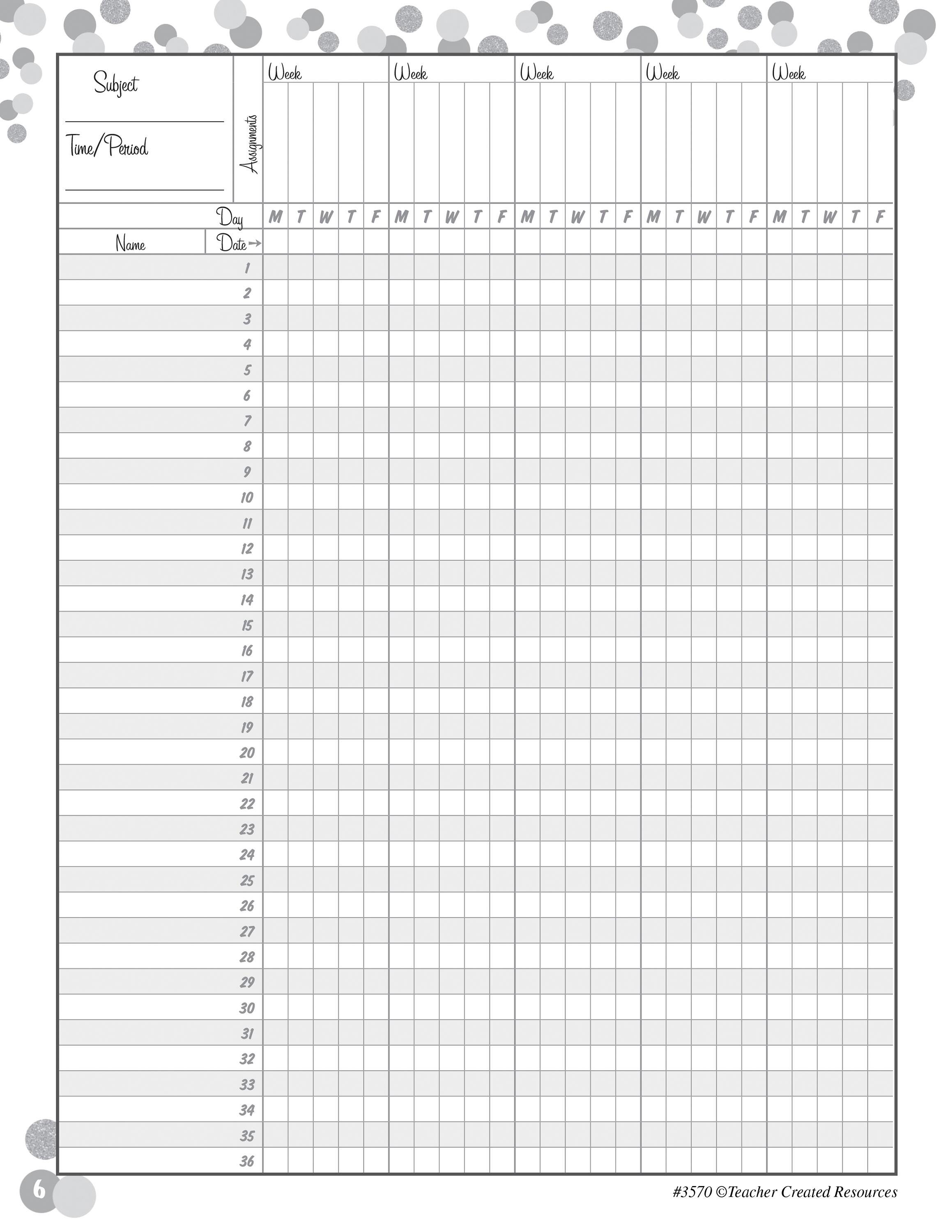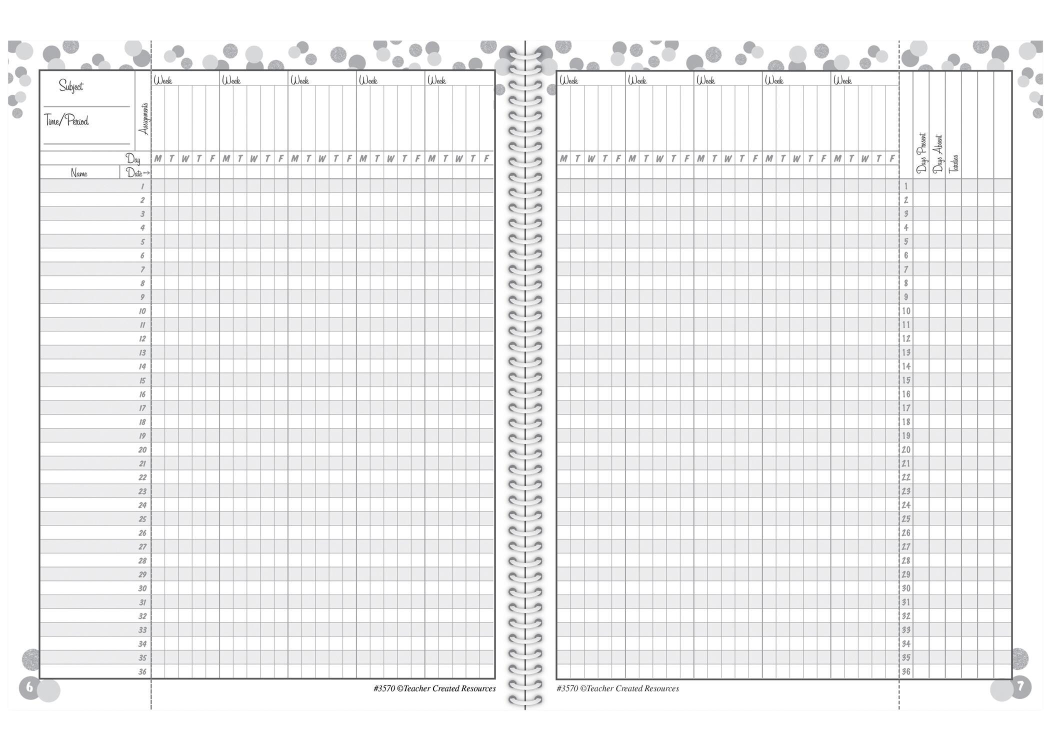 Description Teacher Created Resources Record Book will add a little fun to your day with this colorful confetti-themed record book. Plenty of space is provided to record grades for assignments, tests, attendance, or other notations. Each two-page spread allows enough space for 10 weeks worth of record keeping. Convenient, perforated pages allow for easy management of larger classes. An easy-to-use grading chart is also provided. 8-1/2 x 11 inches. Spiral-bound.