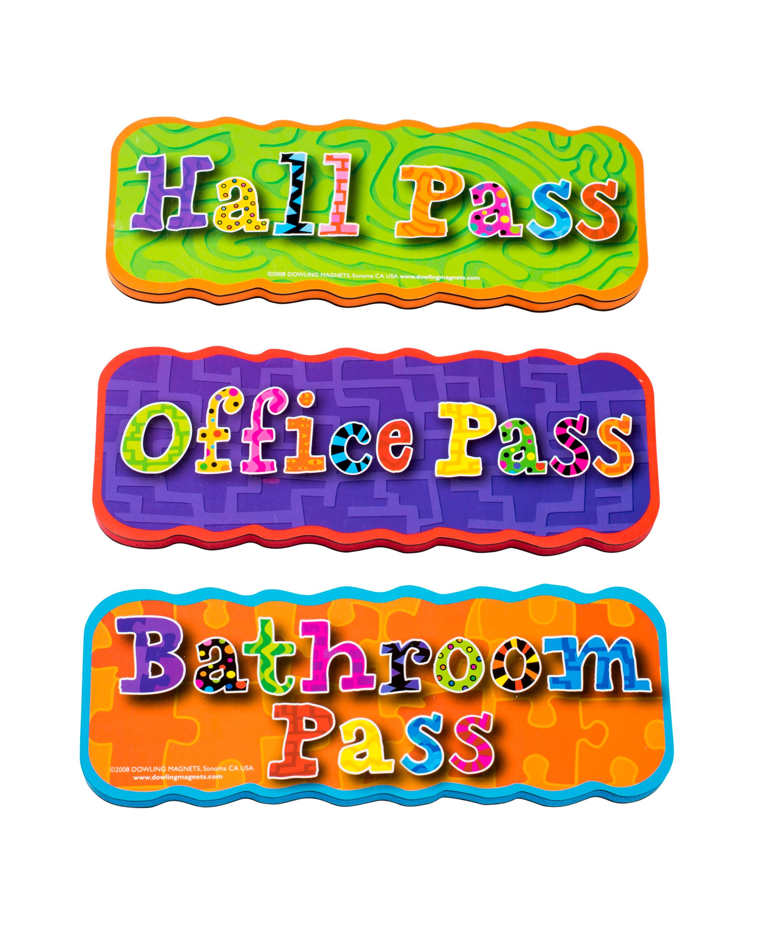 Dowling Magnets Magnetic Hall Pass Set includes one each from hall, office and bathroom passes that has a chunky foam core and a 2 sided magnet to store on a whiteboard, filing cabinet or any other magnetic receptive surface until called into action, sold as 3 per set.