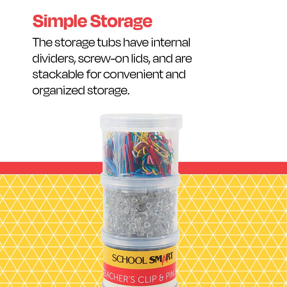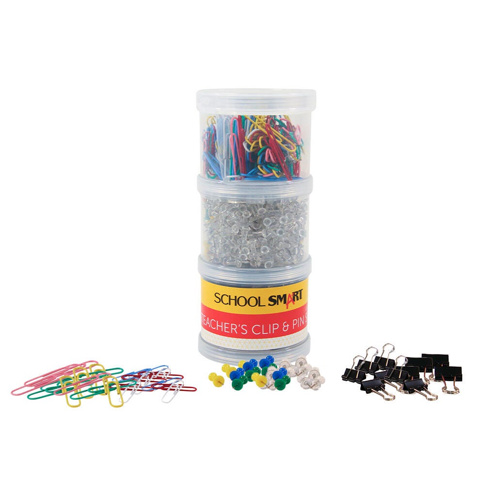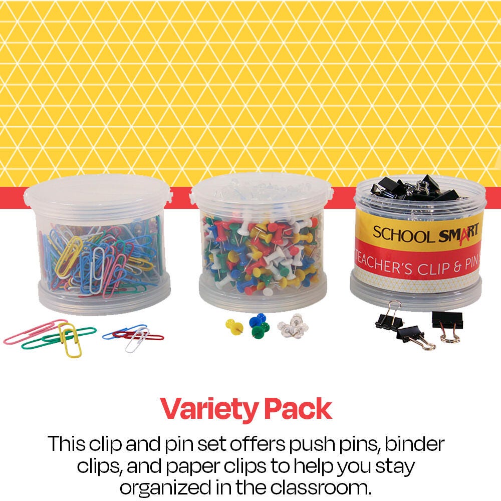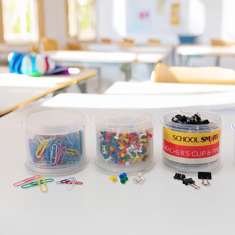 School Smart Teacher's Clip and Pin Set is perfect for stocking your supplies for the school year! This kit includes 3 tubs filled with a variety of handy desk essentials for bulletin boards, classroom projects, arts and crafts, and daily tasks. With push pins, binder clips, and vinyl-coated paper clips, your supplies will be able to handle any task in the classroom or office. The tubs have internal dividers to keep items organized and screw-top lids that interlock for stacking ease.