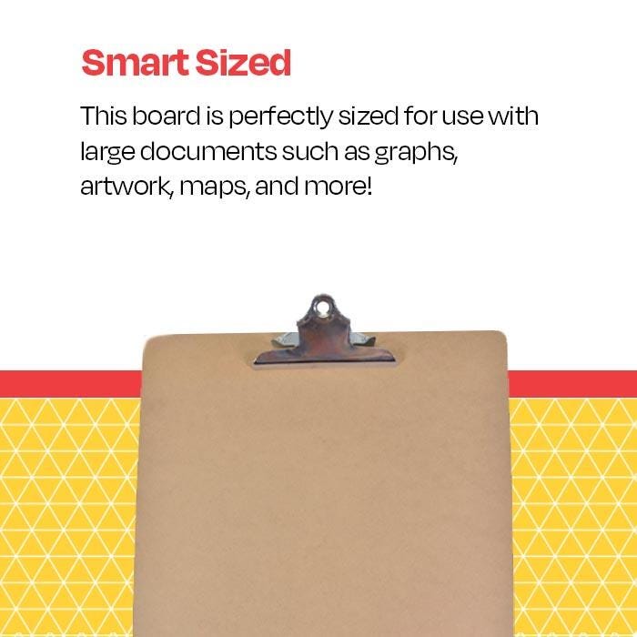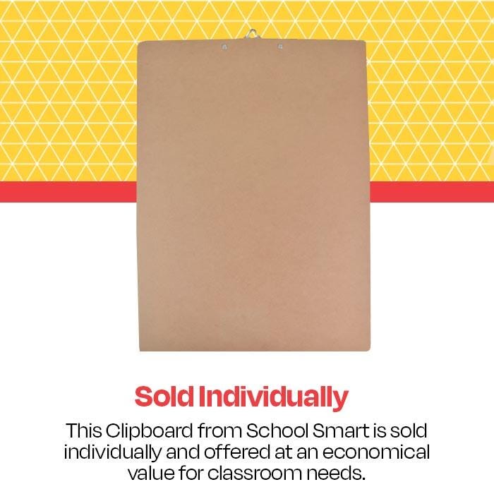 Strong, smooth School Smart hardboard clipboard features a brilliant nickel finish clip and offers a positive grip for pads, forms, and other documents. This clipboard is finished on both sides with beveled edges for safety. Art-size and perfect for art projects away from the desk, this clipboard is also an ideal size for larger paper for other projects - maps, graphs, and more! The hole at the top of the clip allows for easy hanging on hooks whether for storage or to showcase a piece. The full board measures 15 x 20 inches.