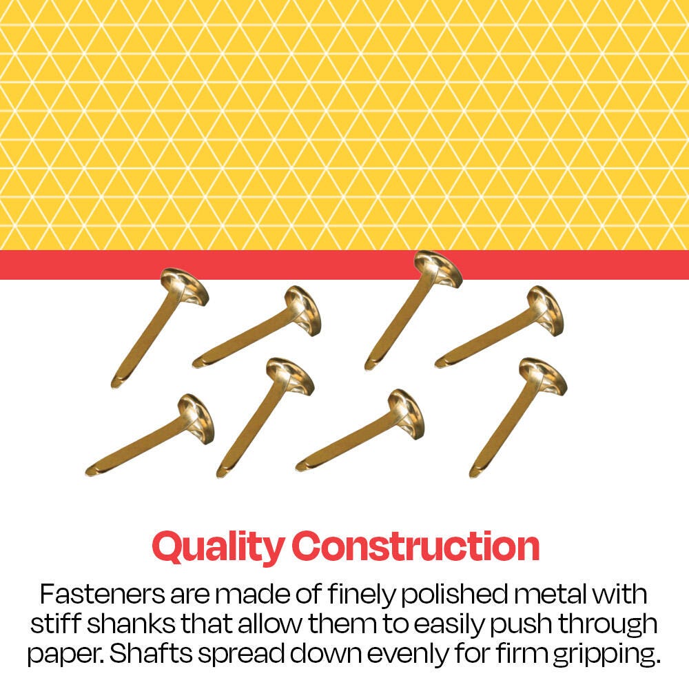 These Brass-Plated Fasteners from School Smart are an easy-to-use tool for keeping hole-punched documents together and organized. Measuring a 3/4-inch each, the fasteners have 1/4-inch round heads, sharp points, and stiff shafts that ensure reliable use for projects at the office and at school. They are made of finely polished metal and easily push through paper with shafts that spread down evenly for a secure hold. This pack contains 100 Size 3 fasteners.