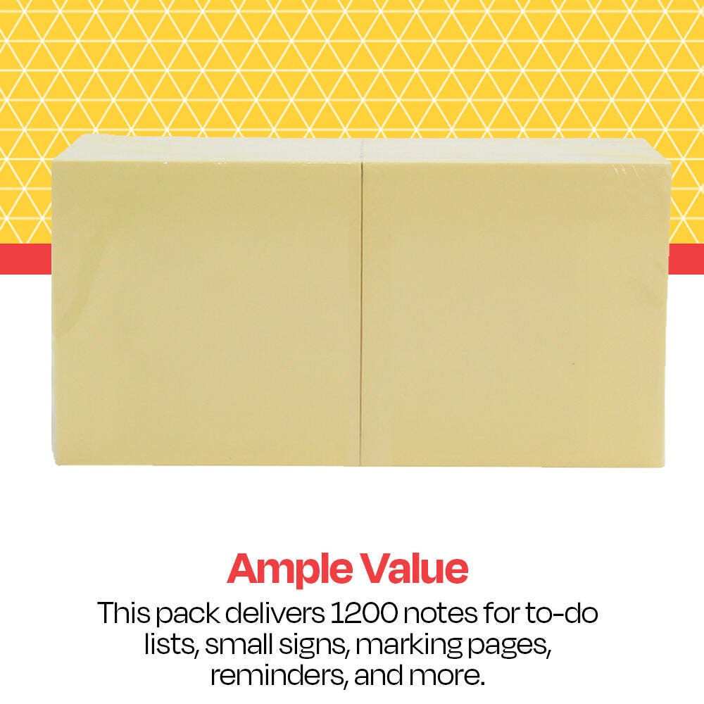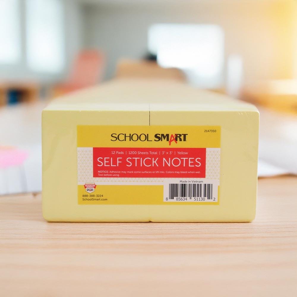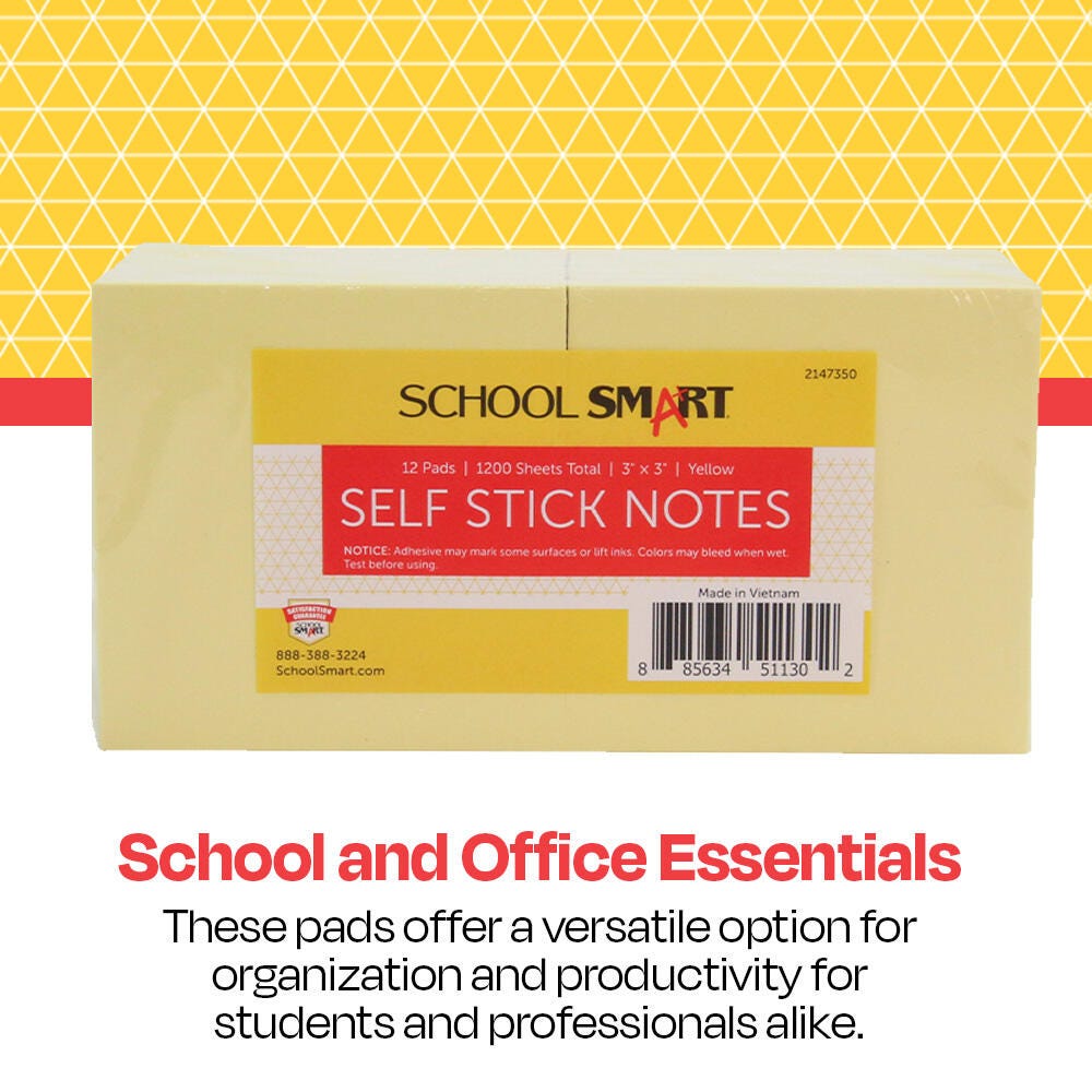 The School Smart Removable Self-Stick Notes provide a simple and economical way to leave reminders for friends, coworkers, roommates, or yourself! They have a strong, durable adhesive that sticks to most surfaces and can be removed and re-stuck, so your notes can move with you throughout the day. The 3 x 3-inch notes provide enough space for notes, reminders, and lists that stick right to your desktop, planner, or monitor. These notes are a helpful tool for all ages and settings! This pack contains 12 pads with 100 yellow sheets each.