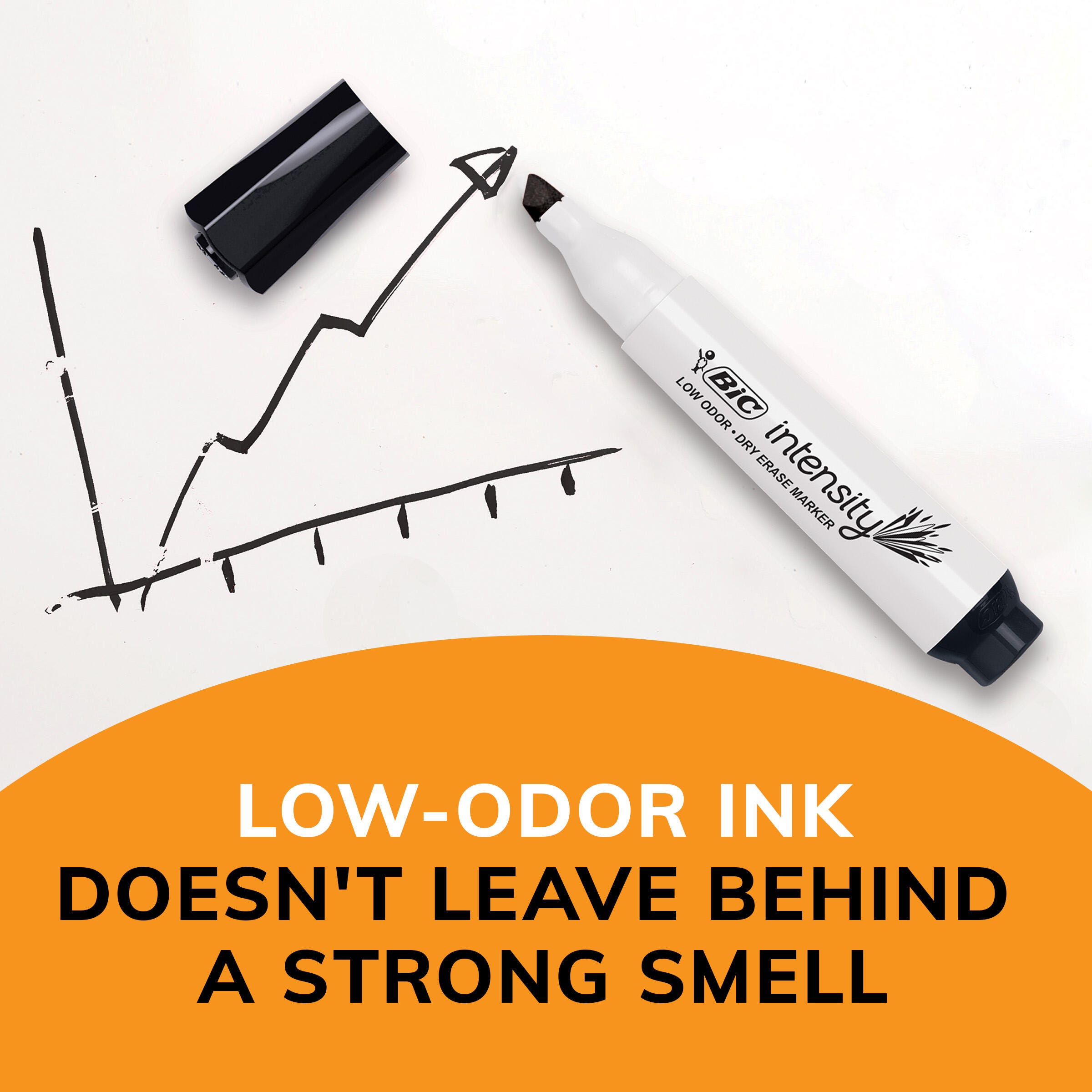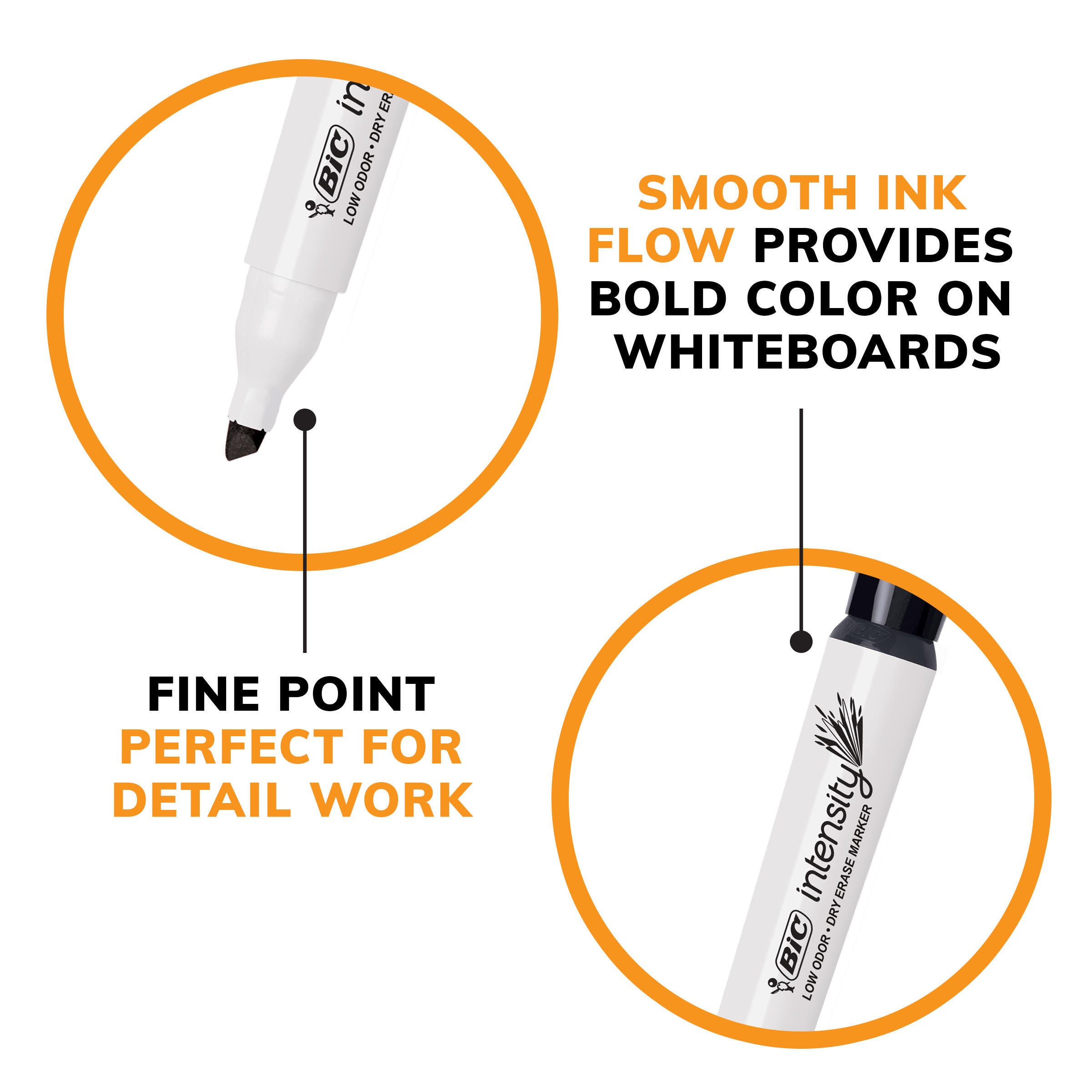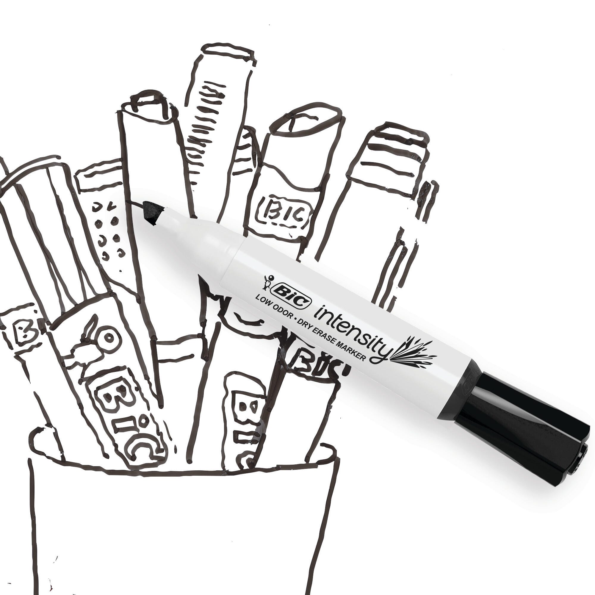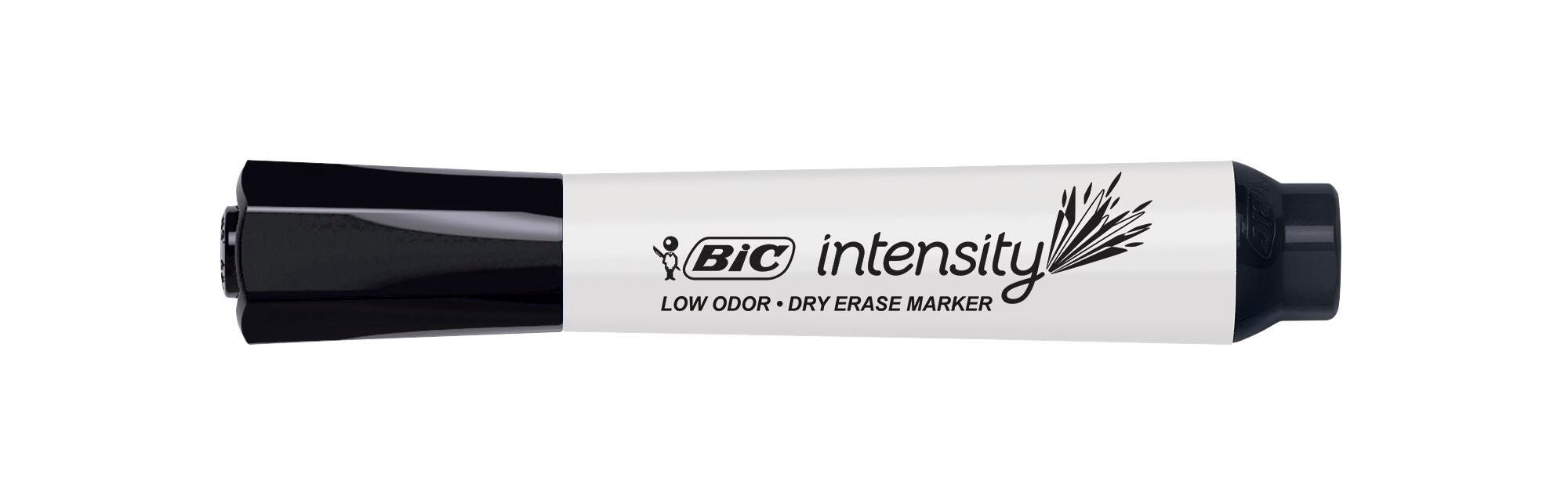 Description Bring your ideas to life in bold, consistent lines with this pack of BIC Intensity Low Odor Dry Erase Markers. They have a low-odor, non-toxic ink formula that provides smooth ink flow on non-porous surfaces. The dry-erase ink quickly wipes away with a dry cloth, tissue, or felt eraser for easy cleaning. With a large tank-style barrel, these non-toxic markers are easy to grip and offer a long-lasting ink supply that's perfect for schools and offices. This pack contains 12 black dry-erase markers.Features Smooth flowing ink delivers consistent lines on non-porous surfaces like whiteboards, glass, lap boards, and more Versatile chisel tip draws broad and fine lines, great for large lettering and coloring or detailed writing and drawing Thick tank-style barrel offers more ink and provides a comfortable, secure hold High-quality dry-erase ink wipes away with minimal smearing to keep your boards looking net and clean Nontoxic and ACMI-approved markers are safe and reliable in schools, offices, and homes
