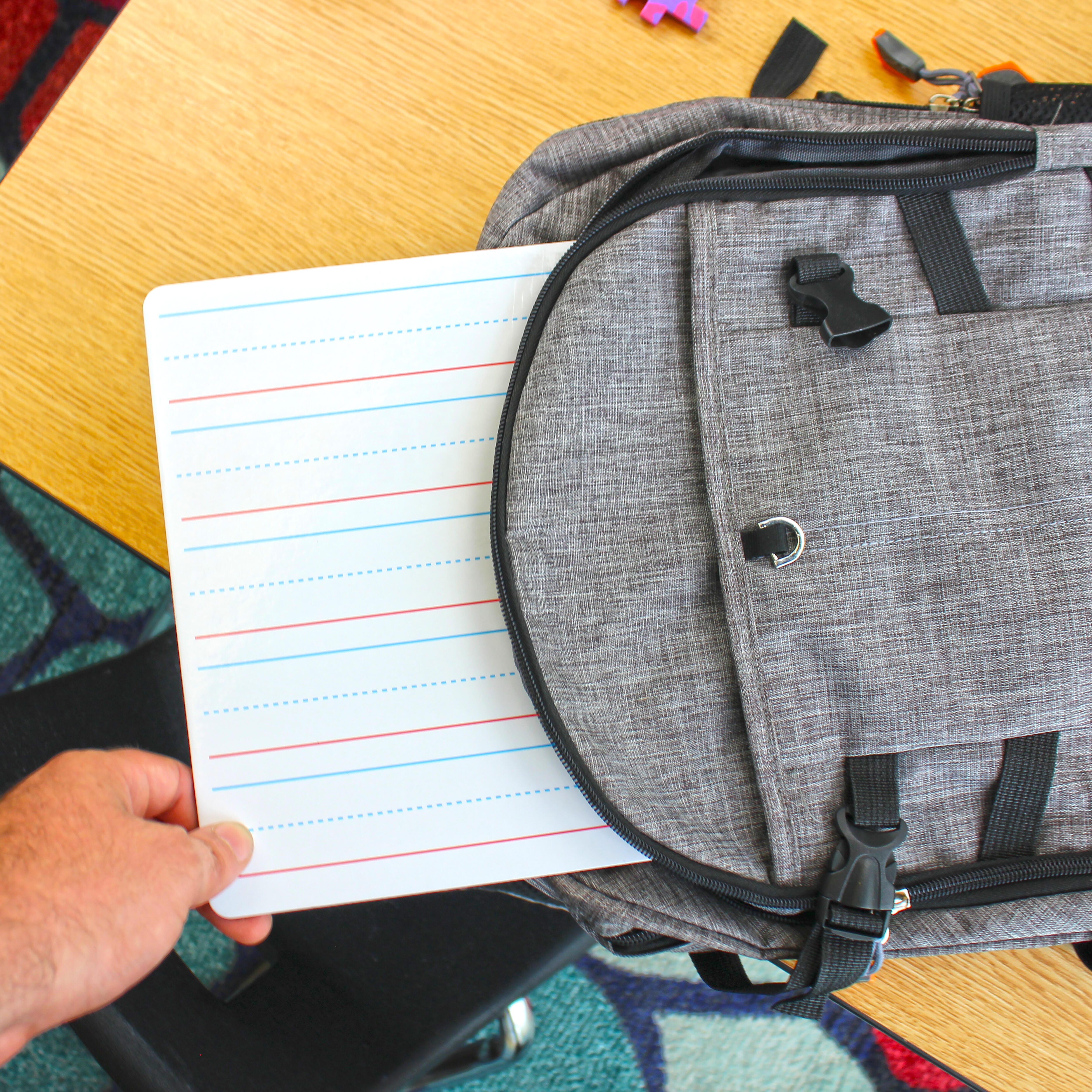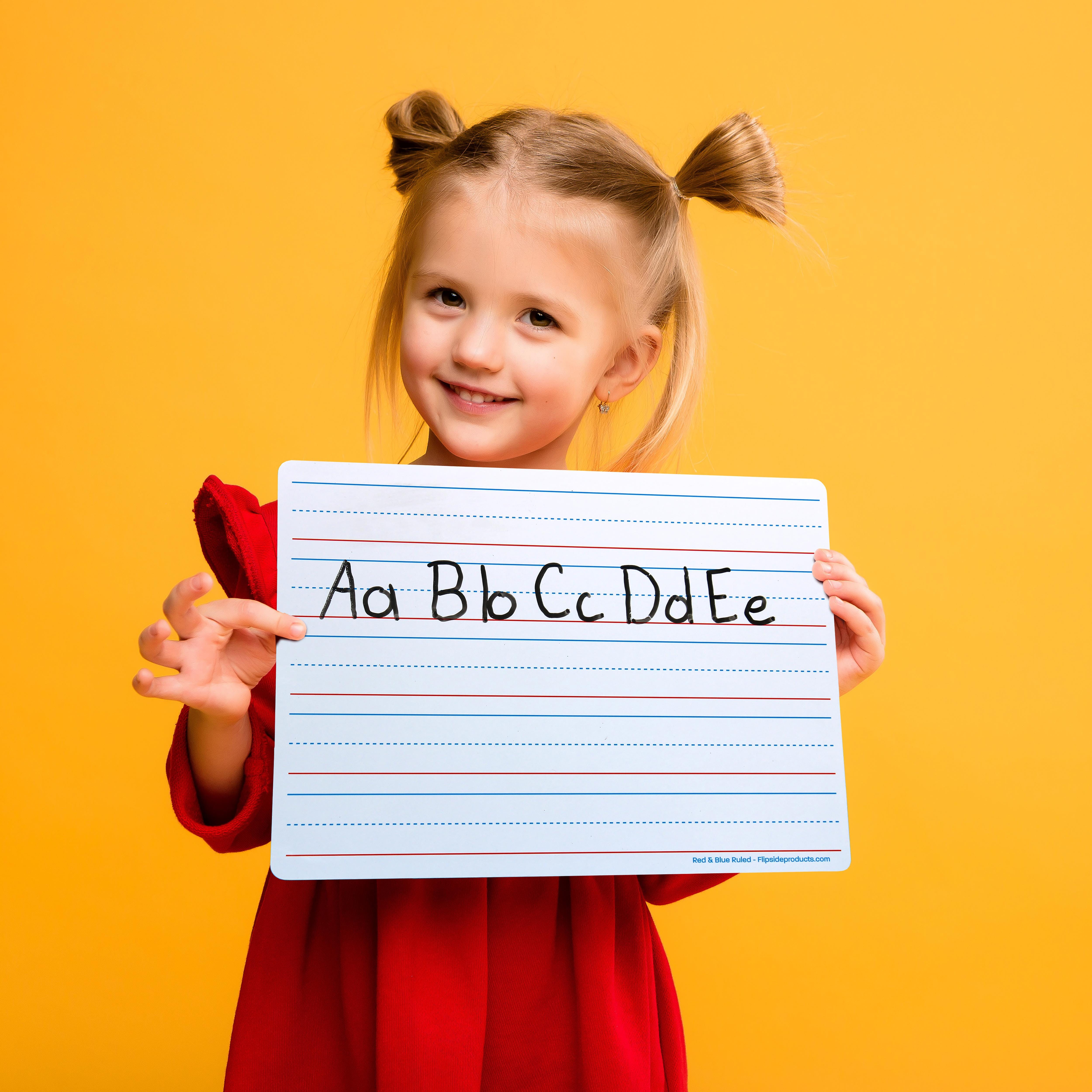 Flipside Dry Erase Classroom Set consists of 12 Lined/Plain two sided dry erase boards, 12 black dry erase pens, and 12 felt erasers. Red and blue ruled dry erase surface on one side and plain white dry erase surface on the back. Boards feature a high-quality, non-ghosting write-and-wipe surface with smooth, rounded edges and corners. Hardboard backing will not warp or chip. Boards measure 9 x 12 x 1/8 inches.