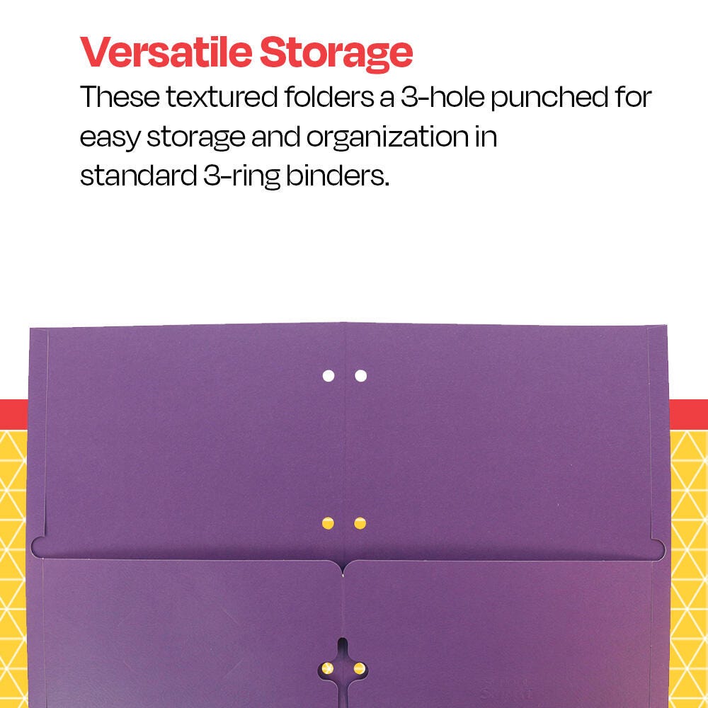 School Smart's 2-Pocket Folders hold up to 100 sheets to provide a versatile and reliable storage and organization solution for your classroom, office, or home! Their embossed leatherette texture lends a high-quality finish for both professional, school, and personal needs. The double pockets are closed on 3 sides to ensure your papers stay securely in place, while double reinforced edges provide extra durability when opening and closing. These folders are 3-hole punched to fit into any standard three-ring binder and comfortably hold 8 1/2 x 11-inch sheets. This pack of 25 folders delivers quality and value for your storage needs.
