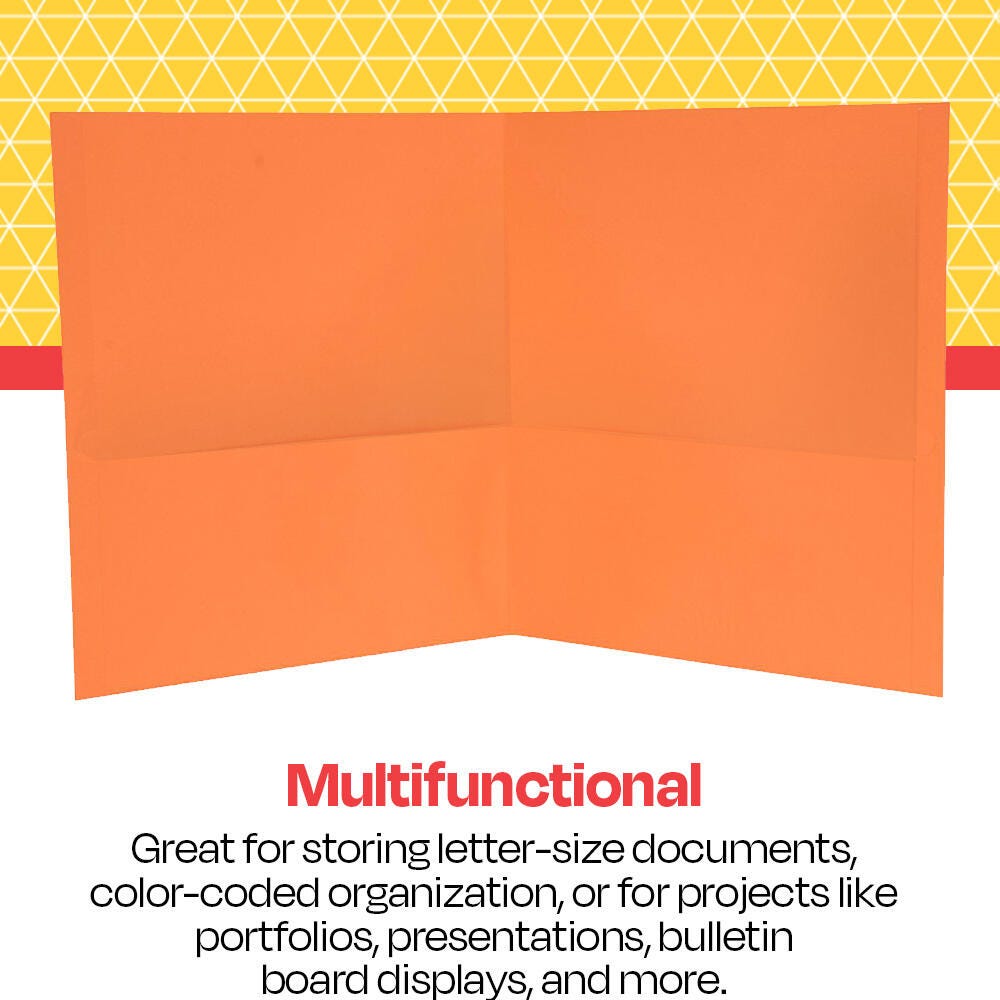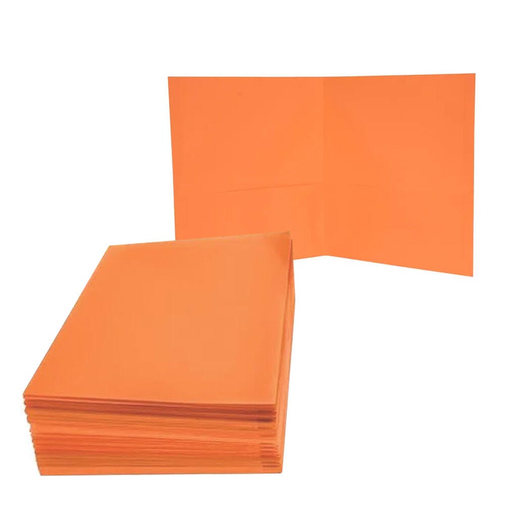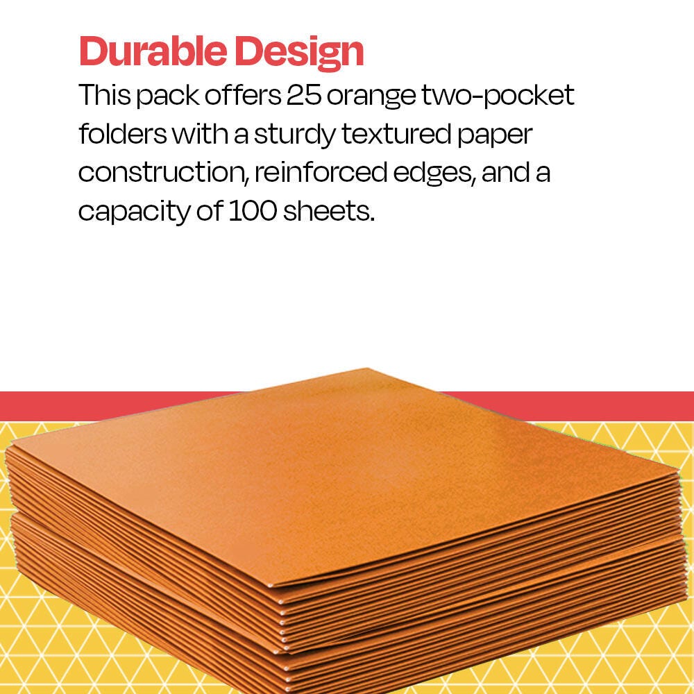 Organize and store your important documents with these 2-Pocket Folders from School Smart, which each hold up to 100 sheets! They have an embossed leatherette texture that lends a refined finish for professional, academic, and personal projects. The two interior pockets are closed on 3 sides to ensure your papers stay securely in place, while double-reinforced edges provide extra durability when opening and closing. These folders are designed to hold letter-size, 8 1/2 x 11-inch sheets. This pack contains 25 orange folders.
