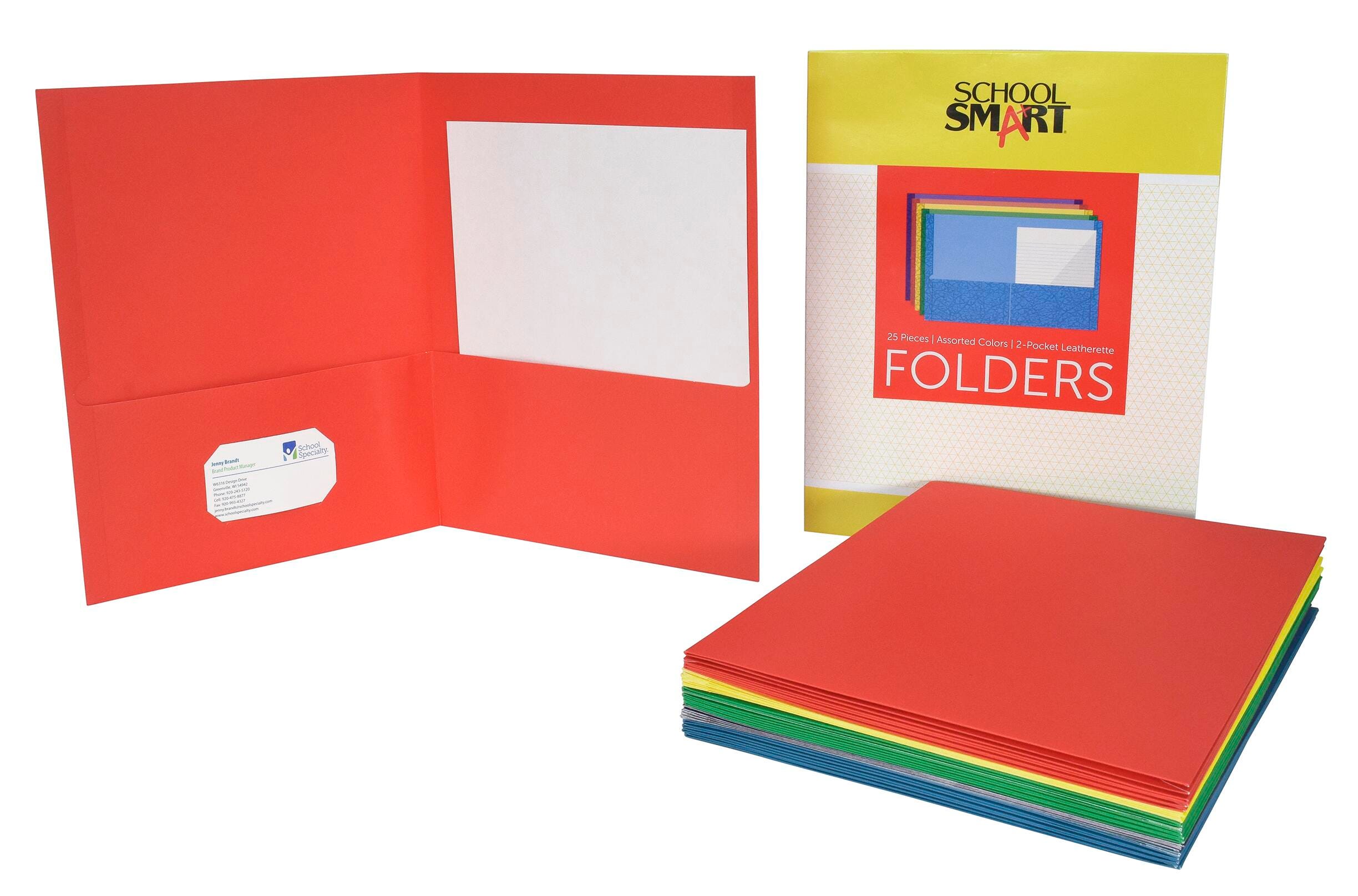 Featuring double reinforced edges, the School Smart extra large assorted color folders with pockets help protect and organize documents. An embossed finish creates a classic look for use in classrooms, offices, and homes. We also offer 2-pocket folders in solid color sets; each pack is sold separately.