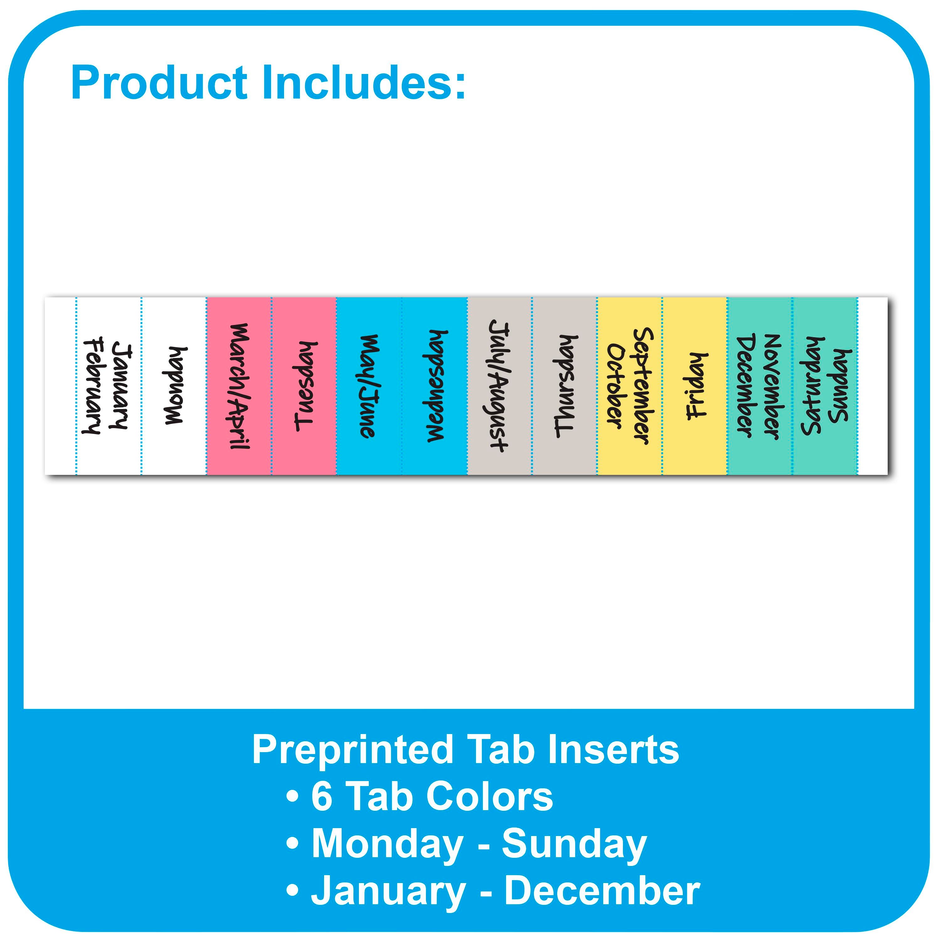 - Included pre-printed tab inserts include 6 tab colors, Monday-Sunday, and January-December templates