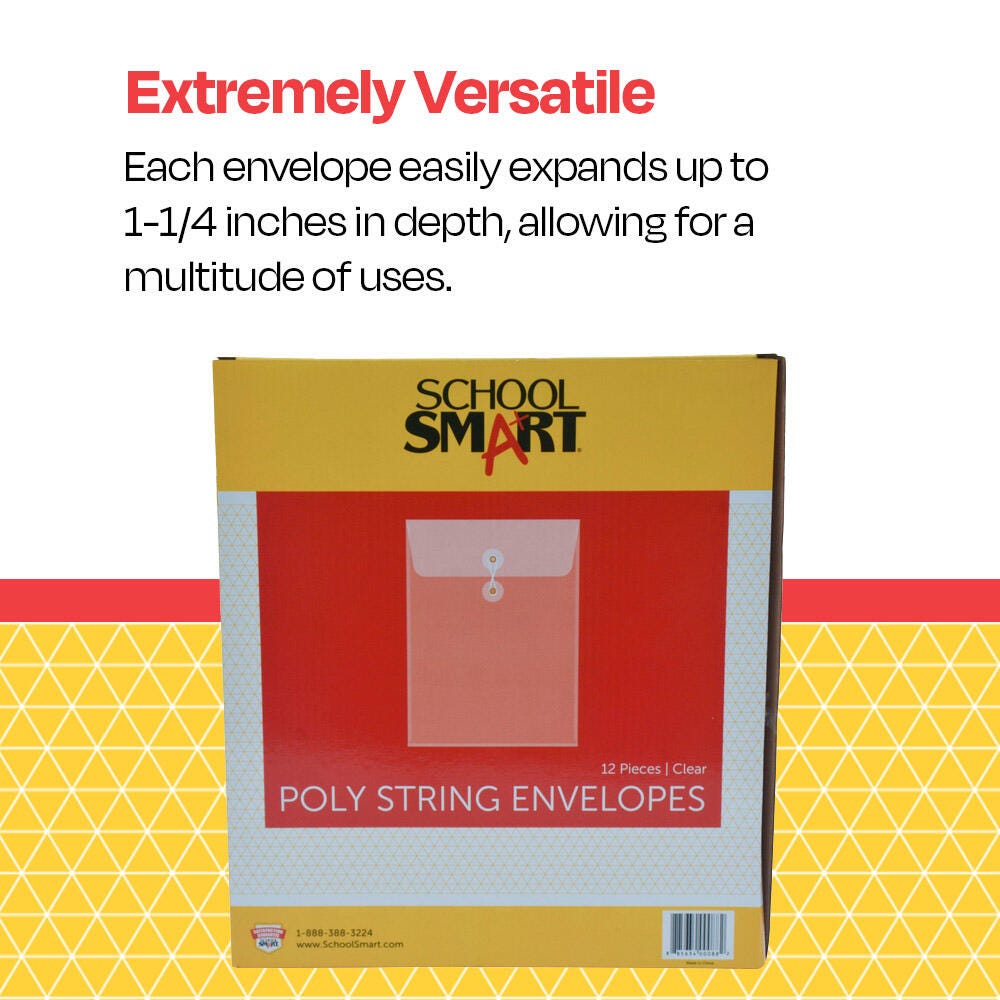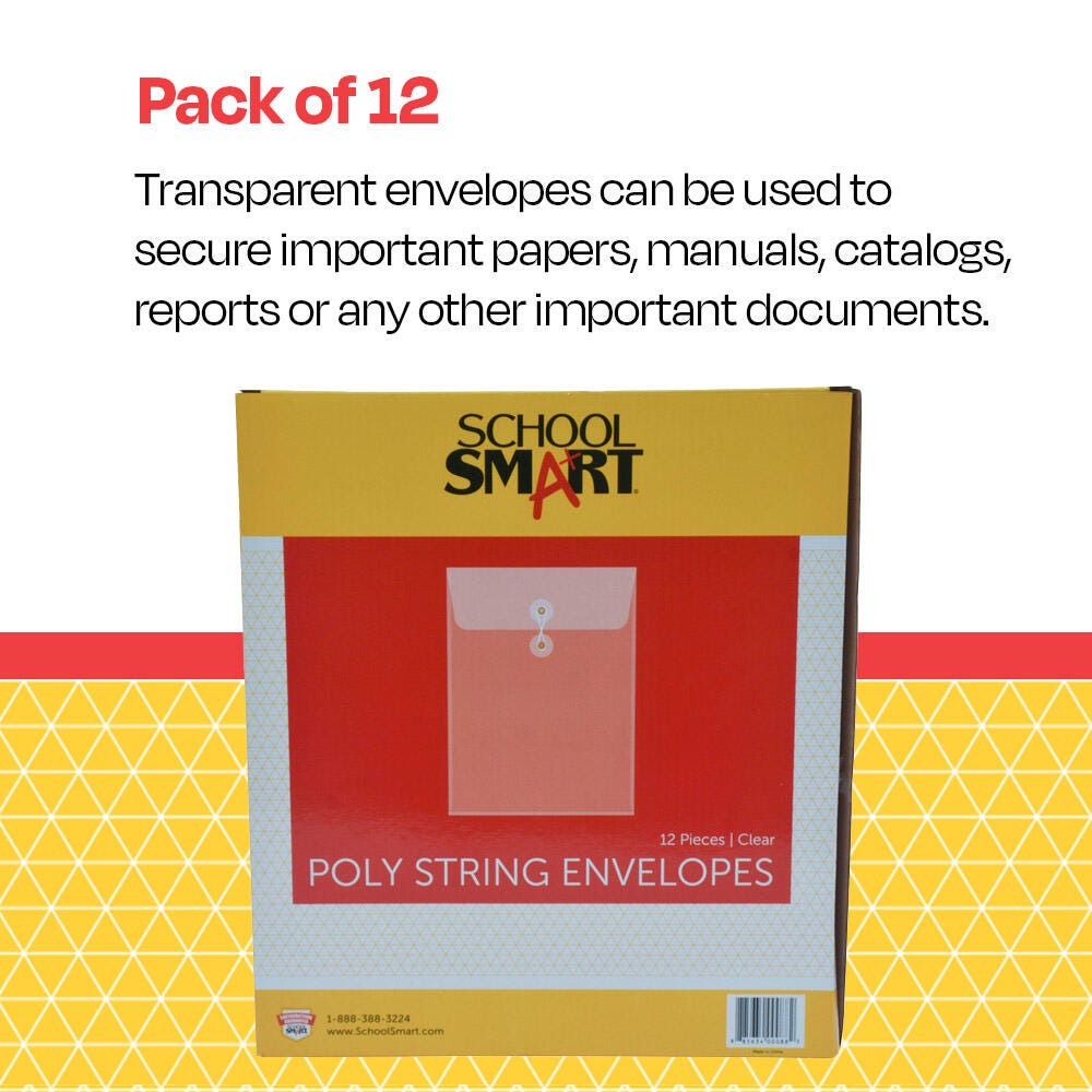 Description Keep your paperwork polished and intact with these School Smart poly envelopes. Made of transparent polypropylene that is durable and tear-resistant. Each envelope has the capacity to expand up to 1-1/4 inches. These expanding envelopes measure 9-3/4 x 11-1/2 x 1/8 inches and hold standard letter size 8-1/2 x 11 inch sheets. Sold as pack of 12.Features Built with durable materials for wear and tear resistance Translucent material allows for visibility of documents Expands 1-1/4 inches to fit thick documents, mail, catalogues and more String closure for security and easy access to documents