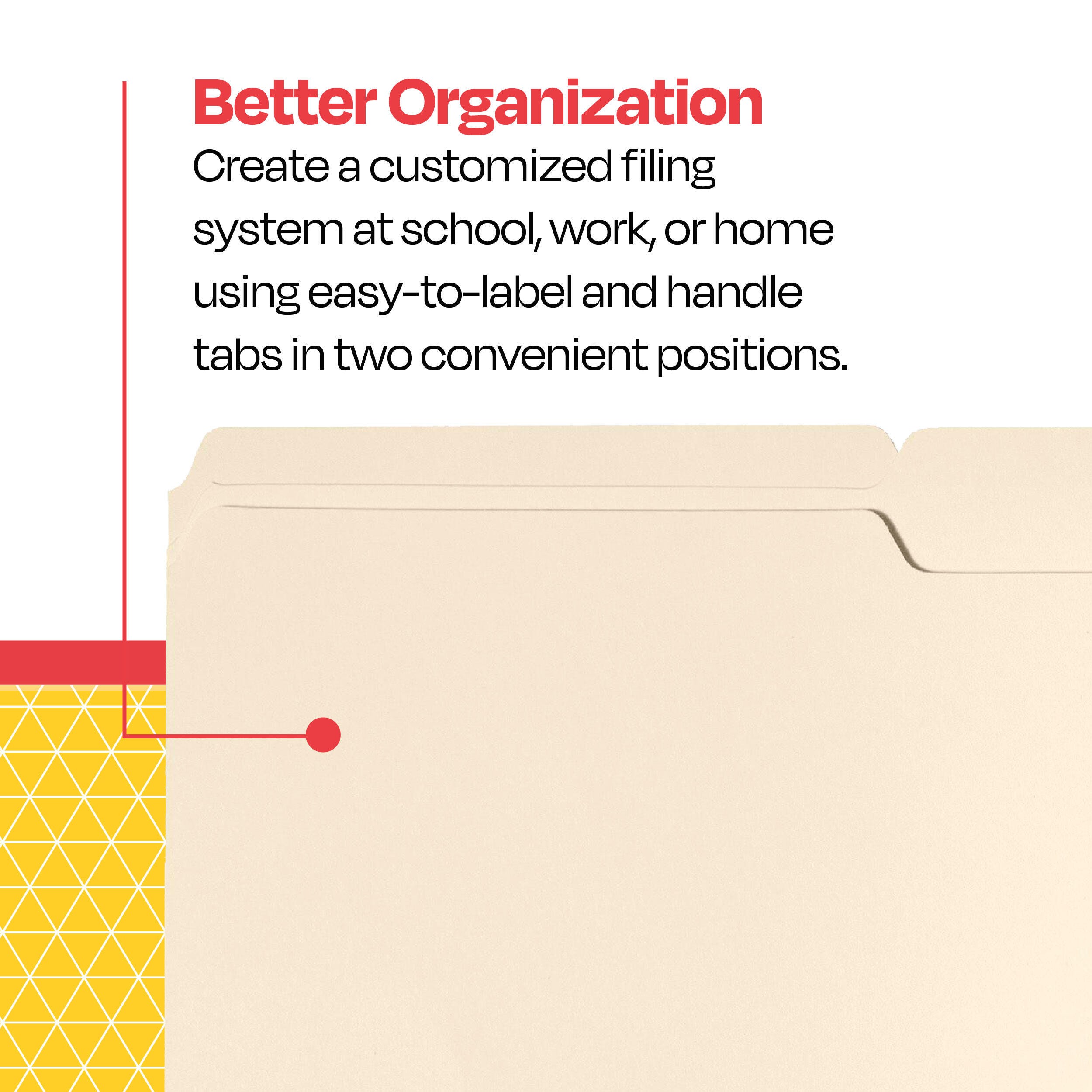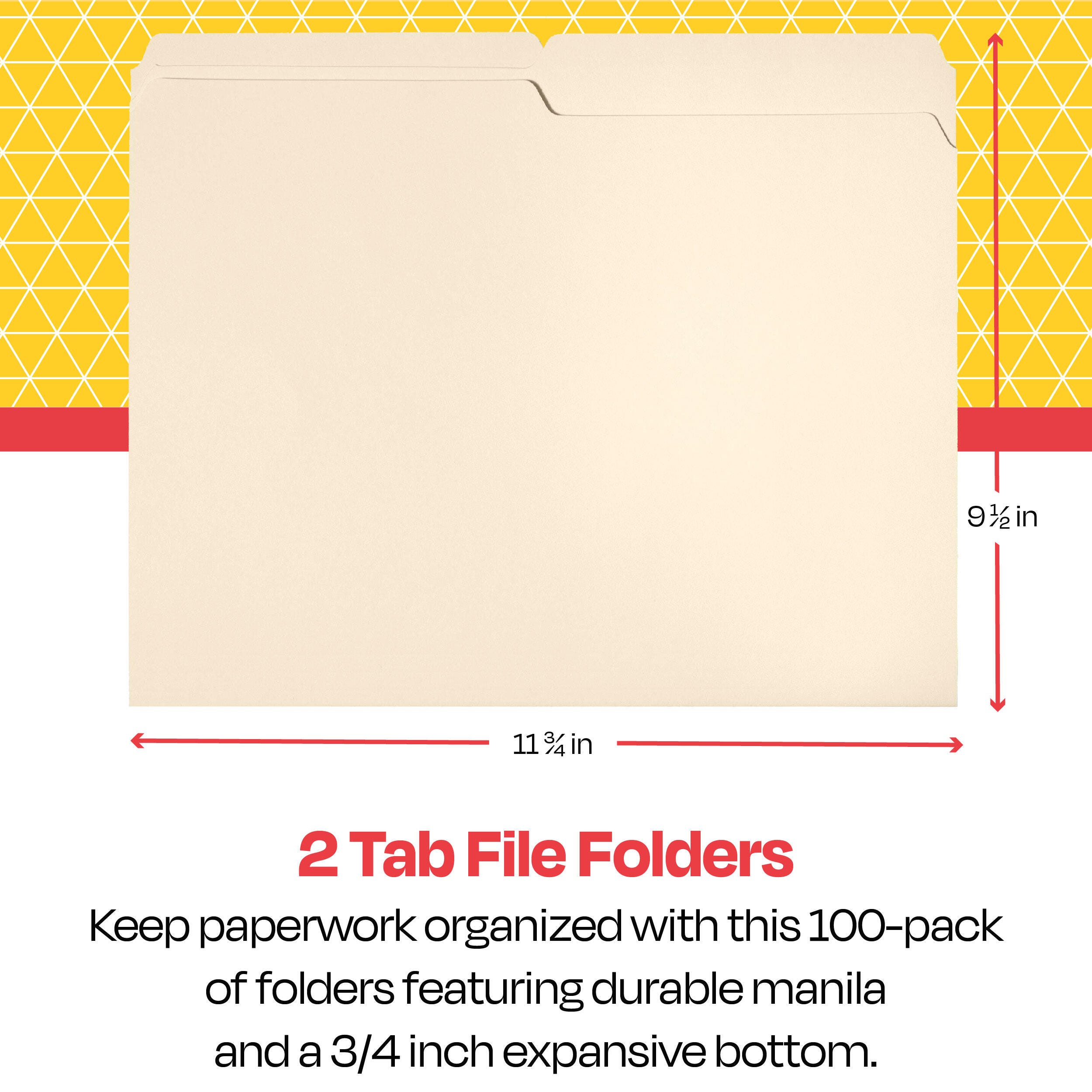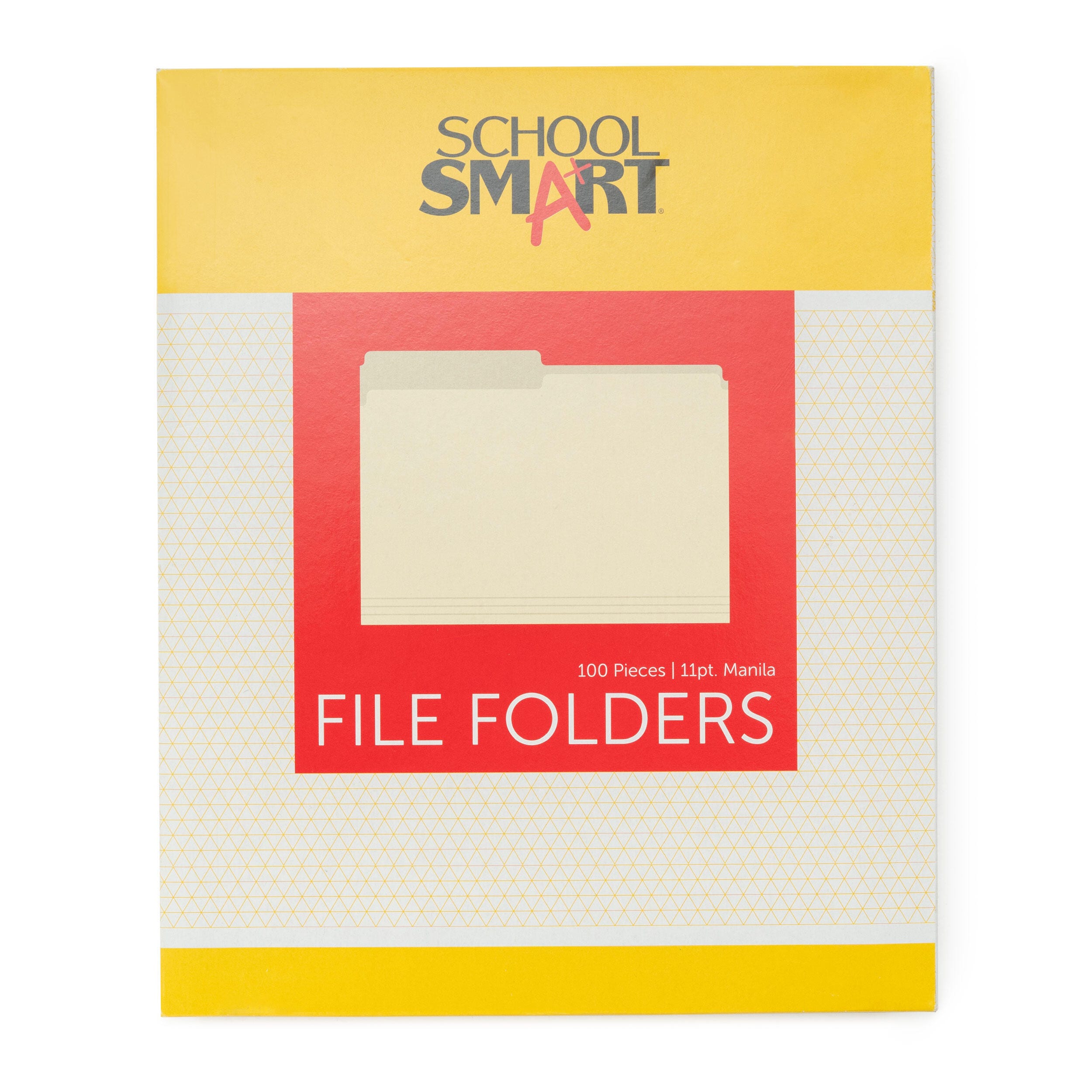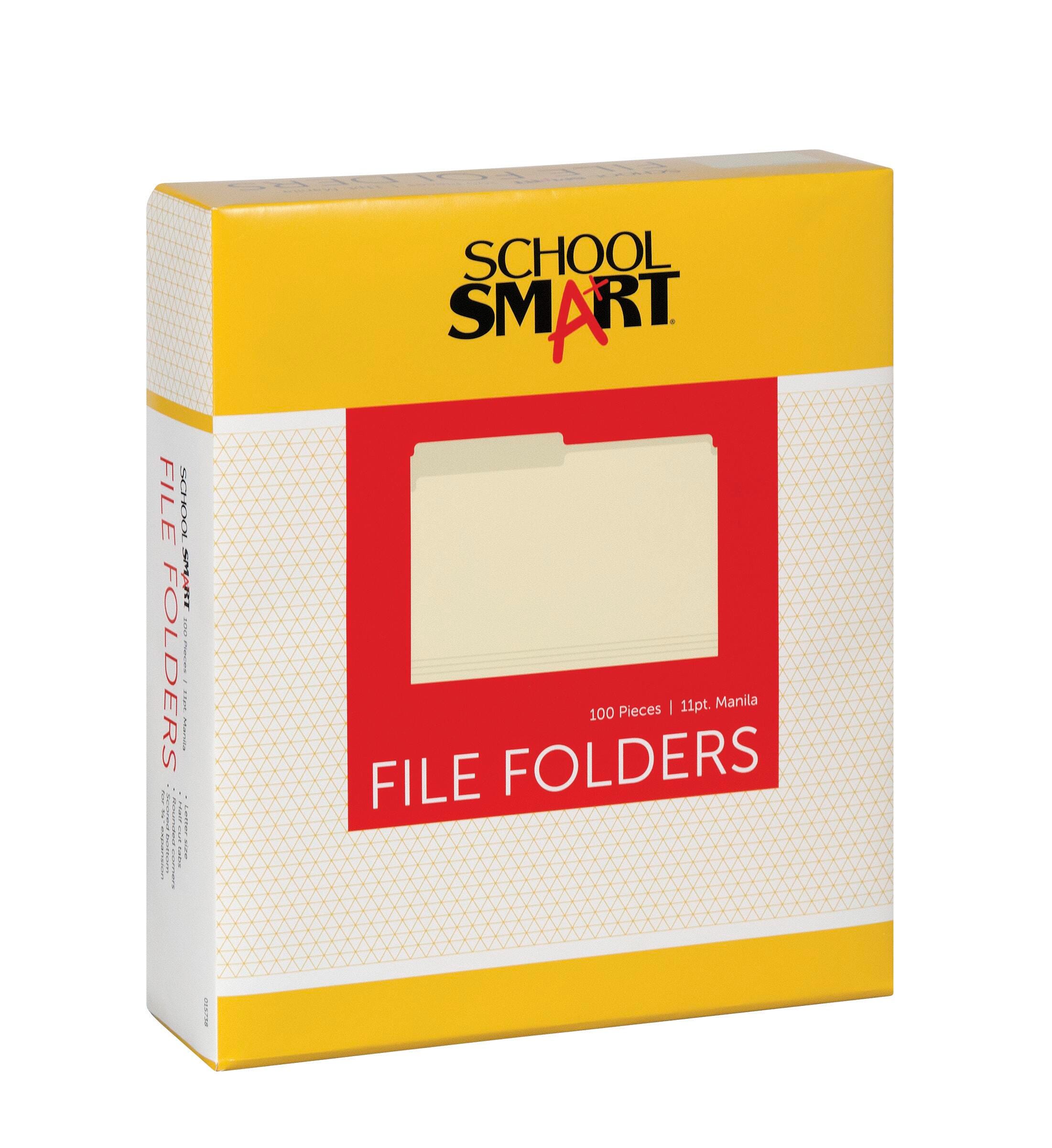Description This School Smart 100-pack of manila file folders comes in a letter size. Use the top tab filing folders for personal or professional needs. Each letter size folder measures 9-1/2 x 11-3/4 inches and is made of smooth finish, medium weight manila. The 2 tabs allow for easy labeling and sorting.Features Made of sturdy 11-pt stock for durability The bottom is scored for 3/4 inch expansion Use the letter size manila file folders to organize important documents in school, office, or home filing cabinets Includes: 100 2-Tab File Folders, Letter Size