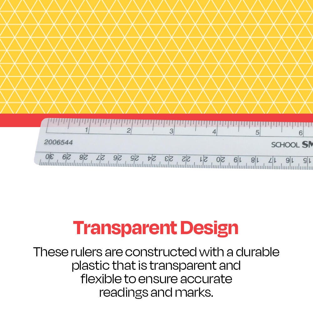 Description This School Smart flexible plastic ruler set is marked to 1/16 inches on one side and metric on the other. Thin, flexible, and see-through plastic makes our bendable rulers durable and easy to use. A flex design allows the durable metric ruler to be easily bent without breaking for use in tight corners or at odd angles. Each scale ruler has clearly black outlined inch and centimeter marks for consistent measurements each time. Kids and adults love the user-friendly 12 inch measuring tool.Features Made with inch and metric system marks Constructed with durable clear plastic Transparent plastic design makes measuring easy Economically priced to fit your budget Includes: 36 Flexible Clear Plastic Rulers