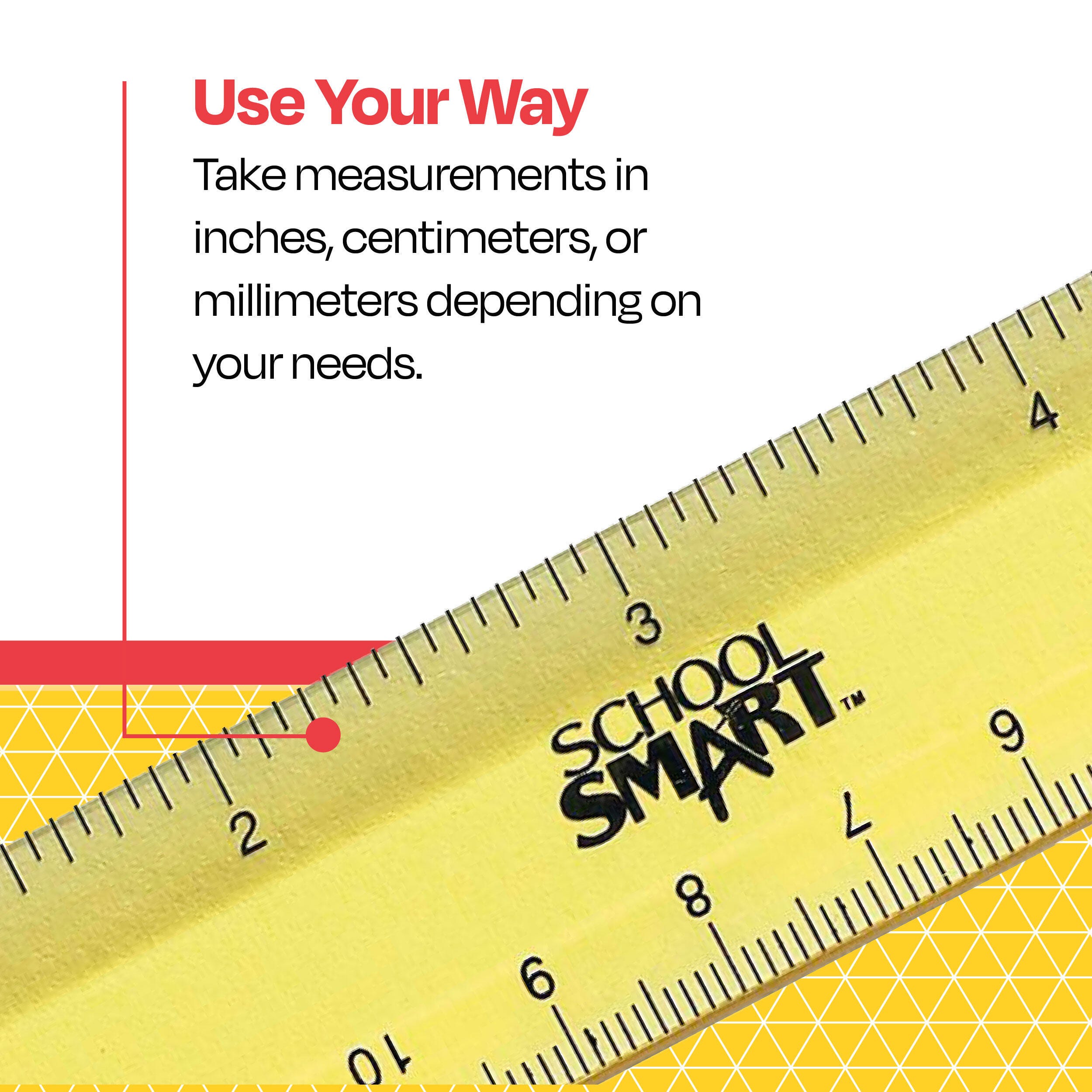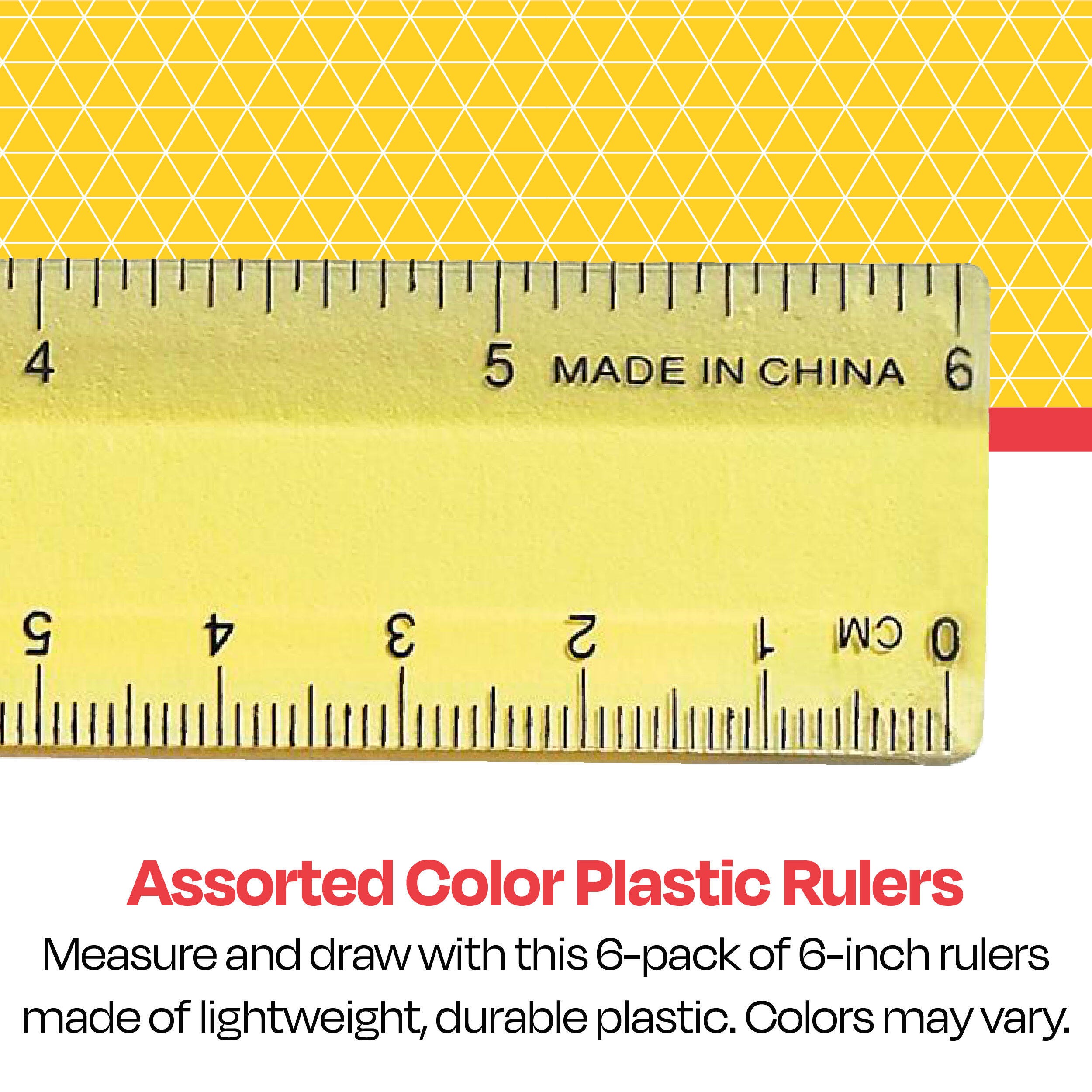 Description School Smart 6 inch plastic rulers are strong and lightweight for everyday use by students. The colored rulers feature inch and millimeter calibrations for precise measurements. Sharply defined markings are easy to read, and the plastic straight ruler comes in a short, easy-to-carry size.Features Lightweight rulers are great for math and geometry schoolwork and homework A short size allows for easy storage in pencil cases, desks, and backpacks Made with lightweight, but durable plastic materials Value set provides quality and value for classrooms, offices, and homes