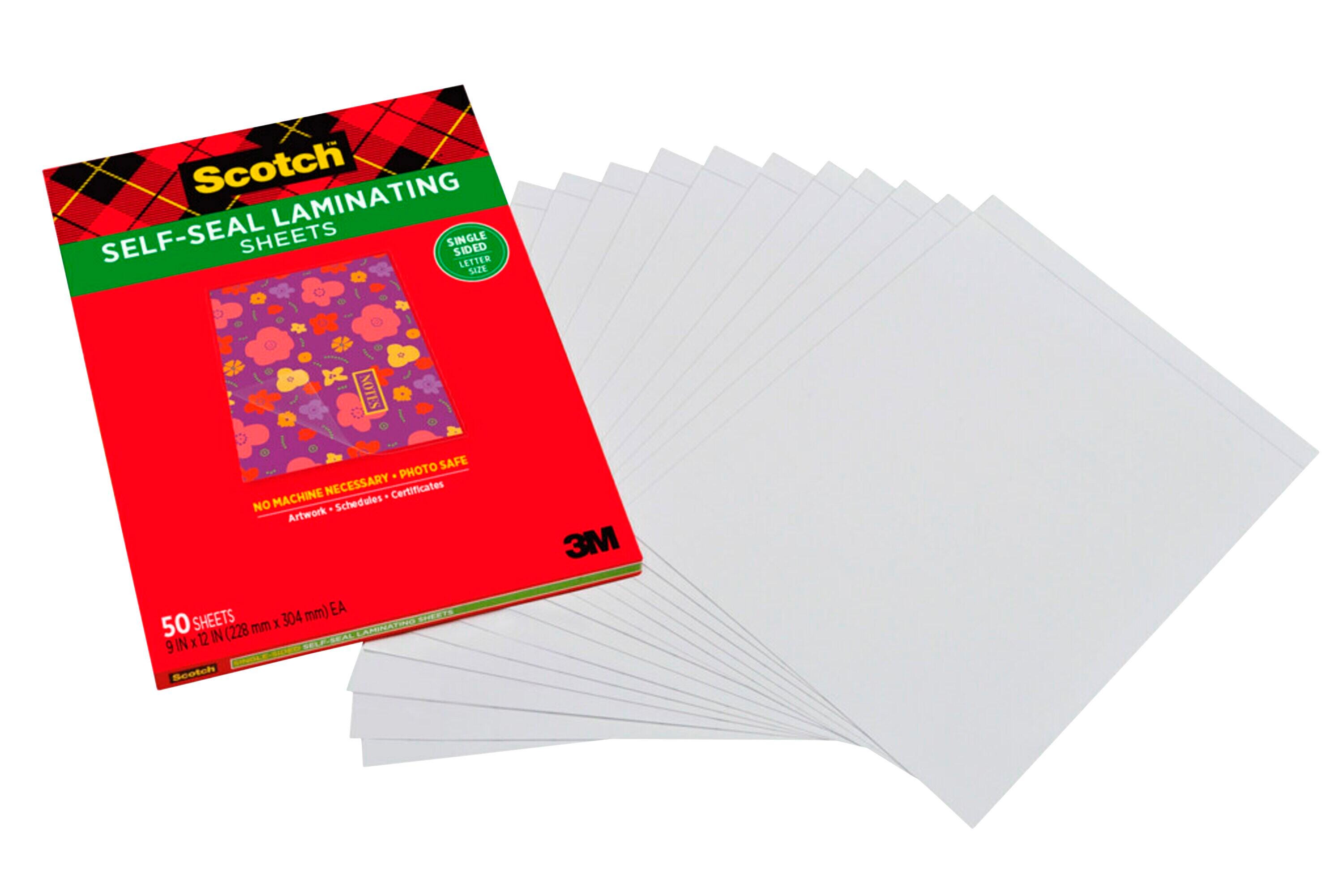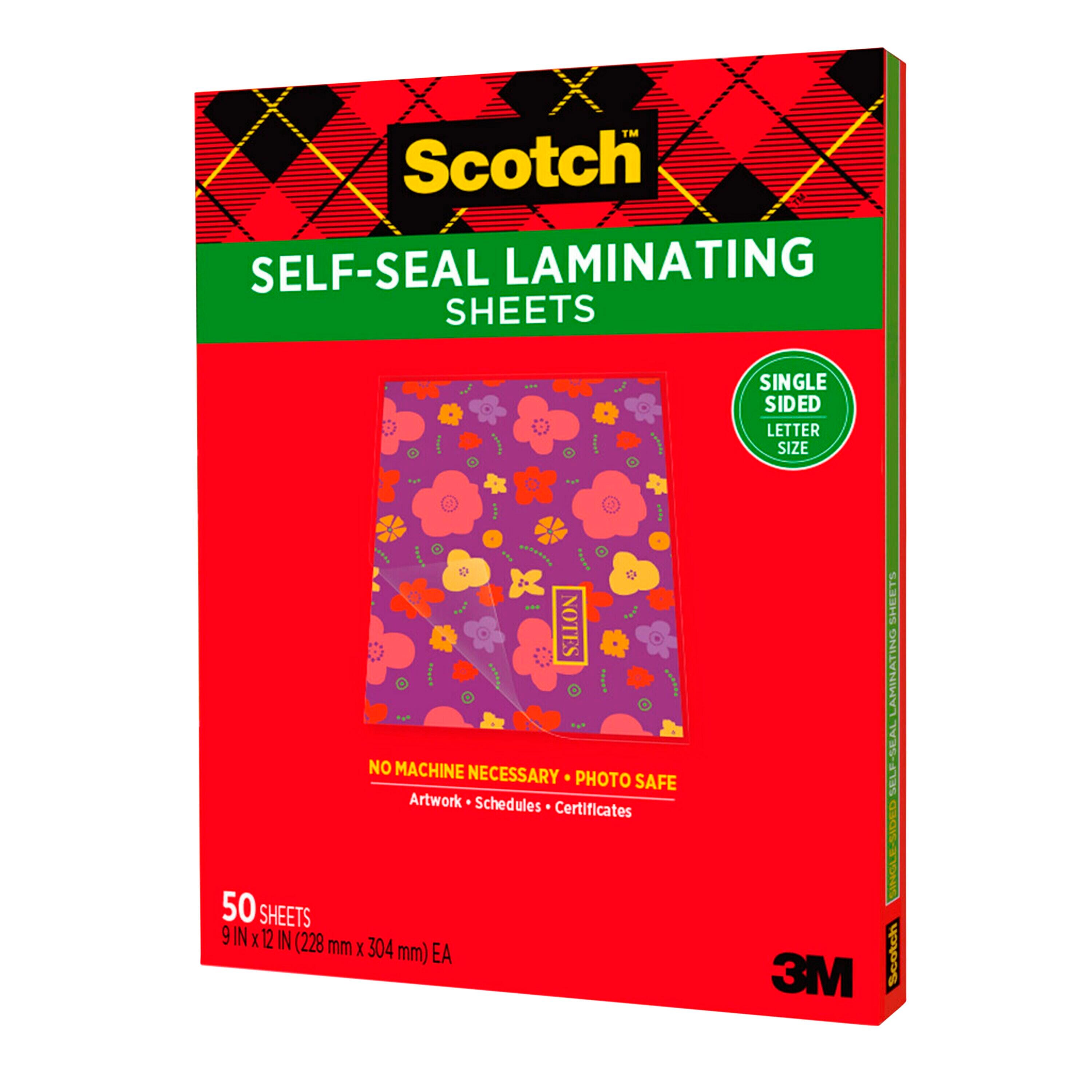 Scotch self-seal single sided laminating sheet protects your larger documents and is easy to use. Single sided sheet is ultra-clear to let important information show through and provides instant, permanent document laminating without heat or hassle. Letter size sheet is sold as 50 per pack. Laminating sheet size is 9 x 12 inches to laminate a 8-1/2 x 11 inch document.