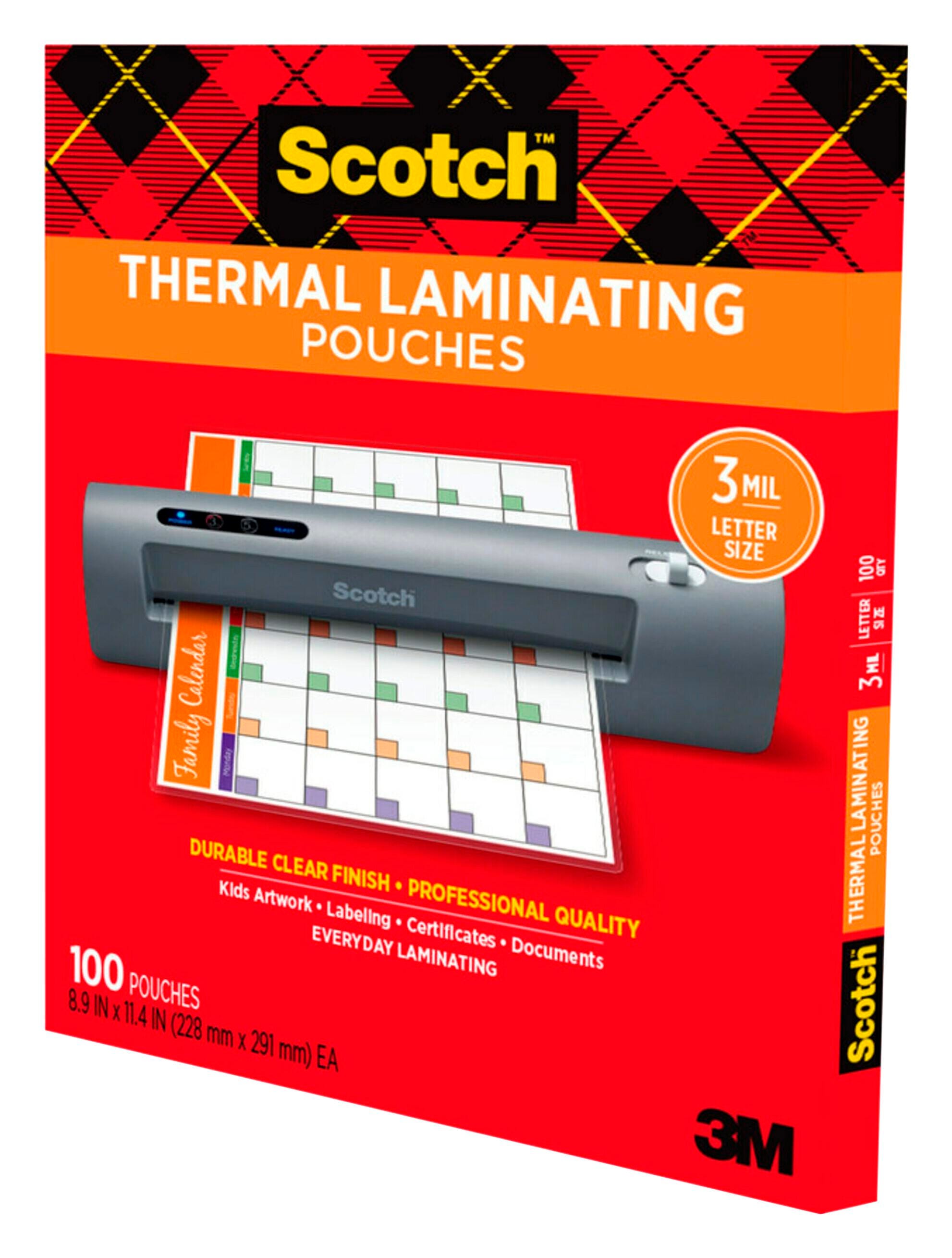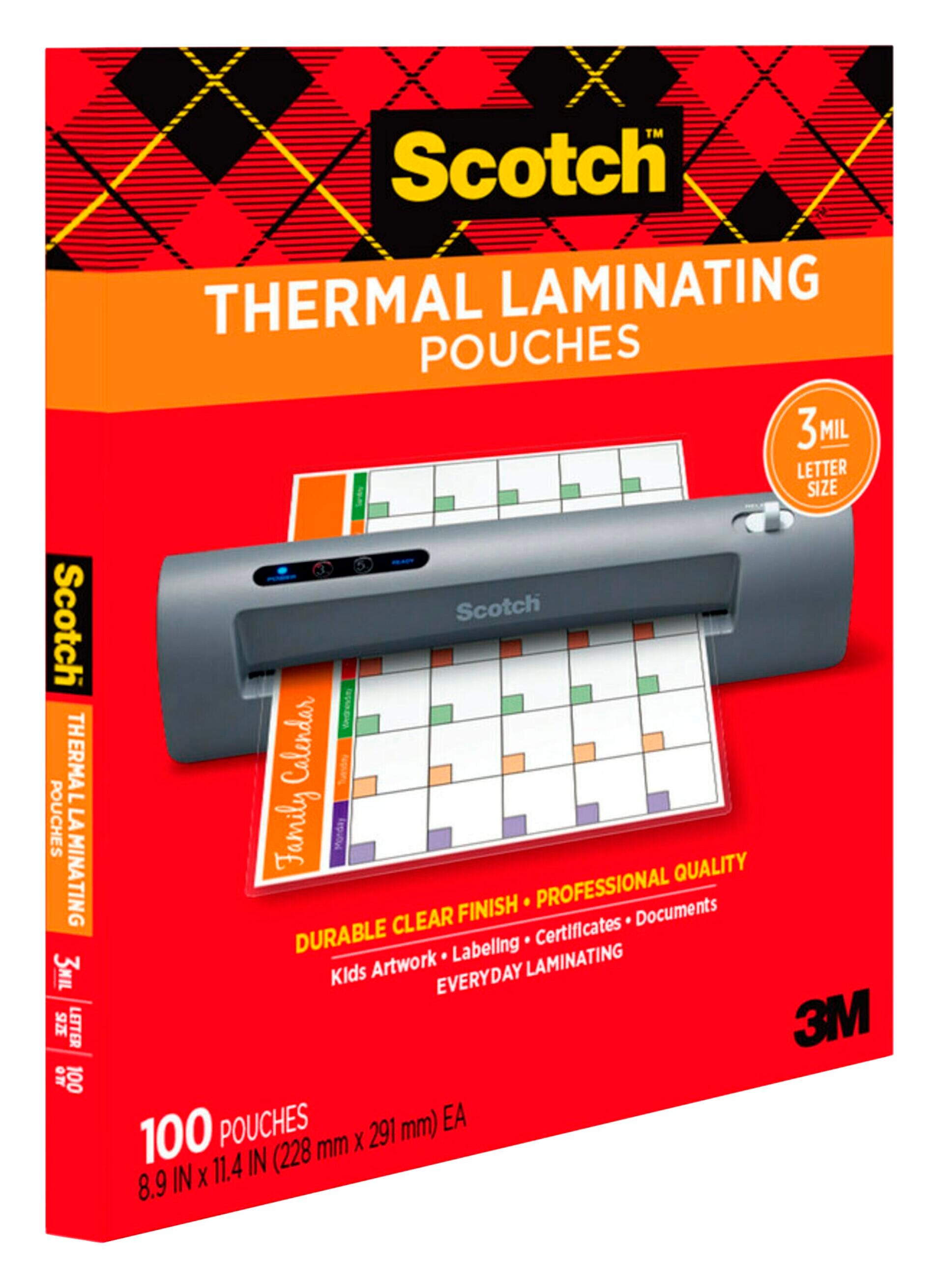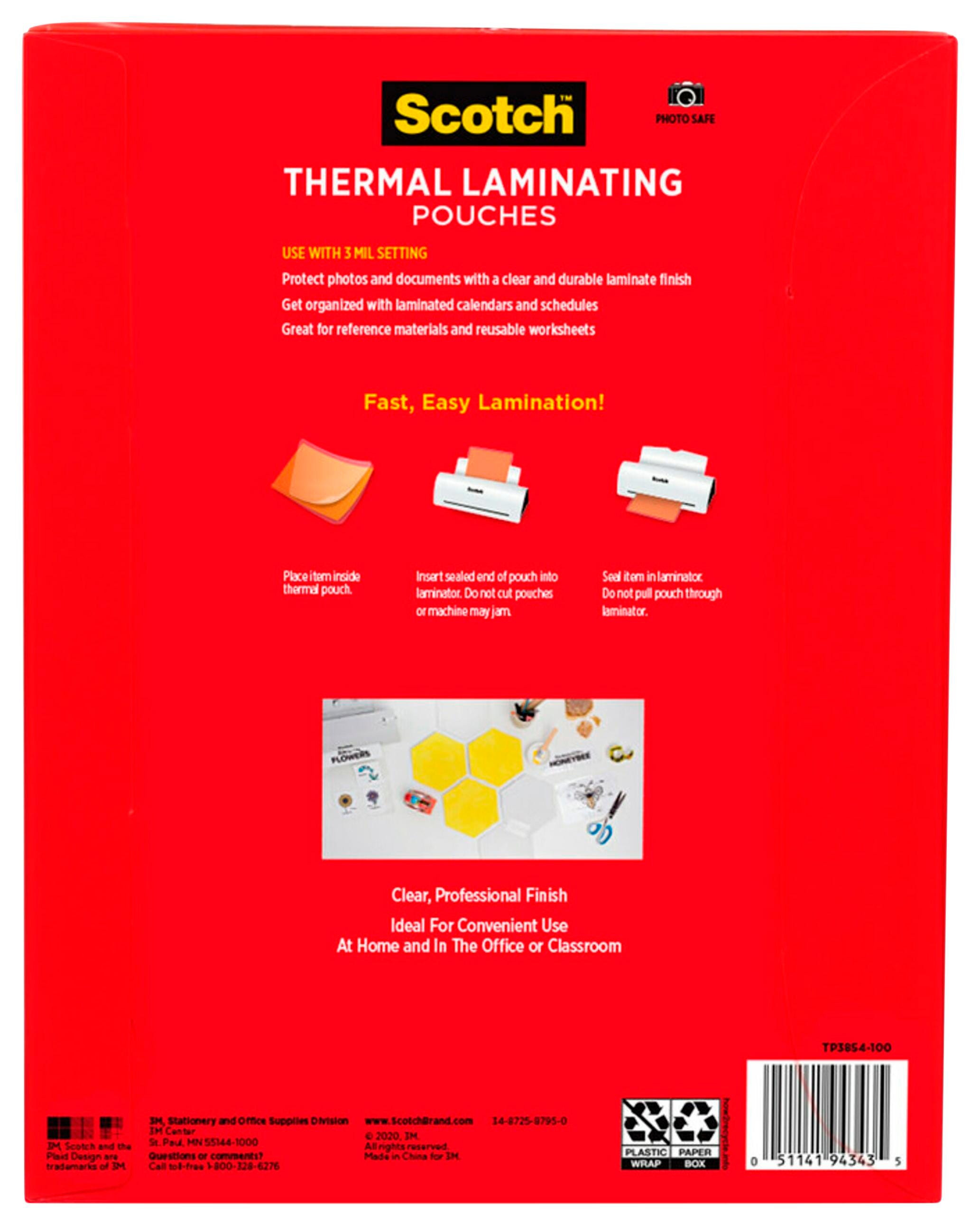 These Letter-Size Scotch Thermal Laminating Pouches are a must-have for protecting important or frequently used documents. The laminating pouches measure approximately 9 x 11-1/2 inches and are designed to protect standard letter-size, 8-1/2 x 11-inch documents. A clear design offers excellent visibility of the laminated materials, while the 3 mil thickness adds durable protection. This pack contains 100 thermal laminating pouches.