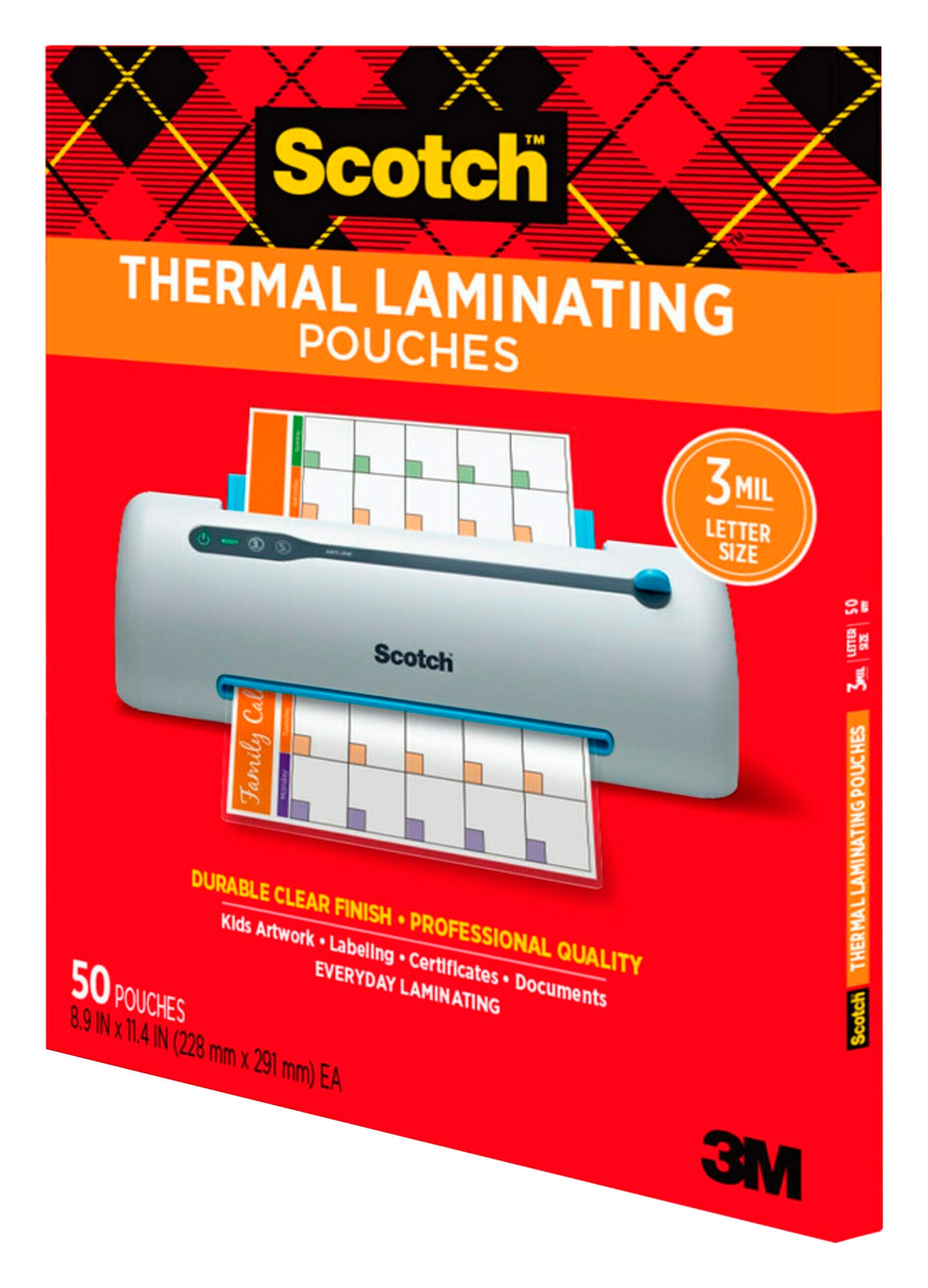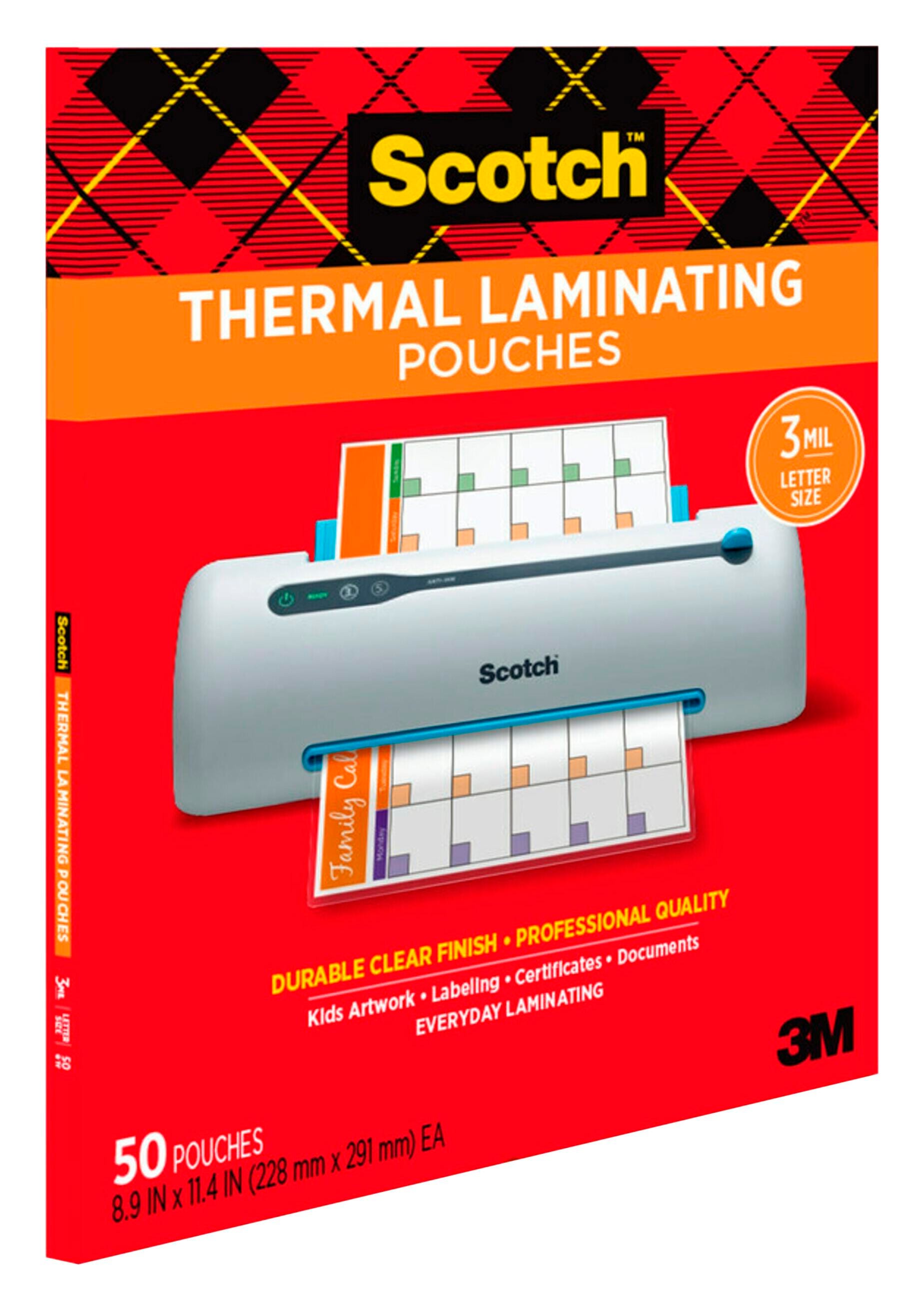 This pack of Scotch Thermal Laminating Letter Size Pouches contains 50 pouches, each measuring 9 x 11-1/2 inches to fit standard size 8-1/2 x 11 inch documents. This durable laminate protects your most important or frequently used documents. Clear to allow easy viewing of important information, the laminate can be used to lend a professional finishing touch to business documents certificates, photos, signs, and more. Pack of 50.