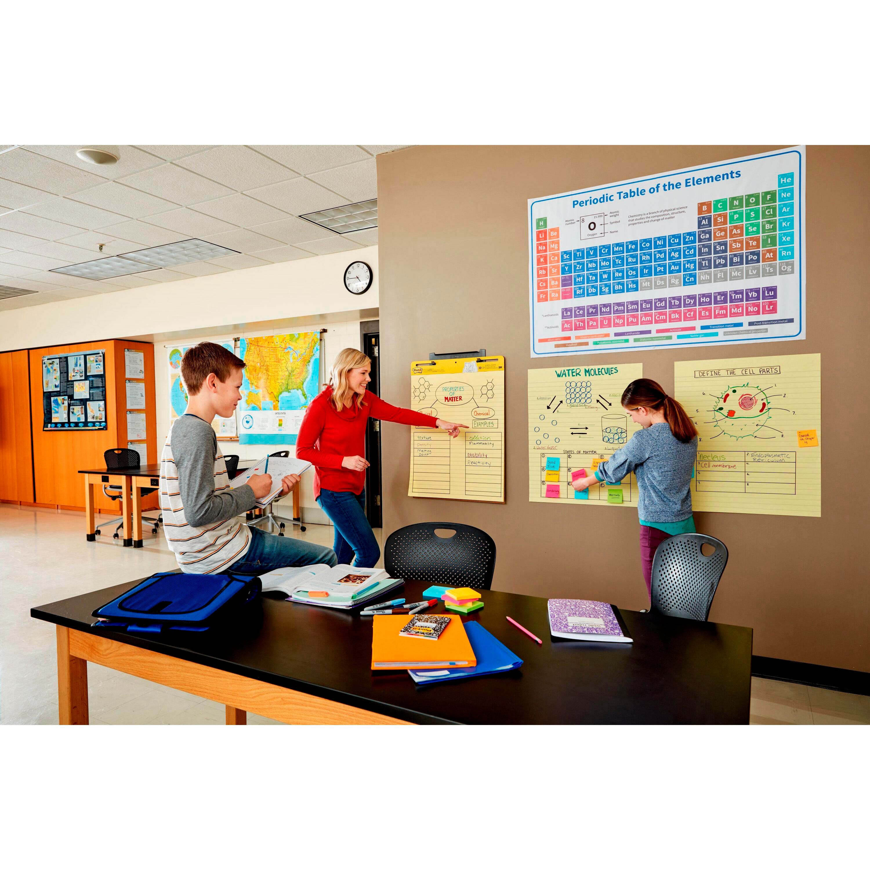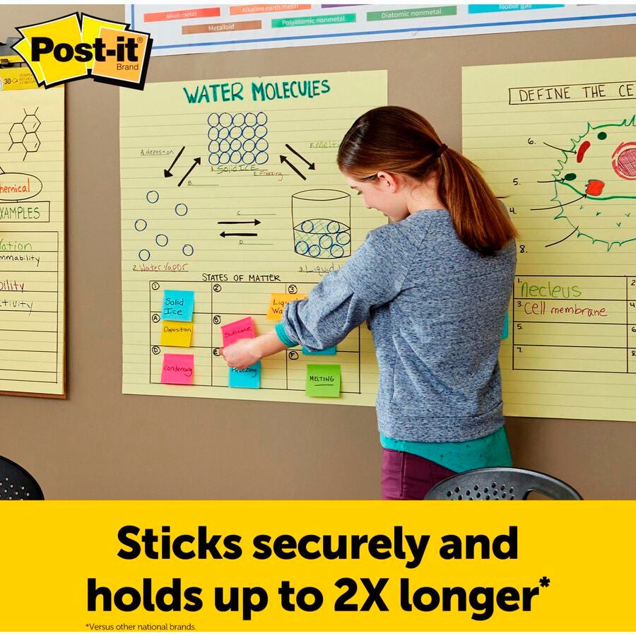The Post-it Easel Pads have ruled sheets that can stick almost anywhere, perfect for demonstrations in the classroom, individual brainstorming, project checklists, and much more. Each pad features premium, bleed-resistant paper that sticks to most surfaces and can be repositioned again and again without surface damage. The sturdy backcard features a handle for easy portability and universal slots to fit most easel stands. These pads have ruled sheets that keep writing neat, and measure 25 x 30 inches.