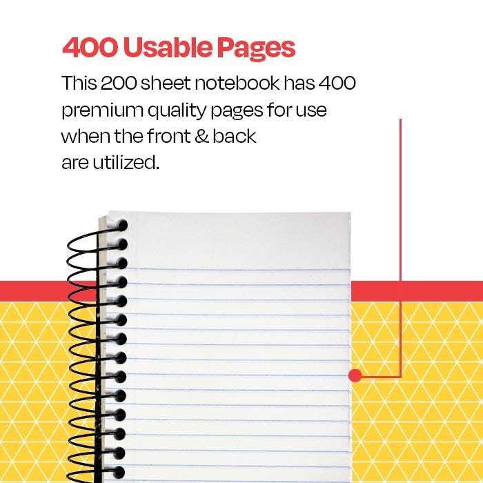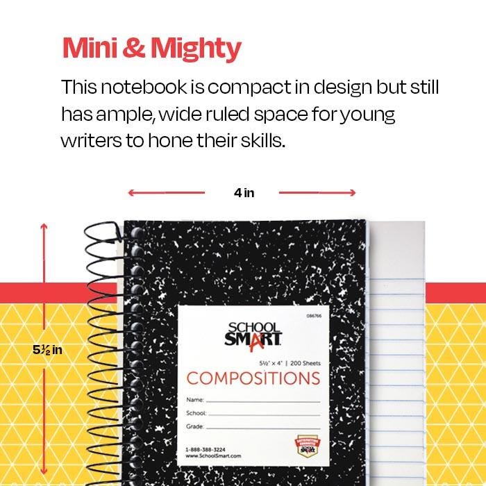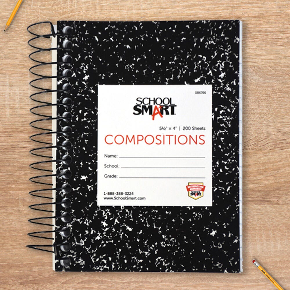 Description The School Smart Spiral Mini Composition Notebook contains 200 sheets of white, sulphite bond paper with a 3/8 inch wide rule. Both sides are ruled with no margins for 400 pages of space to jot down study notes or to catch up on journaling. The small size of this notebook makes it ideal for taking notes on the go and storing in a backpack or small bag.