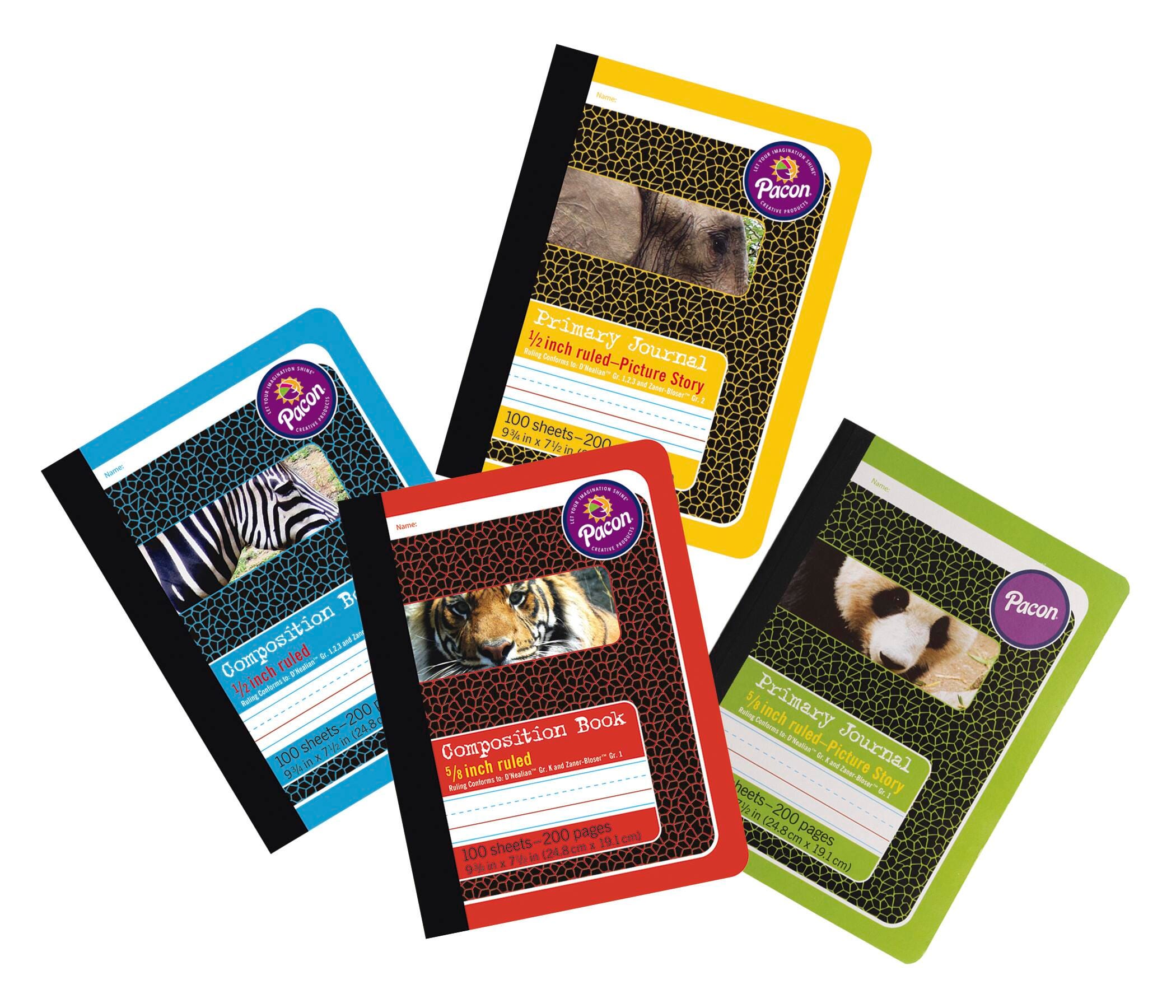 Pacon Picture Story Composition Book measuring 9-3/4 x 7-1/2 inches features colorful hard cover that makes finding the grade level and ruling easy. 5/8 in Ruled book with 100 sheets/200 pages is perfect for tracking progress. It has alphabet printed inside front cover and conforms to Zaner-Bloser as well as D'Nealian handwriting styles.