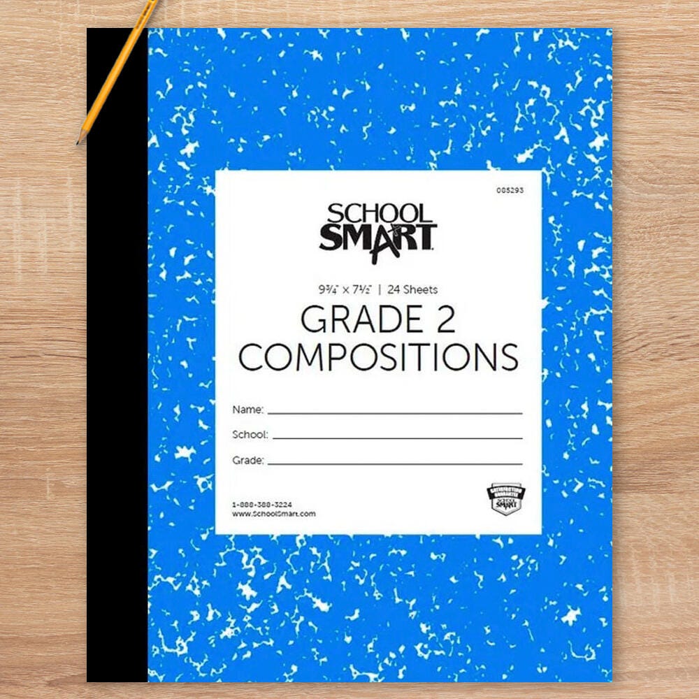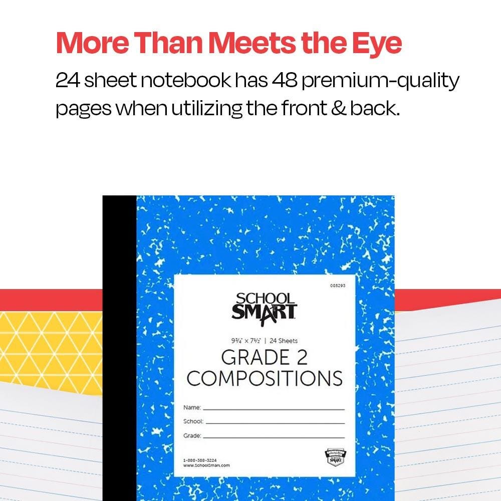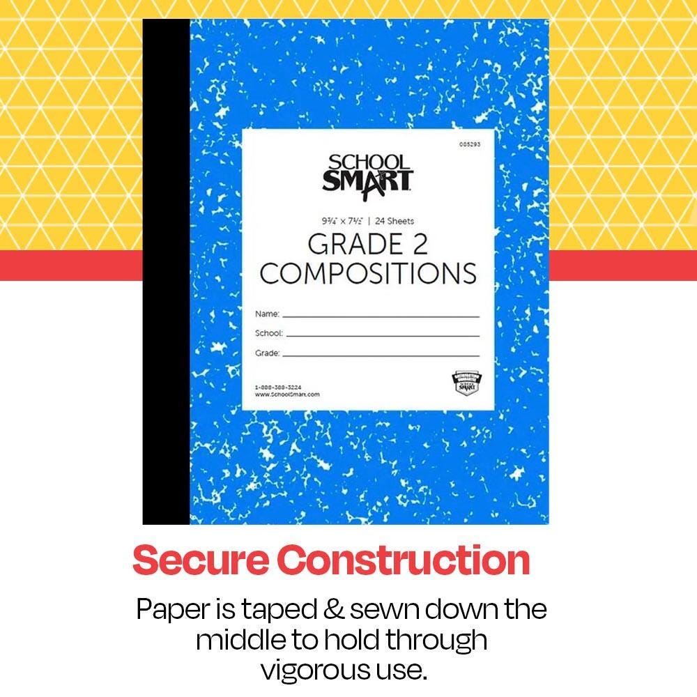 Description Grade 2 Composition Books measure 9-3/4 x 7-1/2 inches and have a flexible blue marble pattern cover. Books contain 24 sheets 48 pages with 3/4-inch ruling and a 3/8 inch red margin and a skip space that offers room for beginning writers.