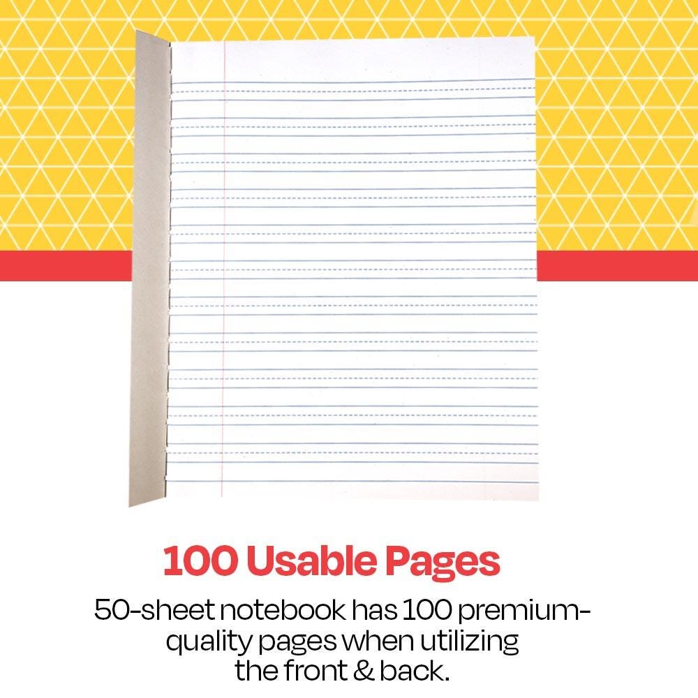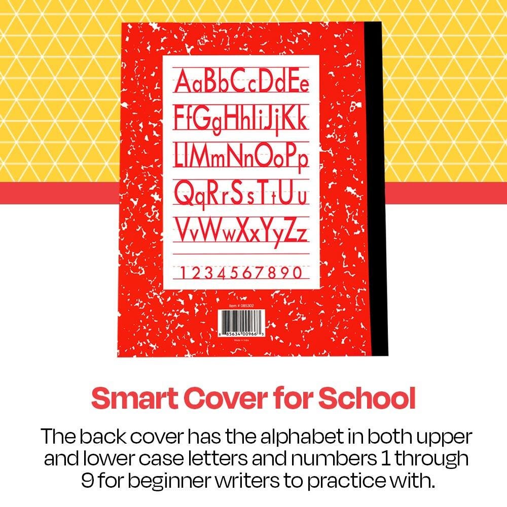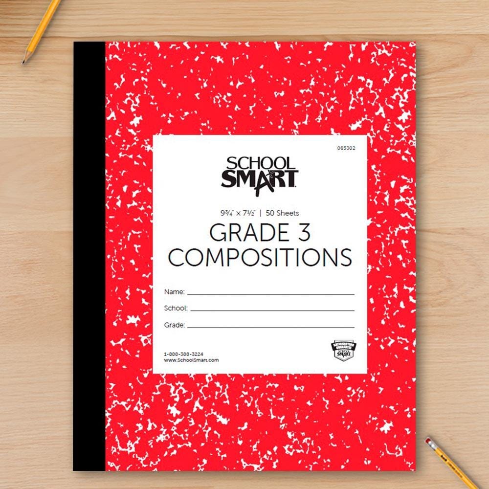 The School Smart Grade 3 Composition Book measures 9-3/4 x 7-1/2 inches and has a flexible red marble pattern cover. The book contains 50 sheets (100 pages front and back) with a 3/8 inch ruling, a 3/16 inch red margin, and a skip space that offers room for beginning writers.