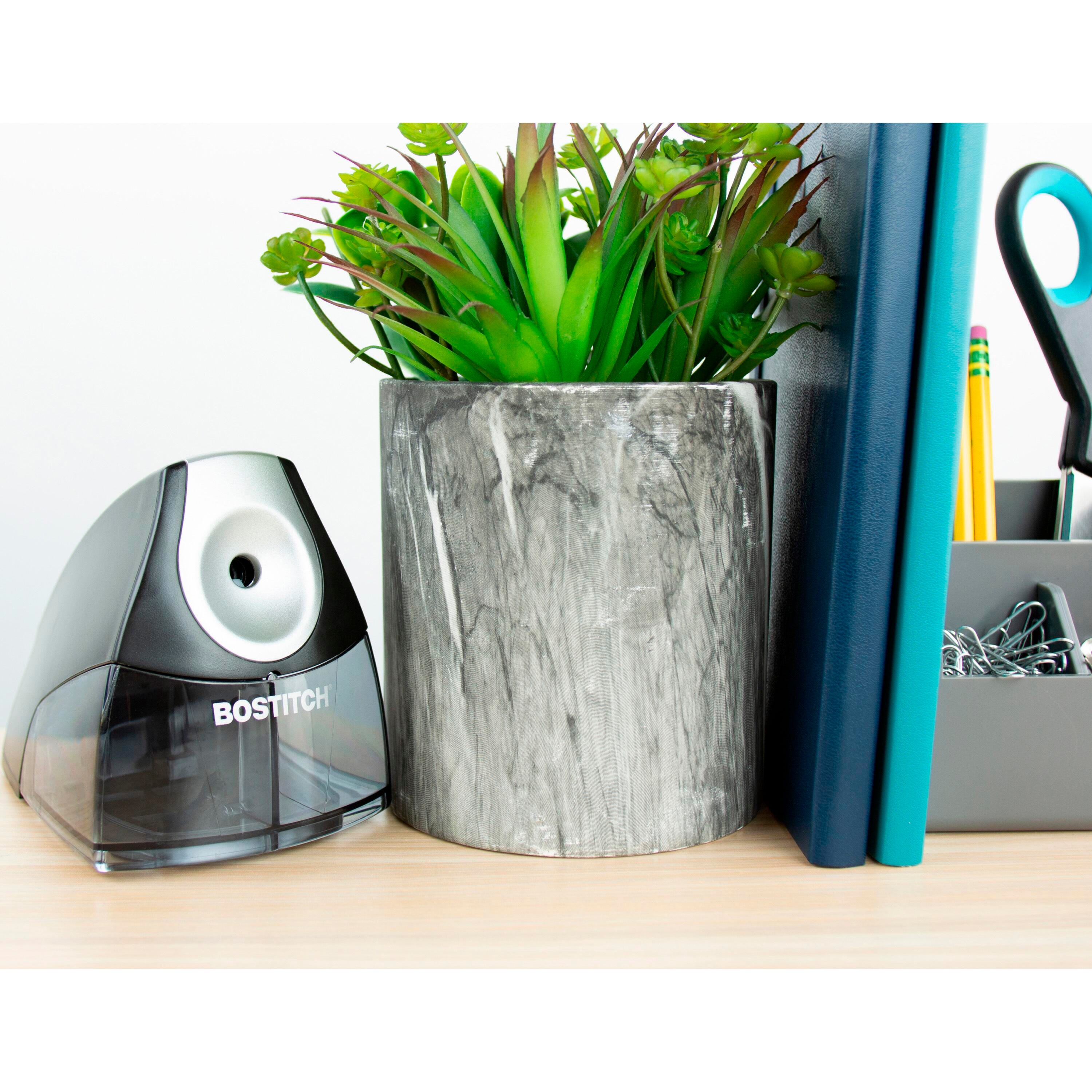 The Personal Electric Pencil Sharpener from Bostitch features Auto-Stop which helps preserve pencil life while preventing over sharpening. Thermal overload shut off avoids motor damage and safety stop switch prevents operation when shavings tray is removed. Hardened steel helical cutting blades ensure consistent long-life performance, while its sleek design makes it a handsome addition to any home office. Black and silver. Measures 5 x 3-1/2 x 4 inches. Comes with 7-Year Limited Warranty.Features