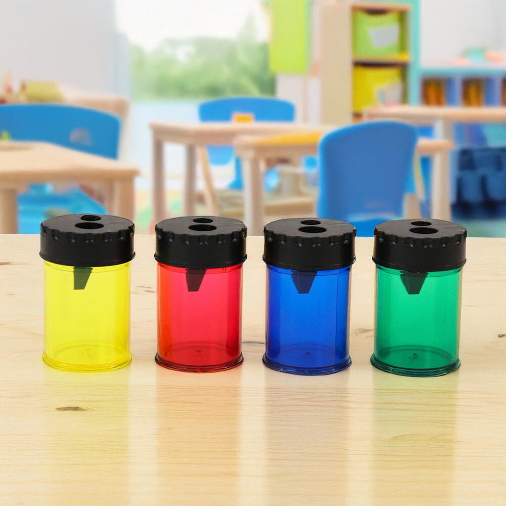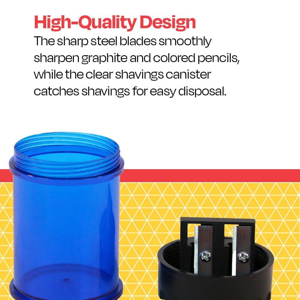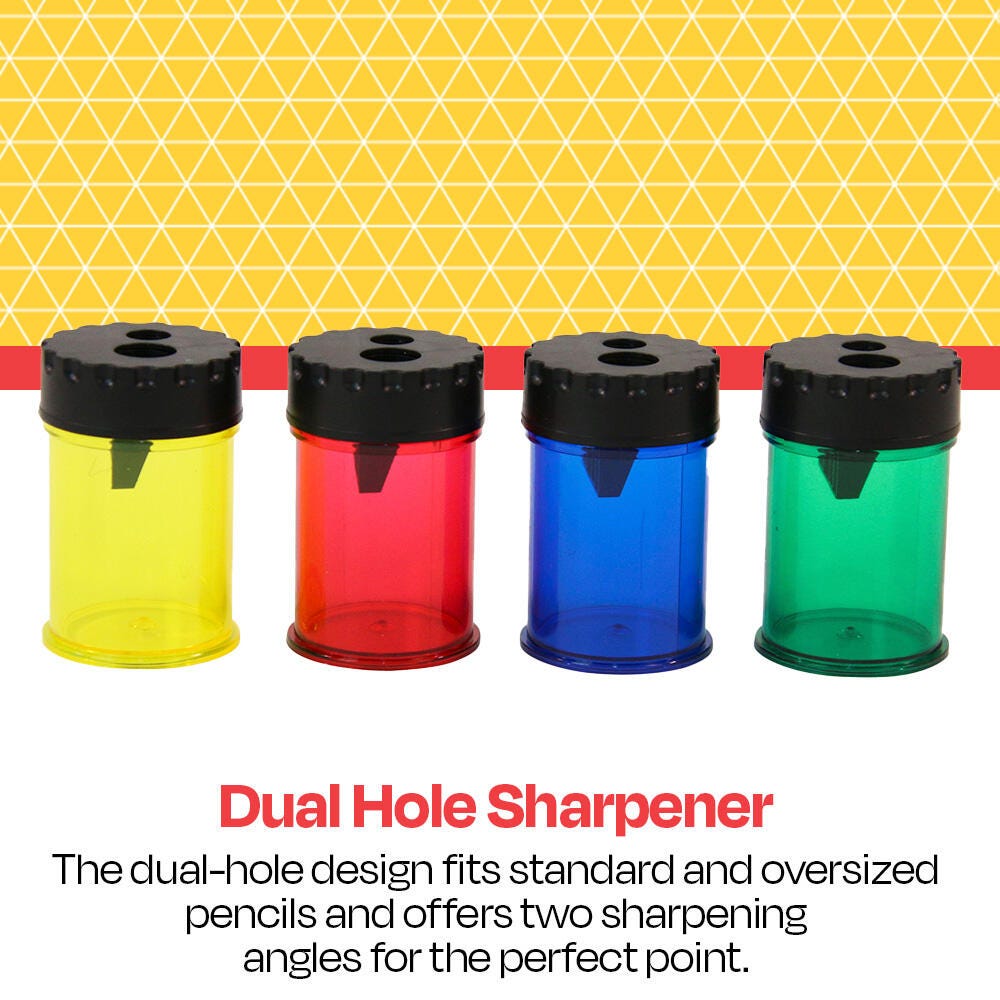 Description This handheld pencil sharpener from School Smart features a dual-hole design, making it ideal for use with a wide variety of graphite and colored pencils. The two sharpening holes offer different sizes and different sharpening angles to best fit your needs. The conveniently translucent shavings receptacle makes it easy to see when it is full and simply twists off to be emptied. Sold individually in Red, Blue, Yellow, and Green. Sorry, no color choice.Features Precisely sharpens graphite and colored pencils Compact design makes it highly portable and easy to store Clear shaving canister gives an easy view of its contents Steel blades for a sharp point Dual-hole design provides two sharpening angles that ensure your pencils are sharpened to the perfect point Includes: 1 Dual Hole Pencil Sharpener